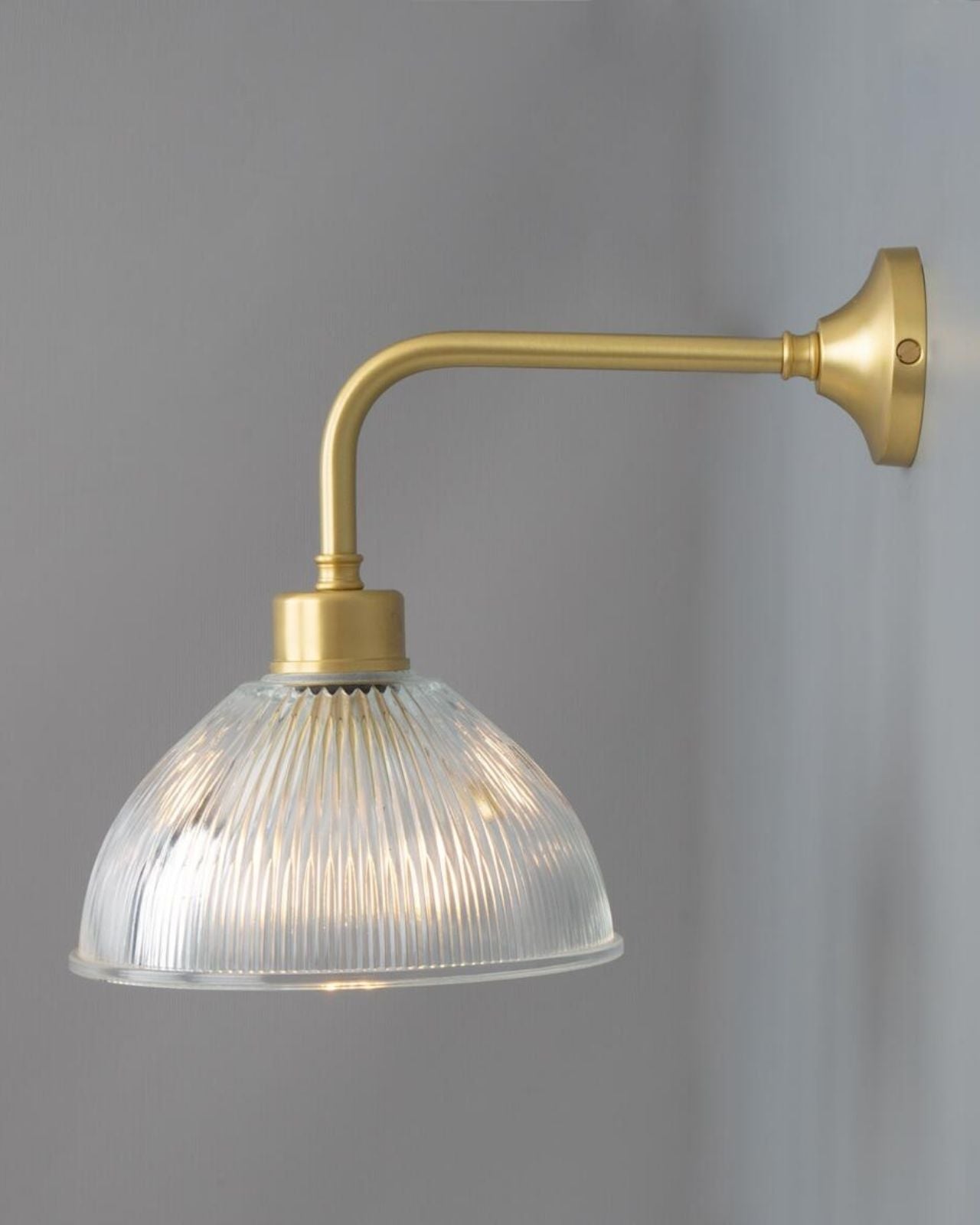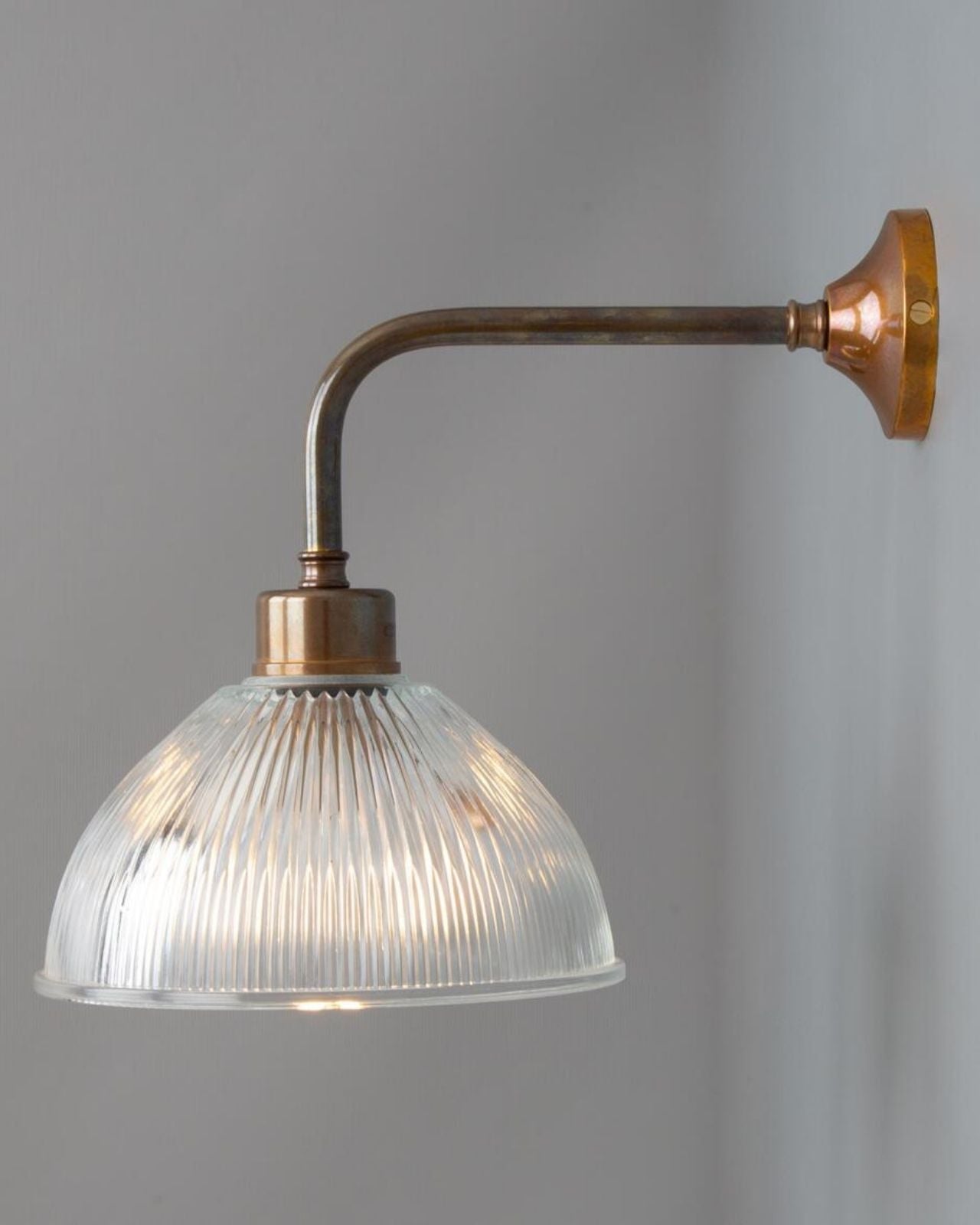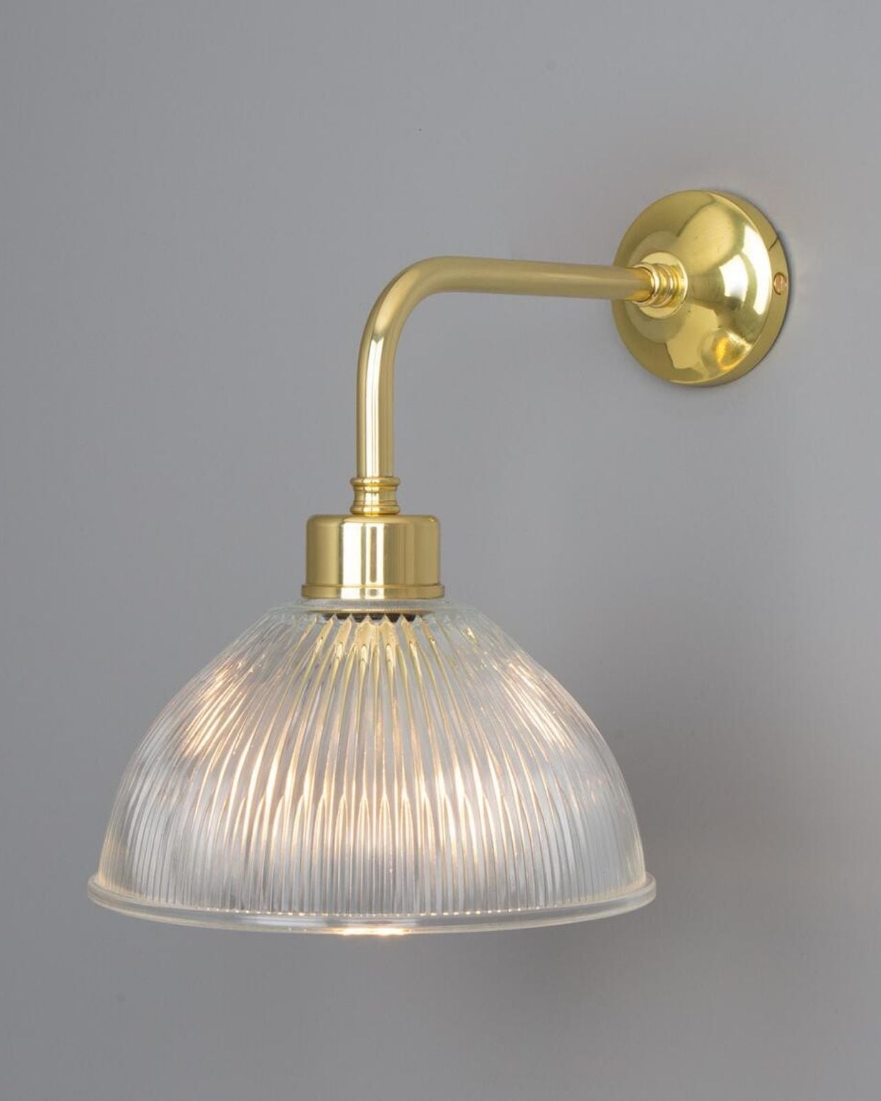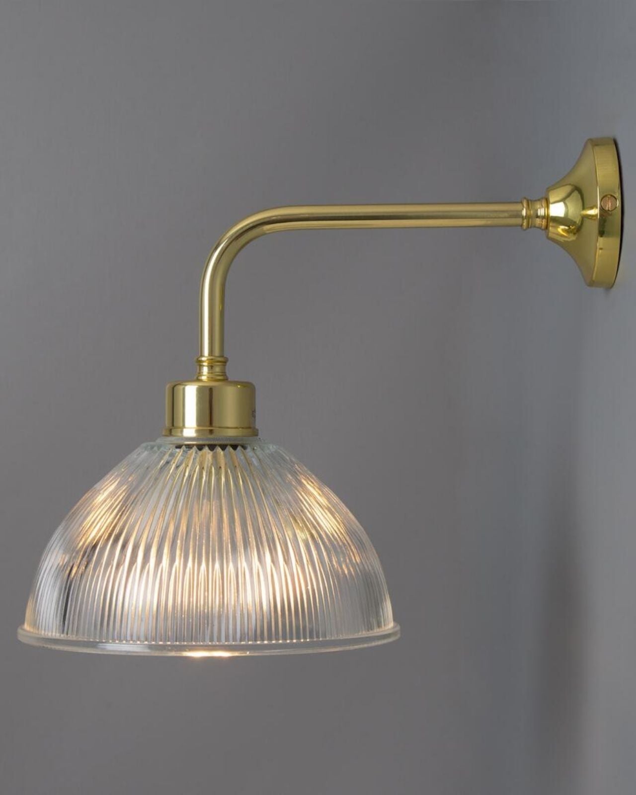 The Holophane Glass Wall Light features a classic prismatic shade paired with a simple metal arm and wall plate, blending vintage charm with functional design. Available in a variety of finishes, the industrial-inspired aesthetic is ideal for use in hallways, kitchens, or beside mirrors, where the Holophane glass perfectly diffuses light to provide an even, glare-free glow.