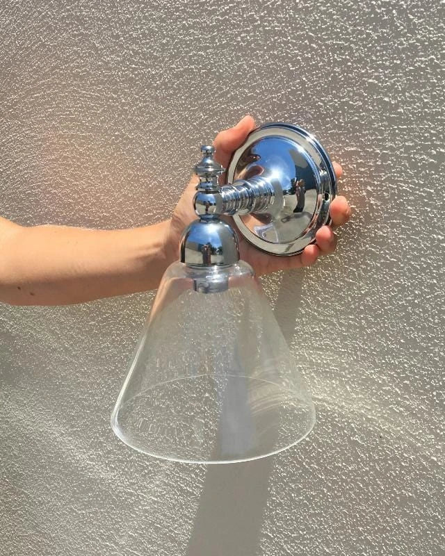 Wall-mounted light fixture with clear glass shade and chrome finish on a white background