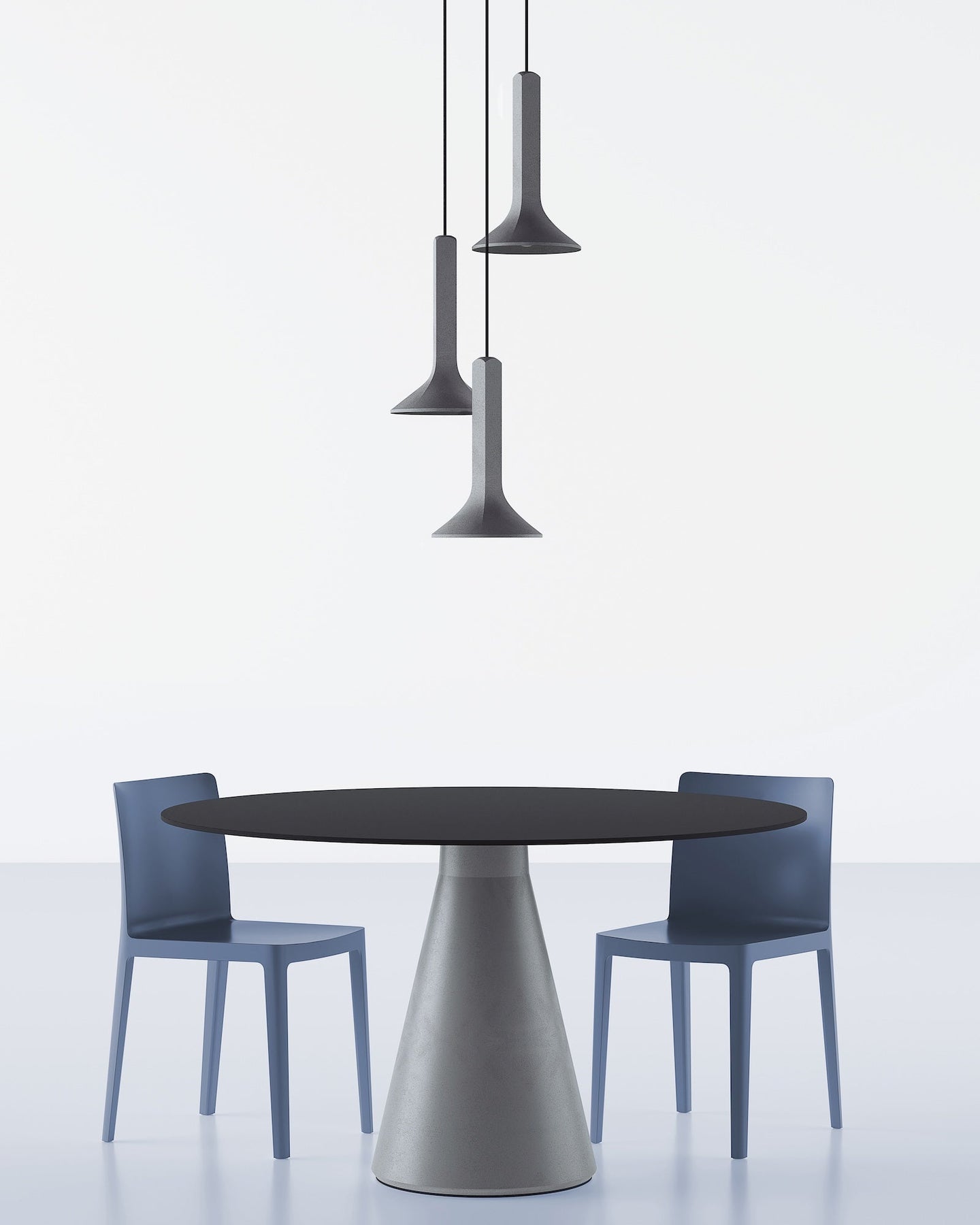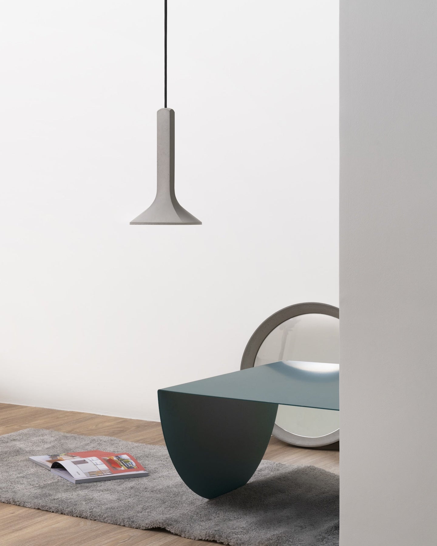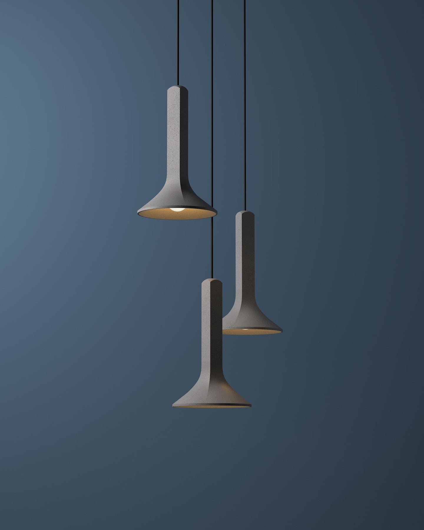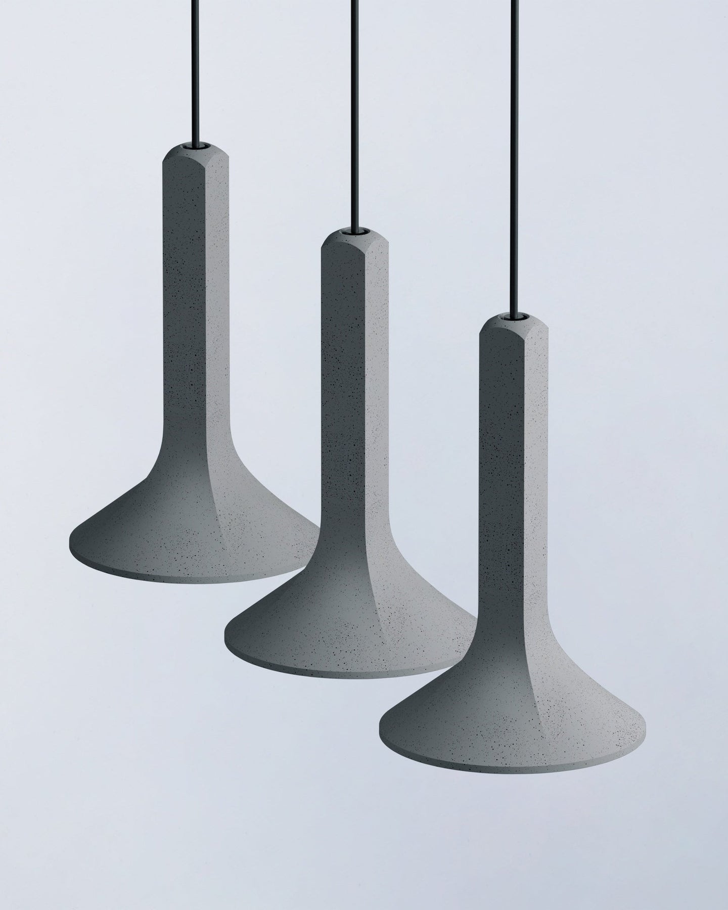 Crafted from recycled and new concrete this brutalist-styled pendant seamlessly transitions a square body into a round shade. This smooth yet rigid concrete design is suitable for residential and commercial interiors, suspended as a singular pendant or grouped as a cluster. This pendant provides warm downlight and is supplied with a warm white E14 globe.