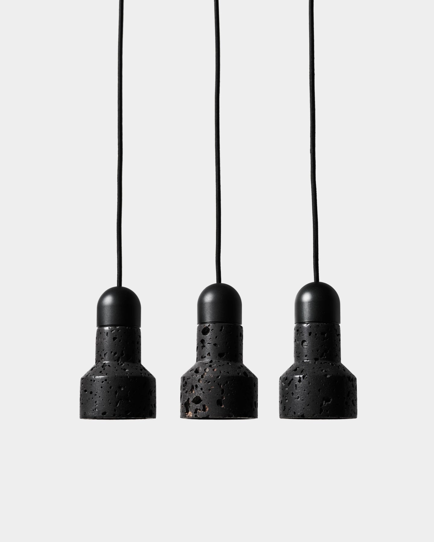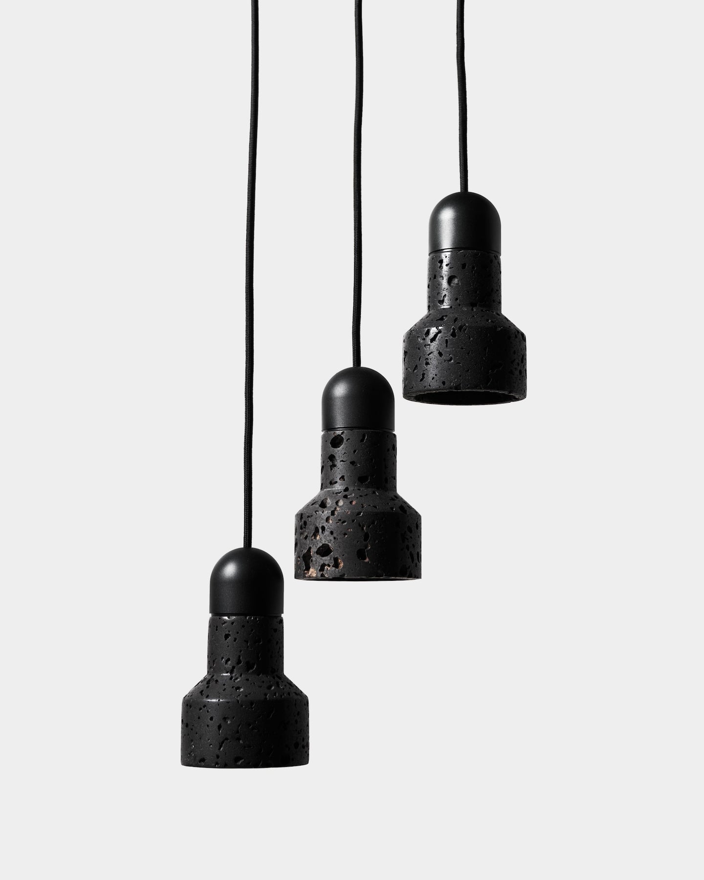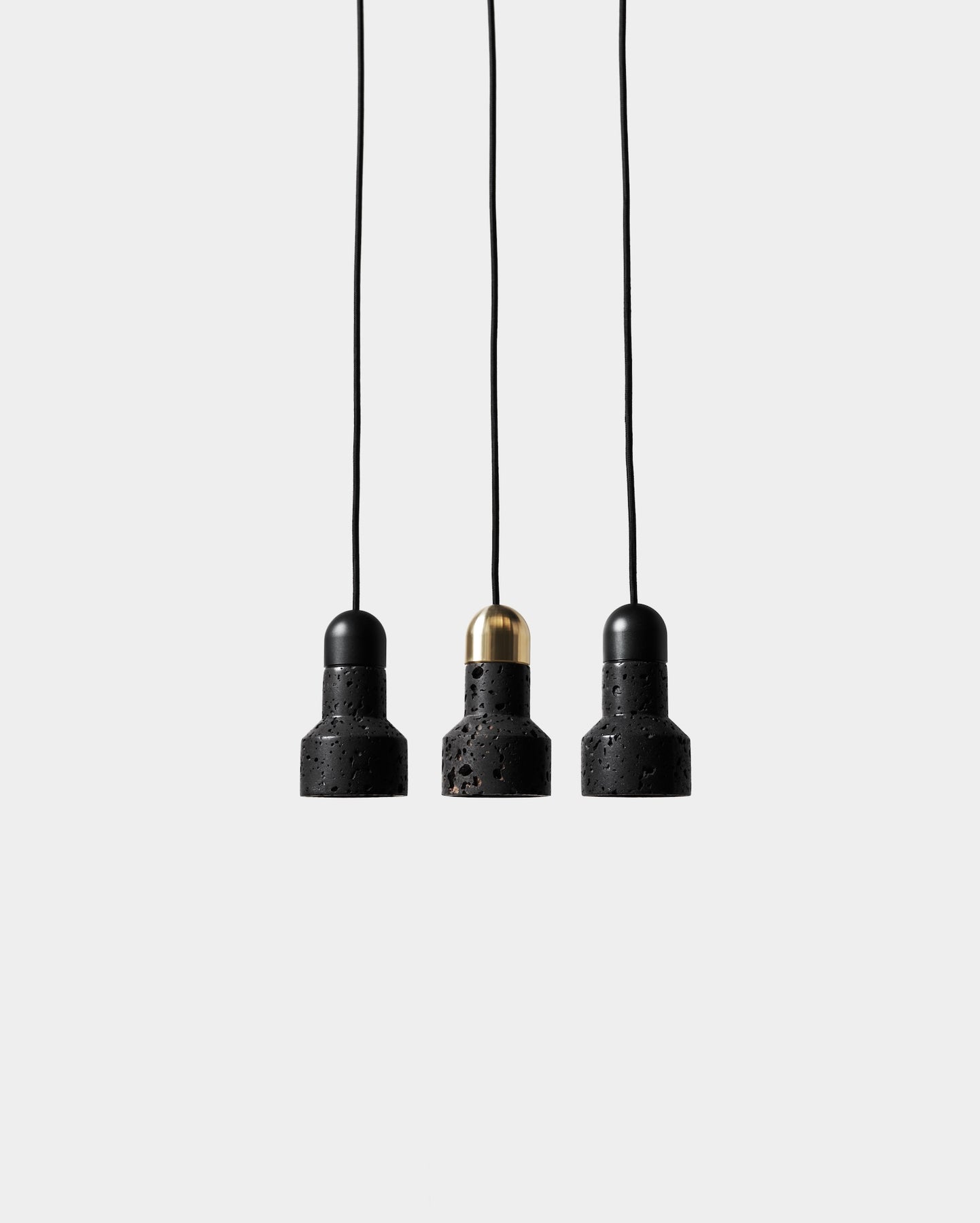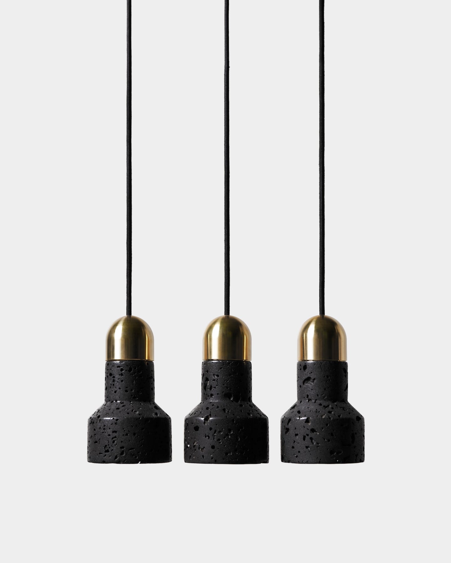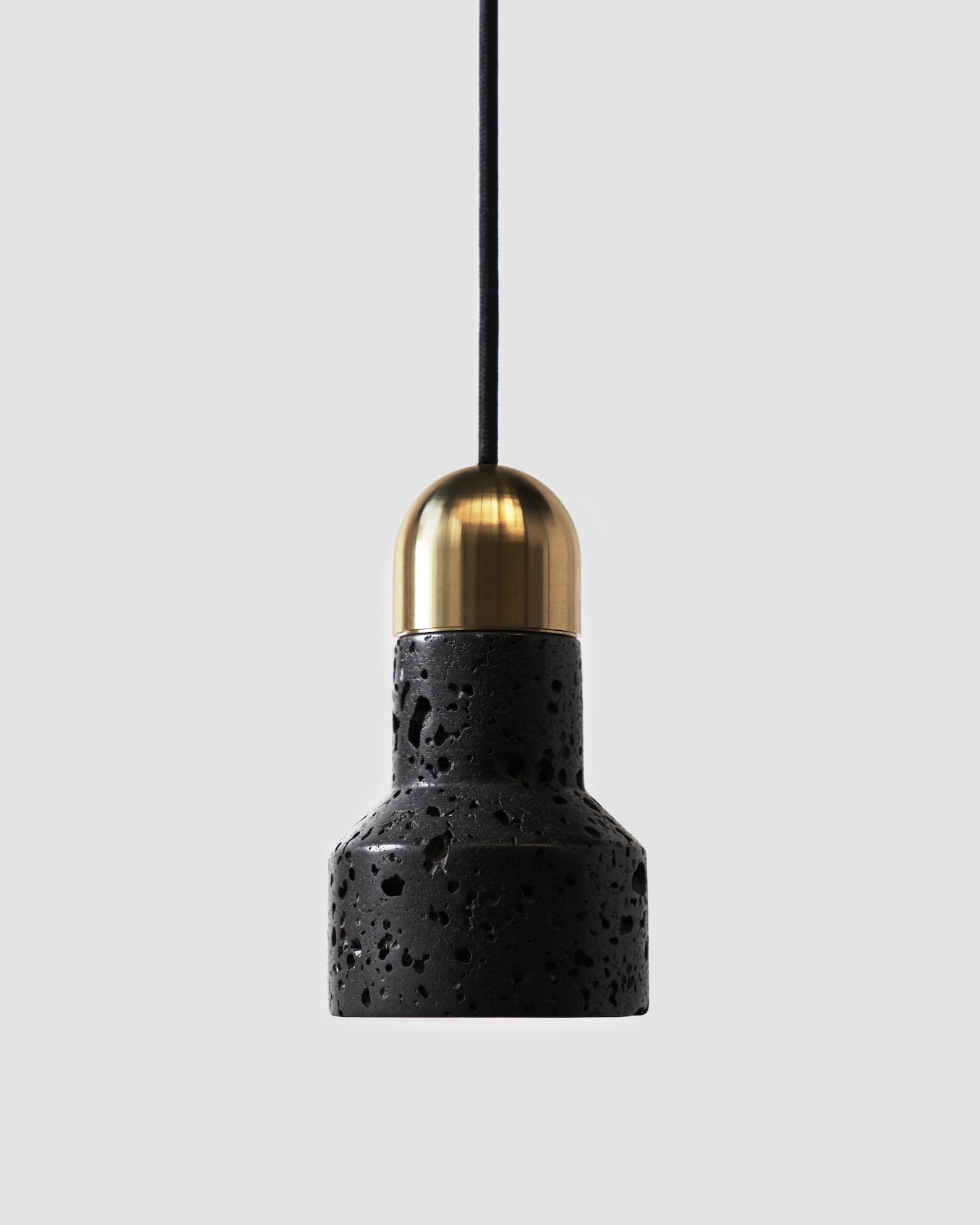 The Qie Lava Stone Pendant focuses on meticulous craftsmanship and geometry, resulting in this fitting's symmetry and balanced proportions. Available with a Brass or Black apex, and with black lava stone, this pendant is a bold statement that can be installed in clusters or individually. Use this piece in Brutalist or Contemporary inspired spaces for a sleek focal piece.