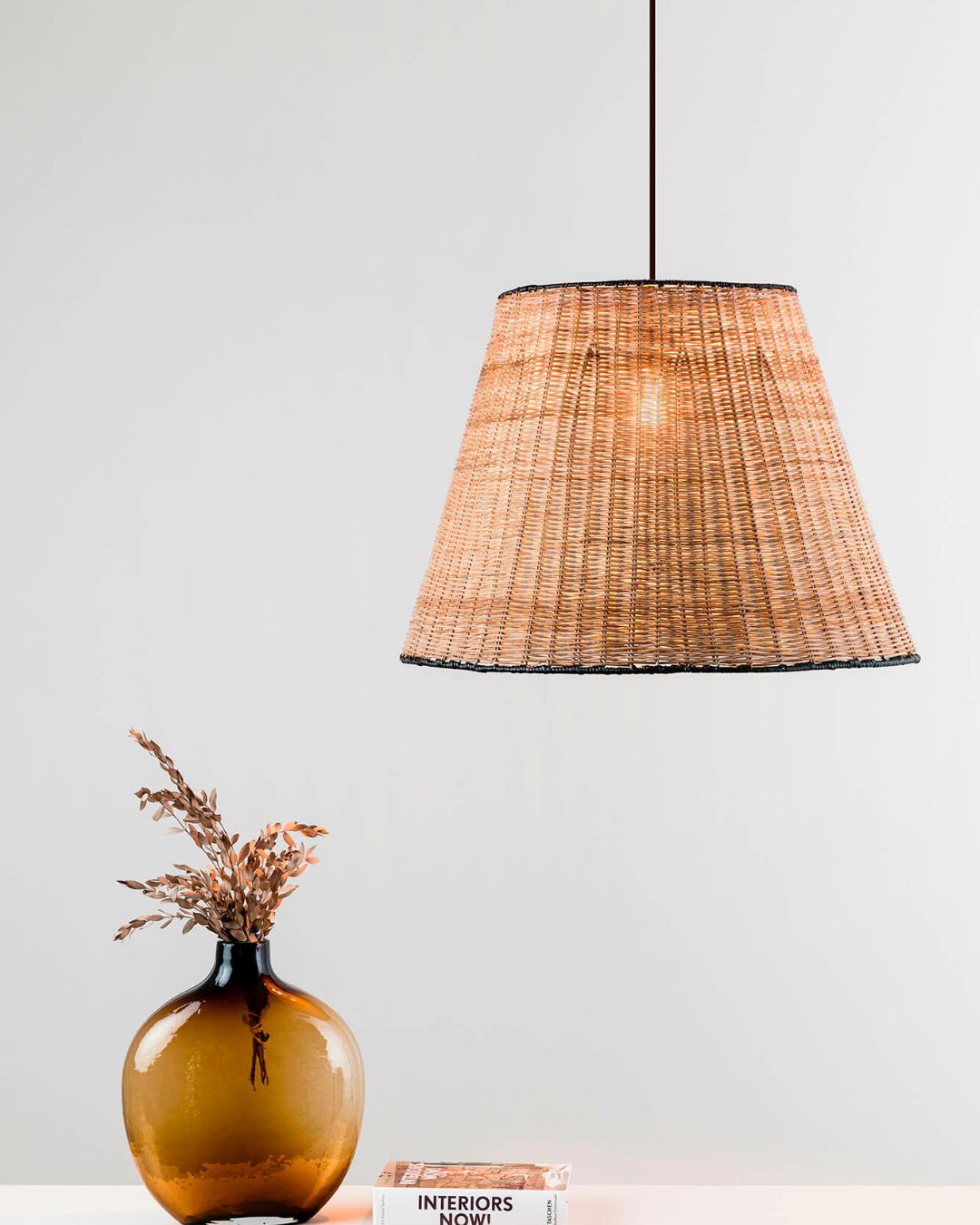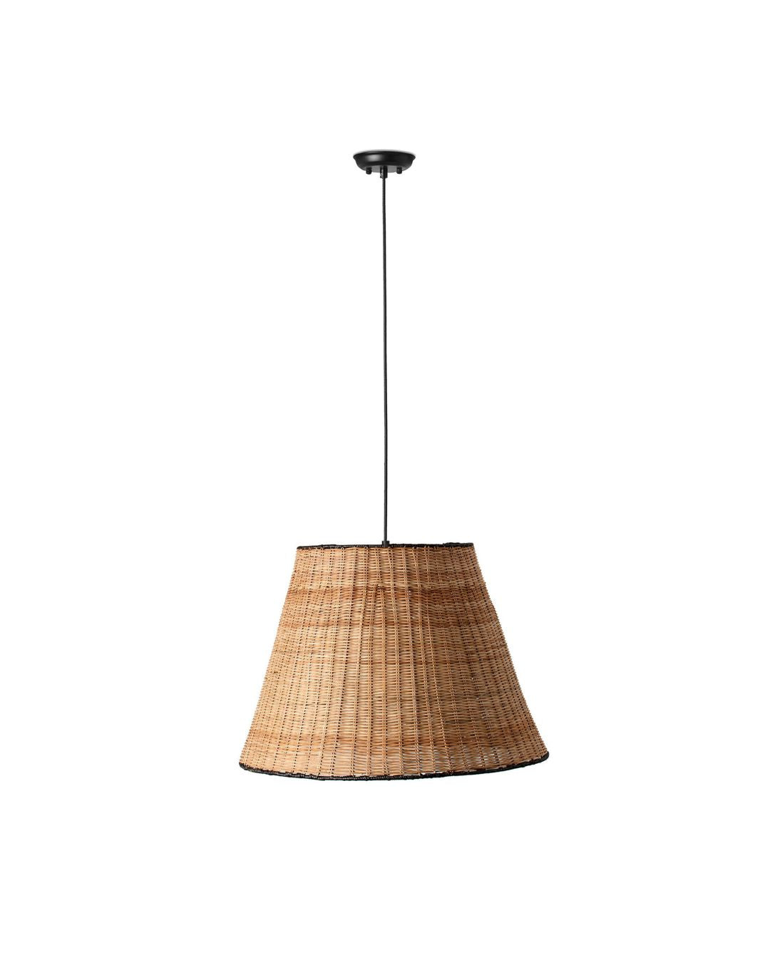 Handmade in Spain, this pendant light features a wide shade made from rattan and will suit a range of interior-styled spaces. The natural fibres combined with subtle elegant black detailing will provide a coastal touch suited for suspension over a dining table or in a modern living room. To be paired with an E27 (not included).