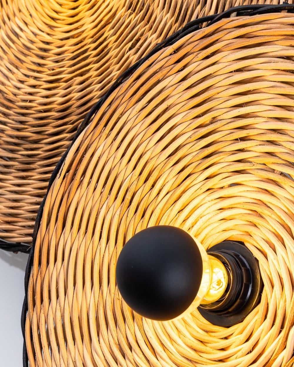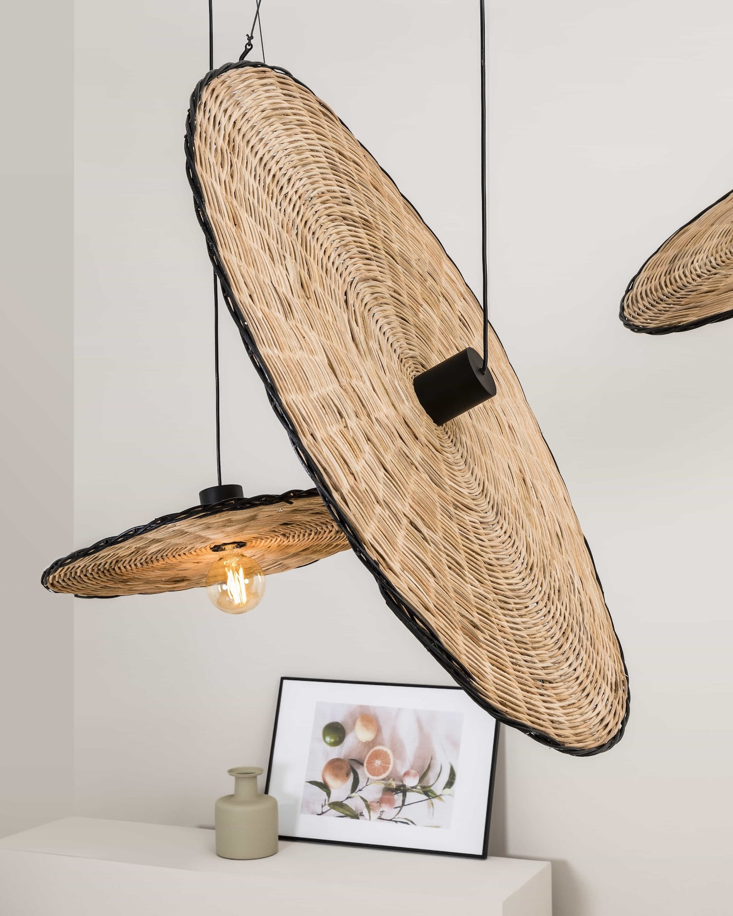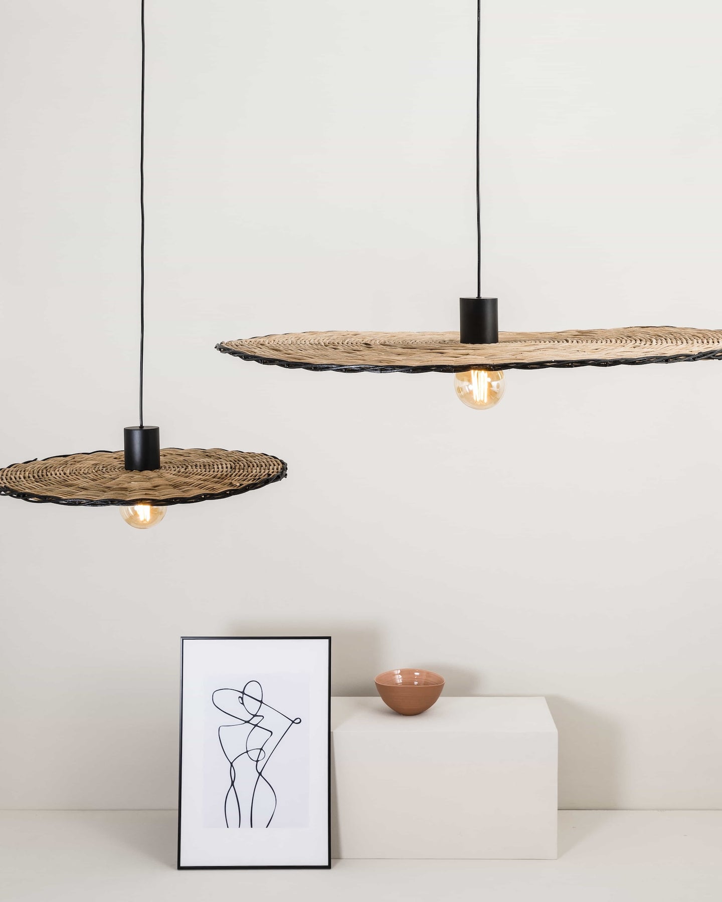Designed and handmade with natural fibres, this rattan disc pendant light is a perfect mix between a Mediterranean style and minimalism and will stand out over a dining table or in a living room. The Mediterranean Rattan Disc Pendant Light features a round disc shade available in two sizes and will bring warmth as well as elegance to any interior space due to its subtle black detail.
