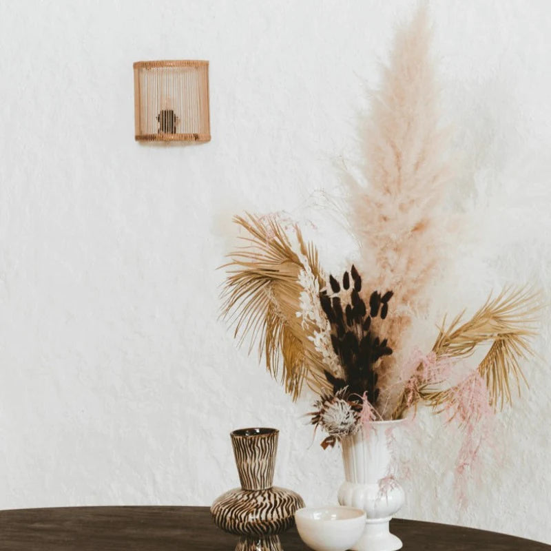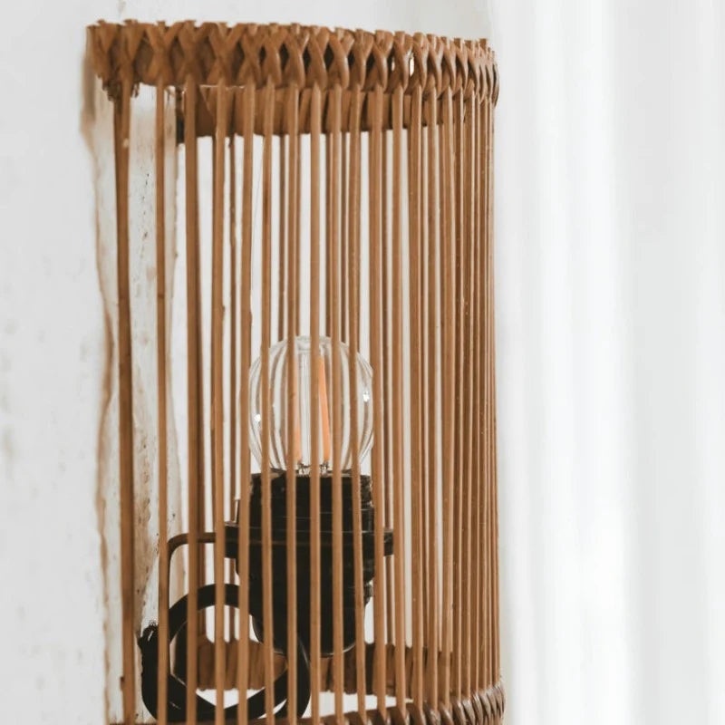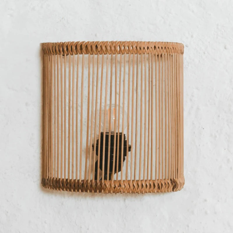 This single light wall sconce is carefully crafted from natural rattan. Characterised by its simplistic yet organic form this design provides indirect patterned illumination suited for bedrooms, hallways and living spaces. With a natural finish, this wall light will blend perfectly into coastal, minimalistic and bohemian-styled interiors.