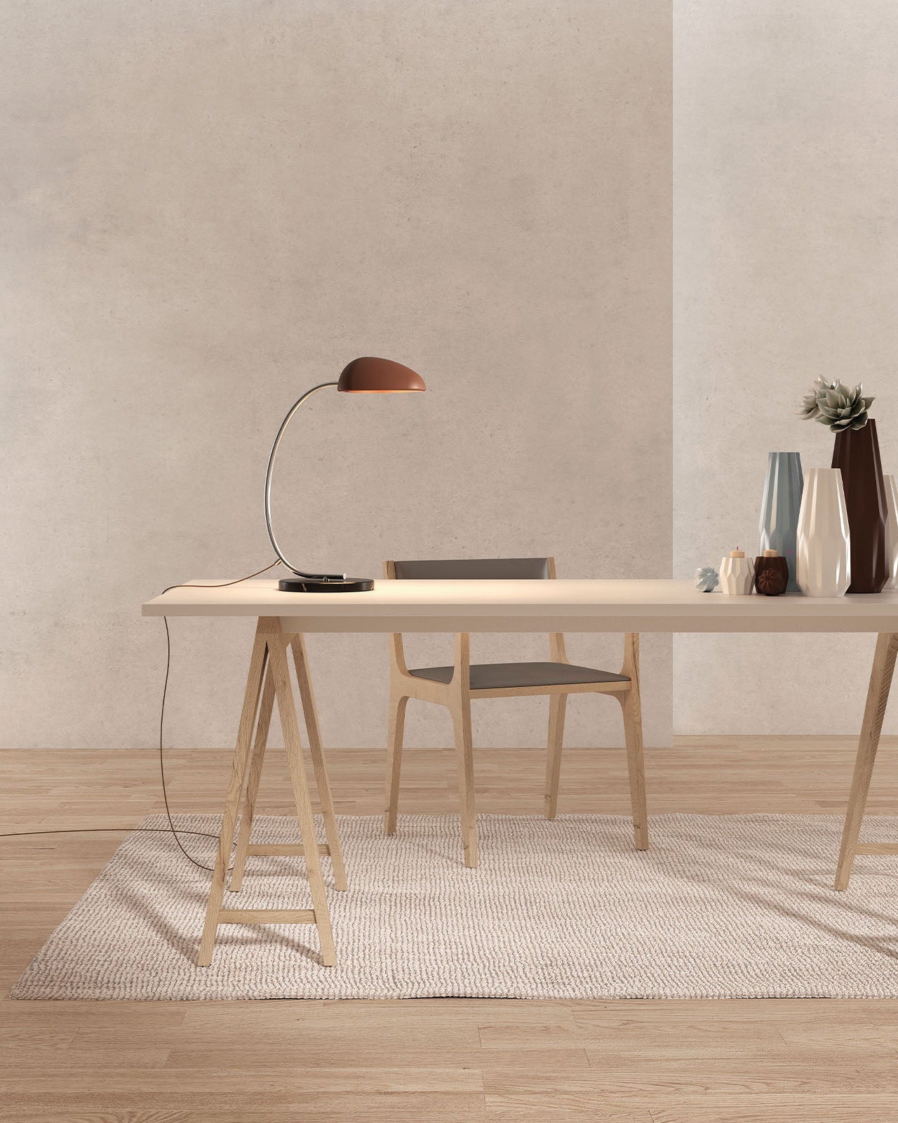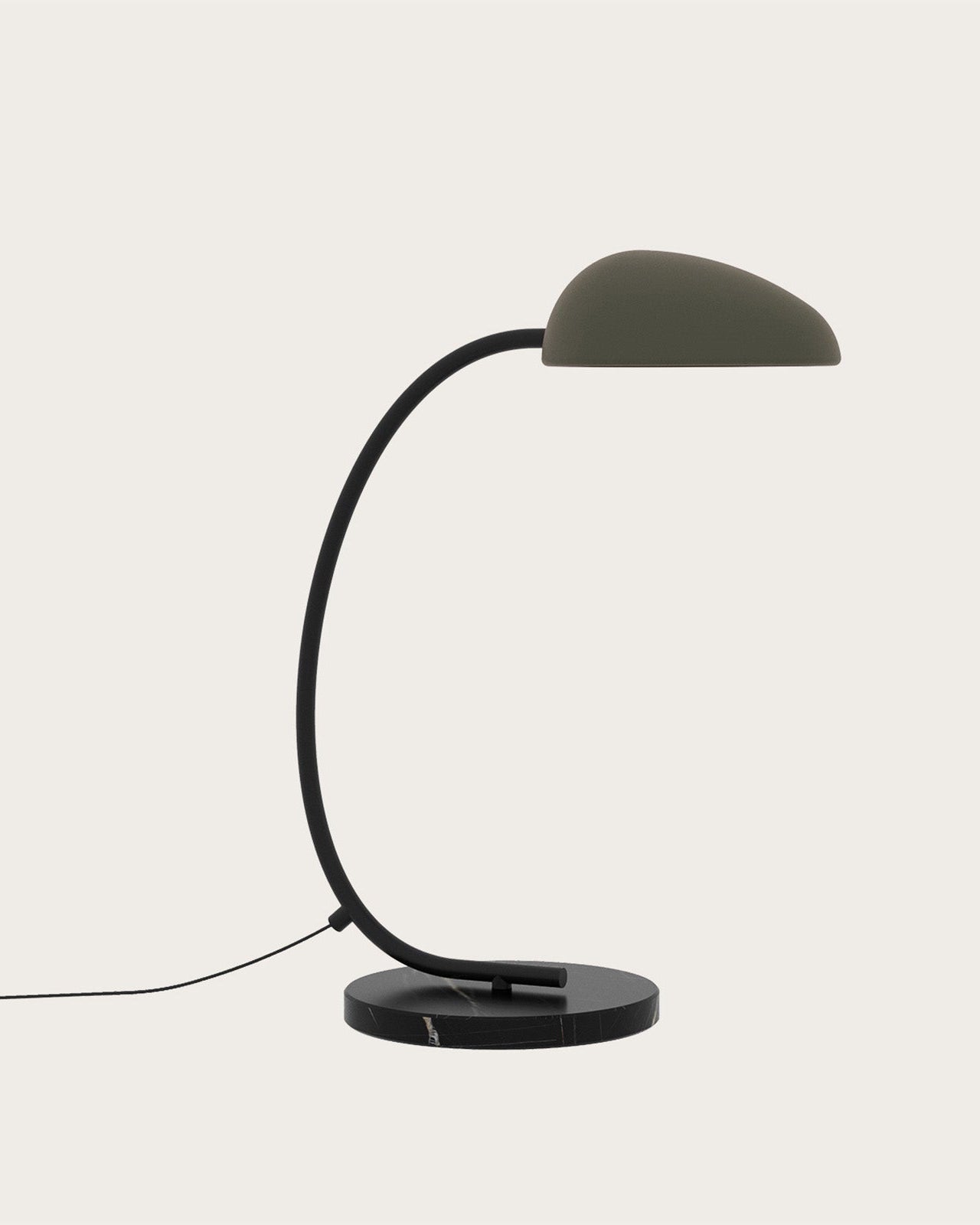 Designed in Spain, the Curved Indirect Table Lamp casts a soft, ambient glow, creating a warm and inviting atmosphere into modern spaces seeking a touch of sophistication. This fixture features a smoothly curved shade that provides indirect light enhanced by sleek design, clean lines and a minimalist aesthetic with a variety of finishes available for selection.