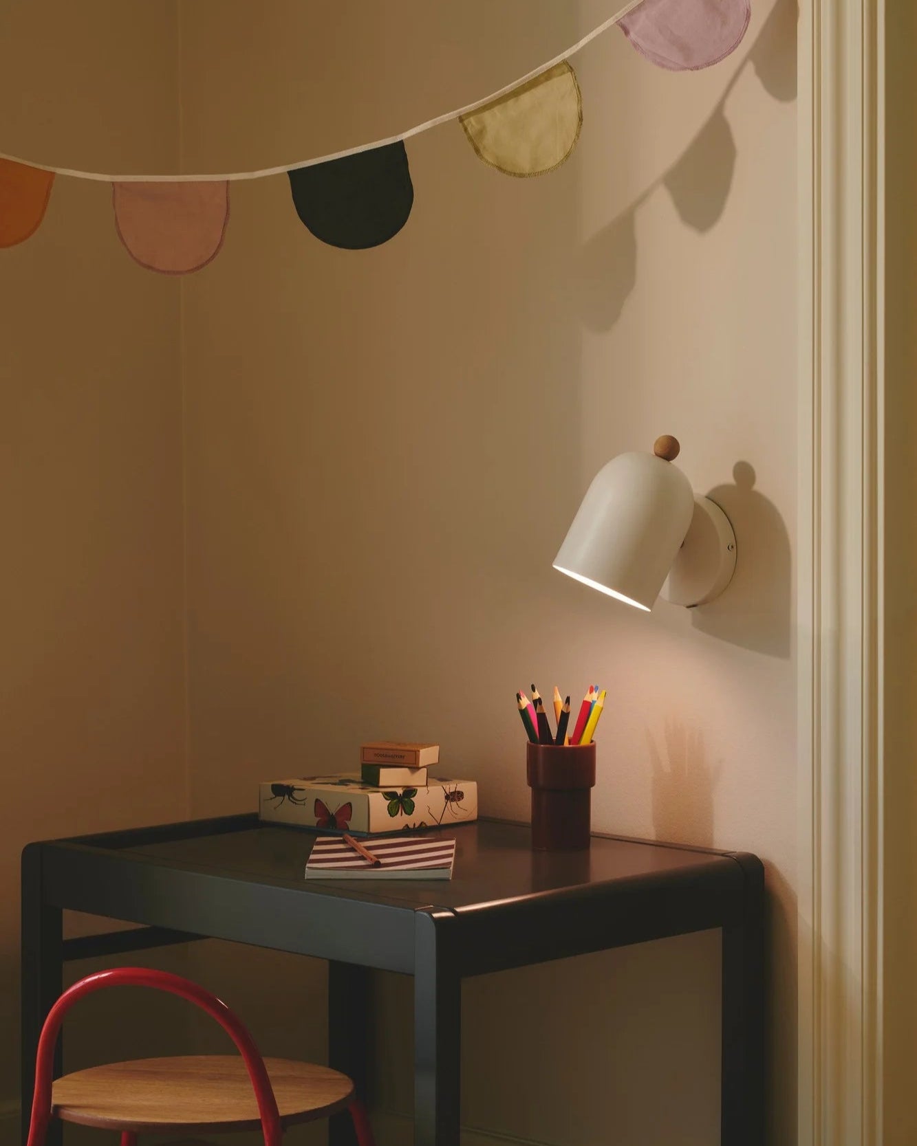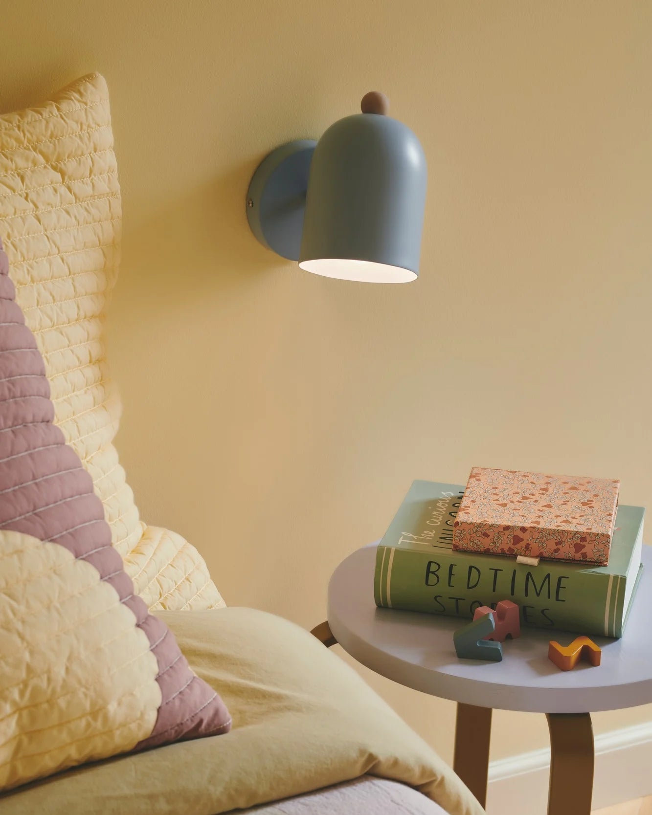 Designed in Denmark, the Pastel Nordic Adjustable Wall Light is a streamlined wall lamp available in cute, muted tones. This design features a rounded shade with a small wooden detail on top of the shade. This fixture will add a beautiful touch to any nursery or children’s room with a flexible shade that allows for directional light.
