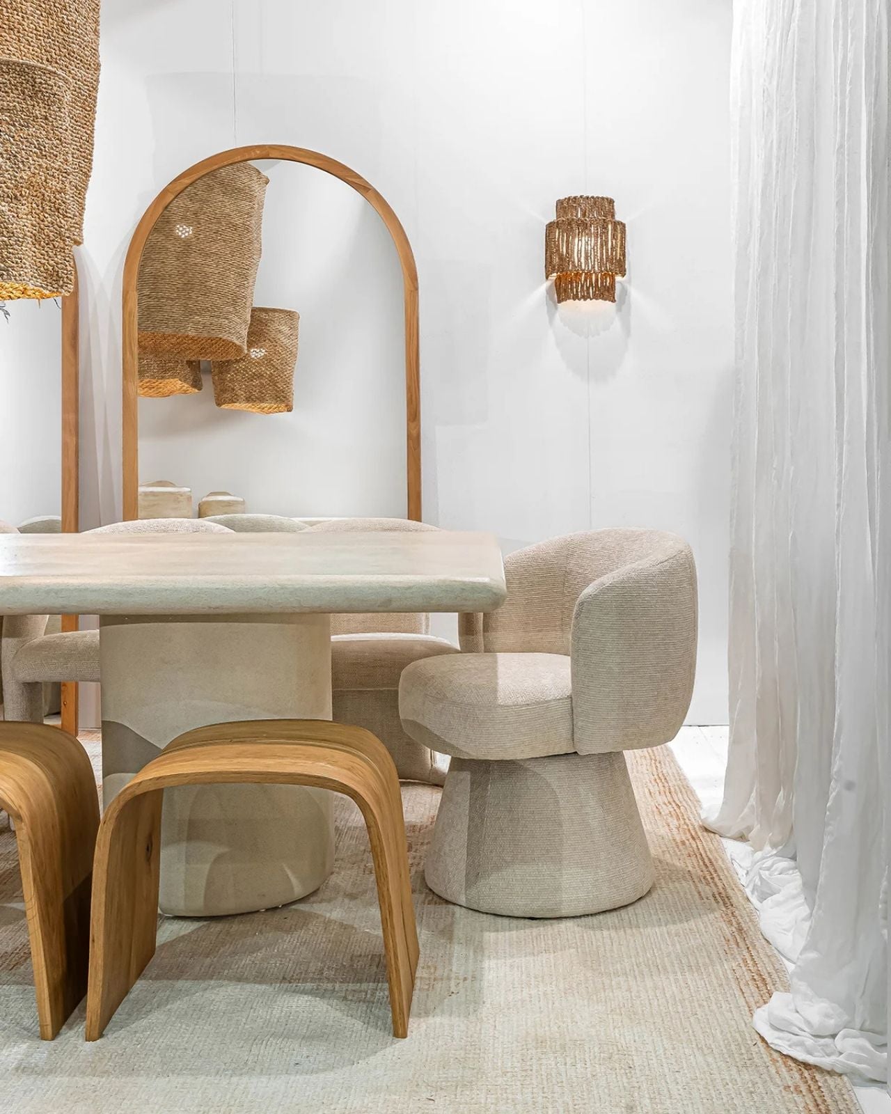 Modern dining area with a white round table and wooden chairs, featuring a rattan teardrop pendant