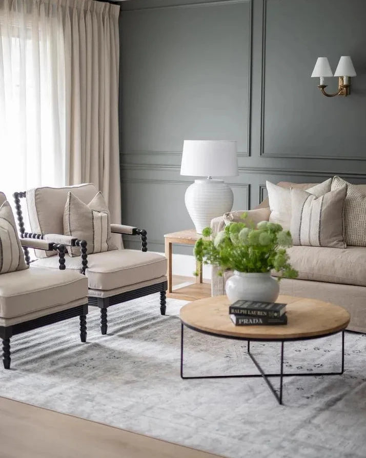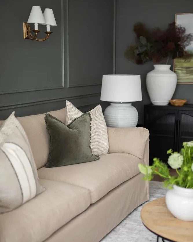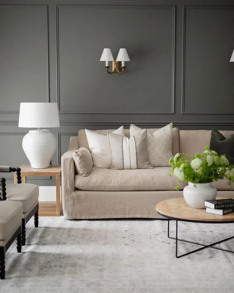 Living room with gray walls, beige furniture, and a classic glazed ceramic table lamp