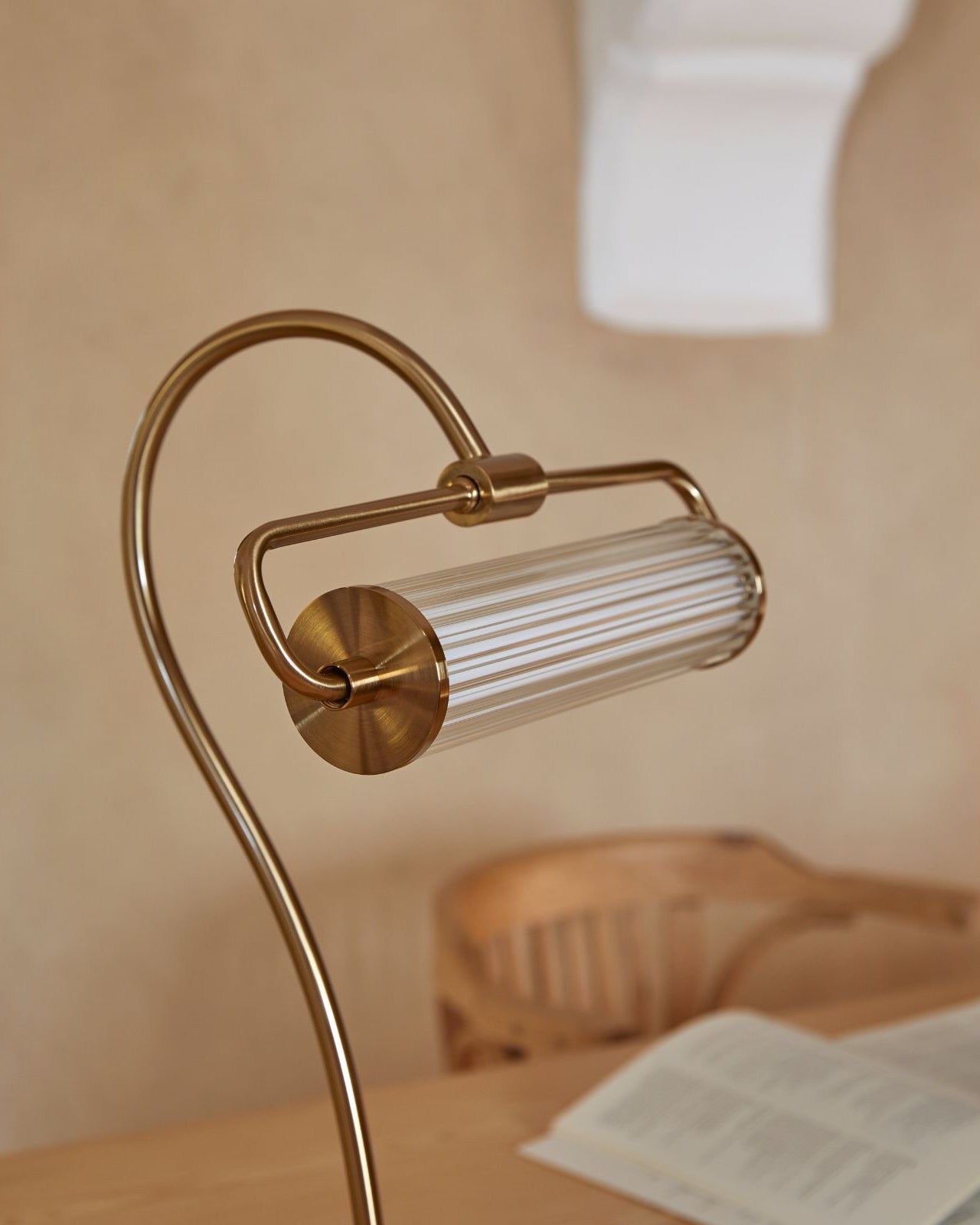 Gold desk lamp on a wooden surface with an open book in the background.