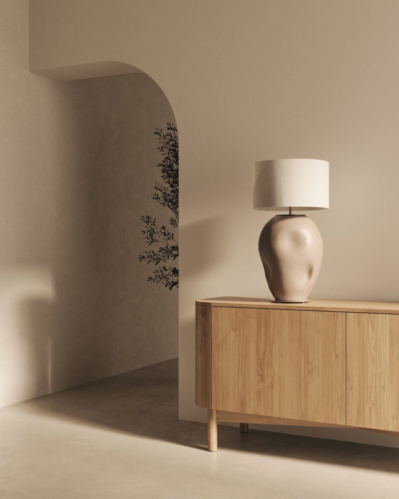 Expertly crafted, this table lamp captures attention with its large, rounded ceramic form. Its remarkable organic base with smooth indents delivers a unique tactile and visual experience, available in nude or silhouette finish. Featuring a white shade, this lamp emits a soothing glow, making it a high-end addition to any room.