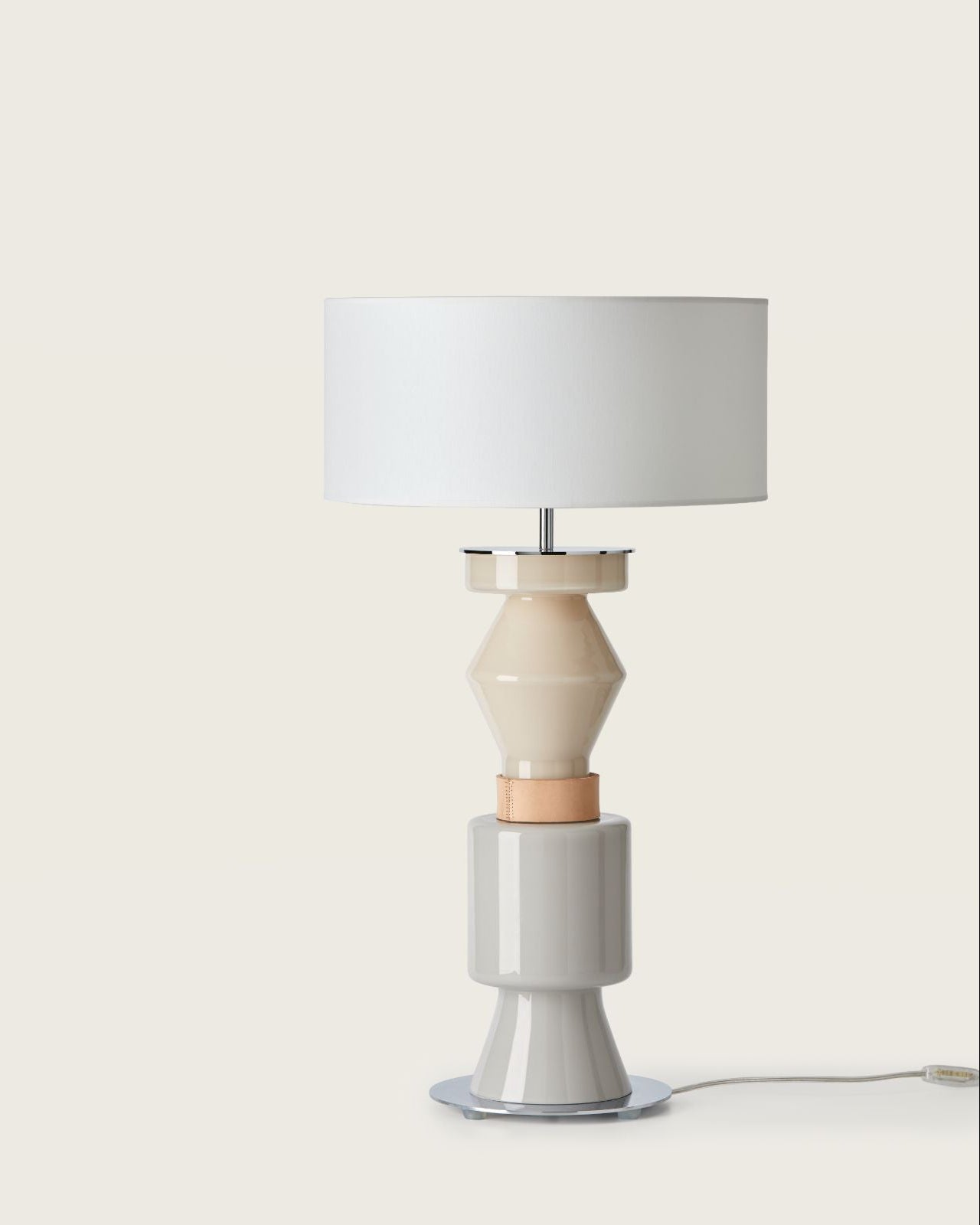 Table lamp with a white shade and beige base on a white background