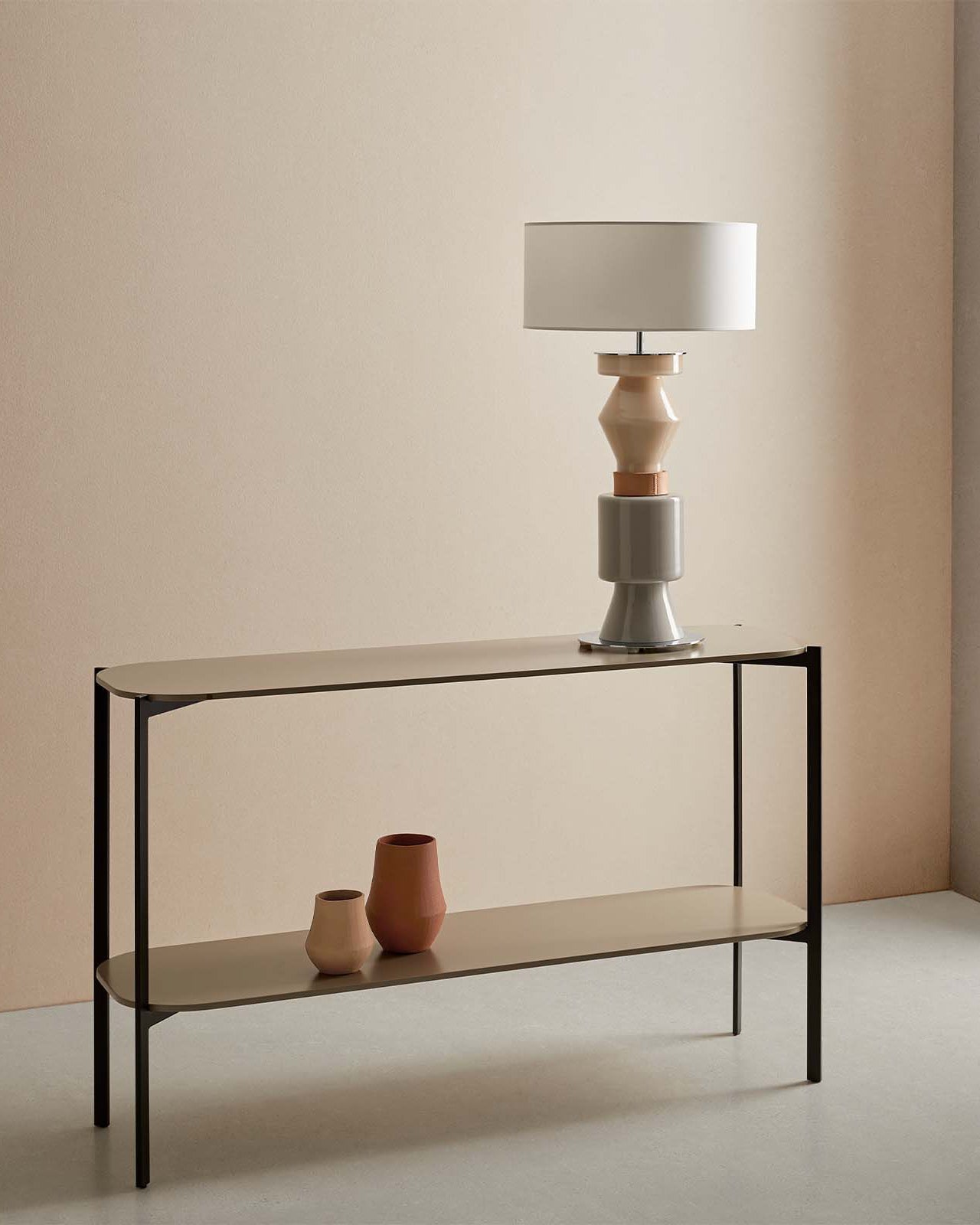 Console table with a lamp and vases against a beige wall