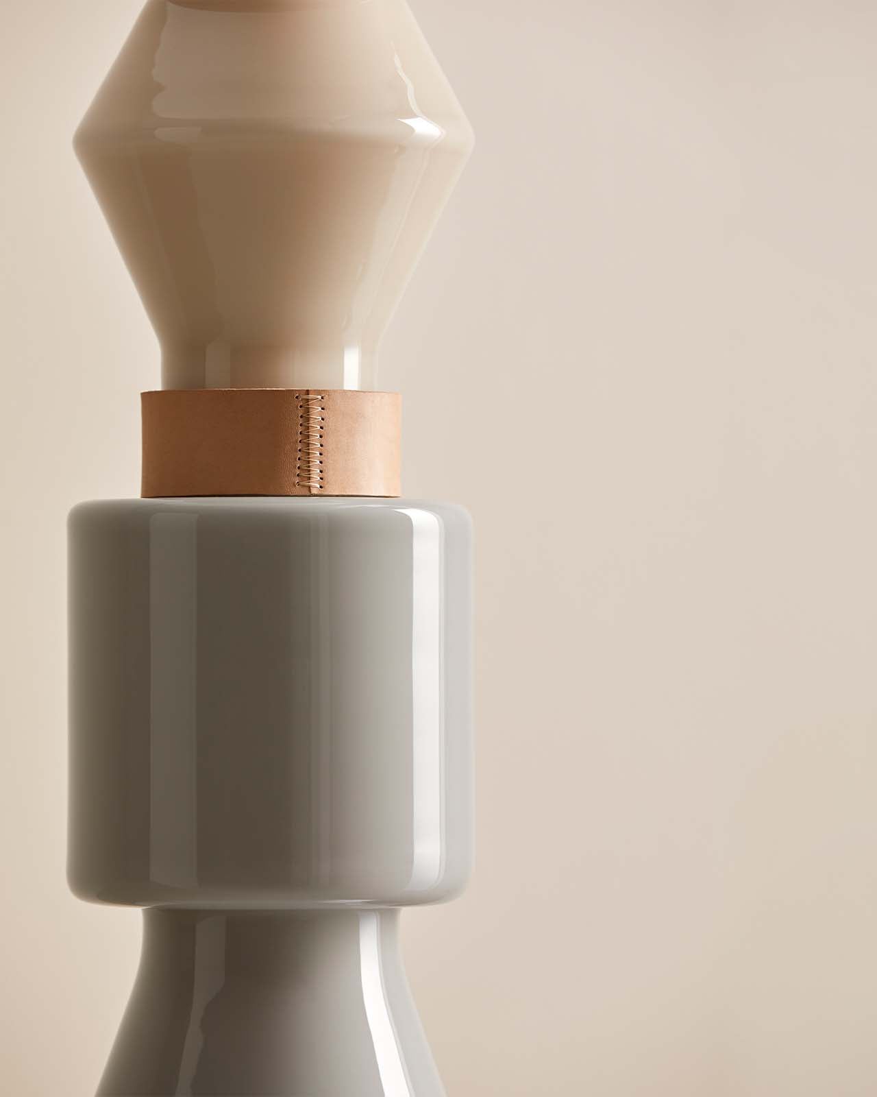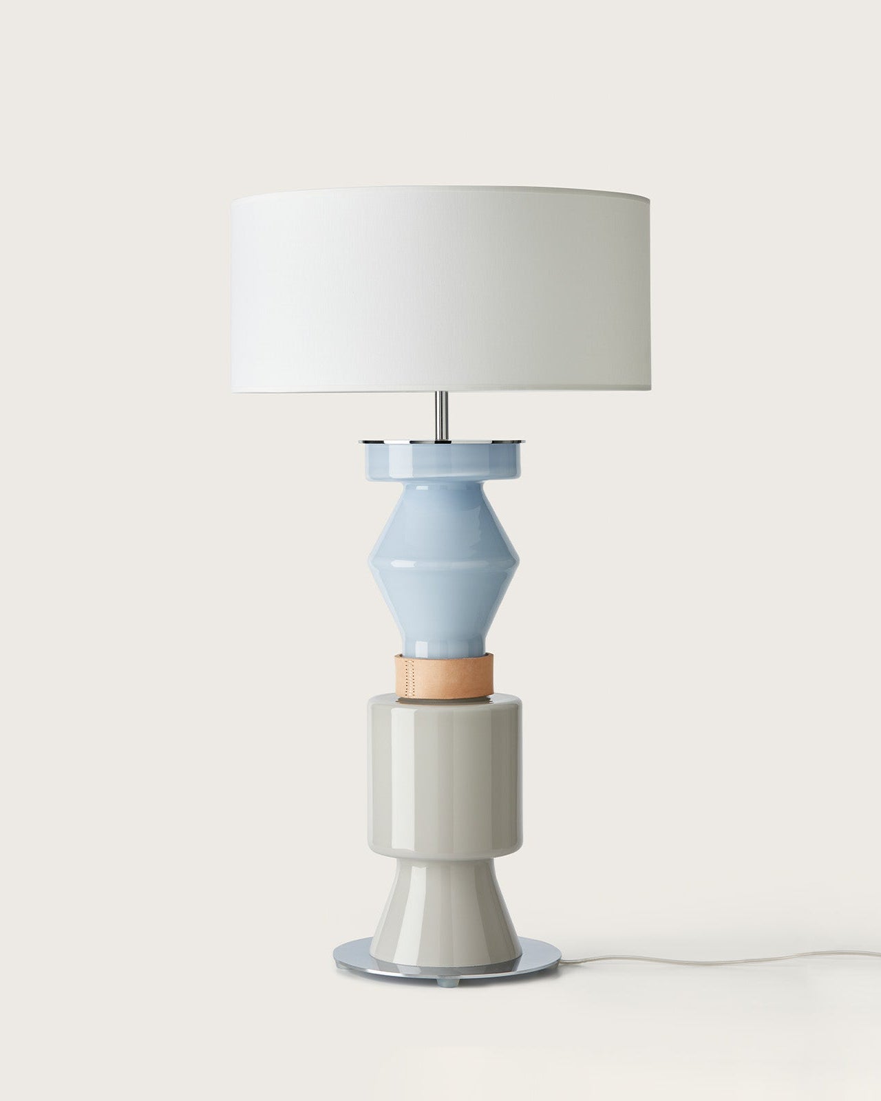 Built-in a geometric modular style and made from Glass, Leather and Steel, this Contemporary Lamp will embellish your interior spaces. Full of elegance and distinction, this design plays upon the classical lamp form combined with a creative and playful touch. This lamp will enhance bedrooms, living or dining rooms and is available in Light Blue and Canyon Clay or Silhouette and Ash Grey finish.