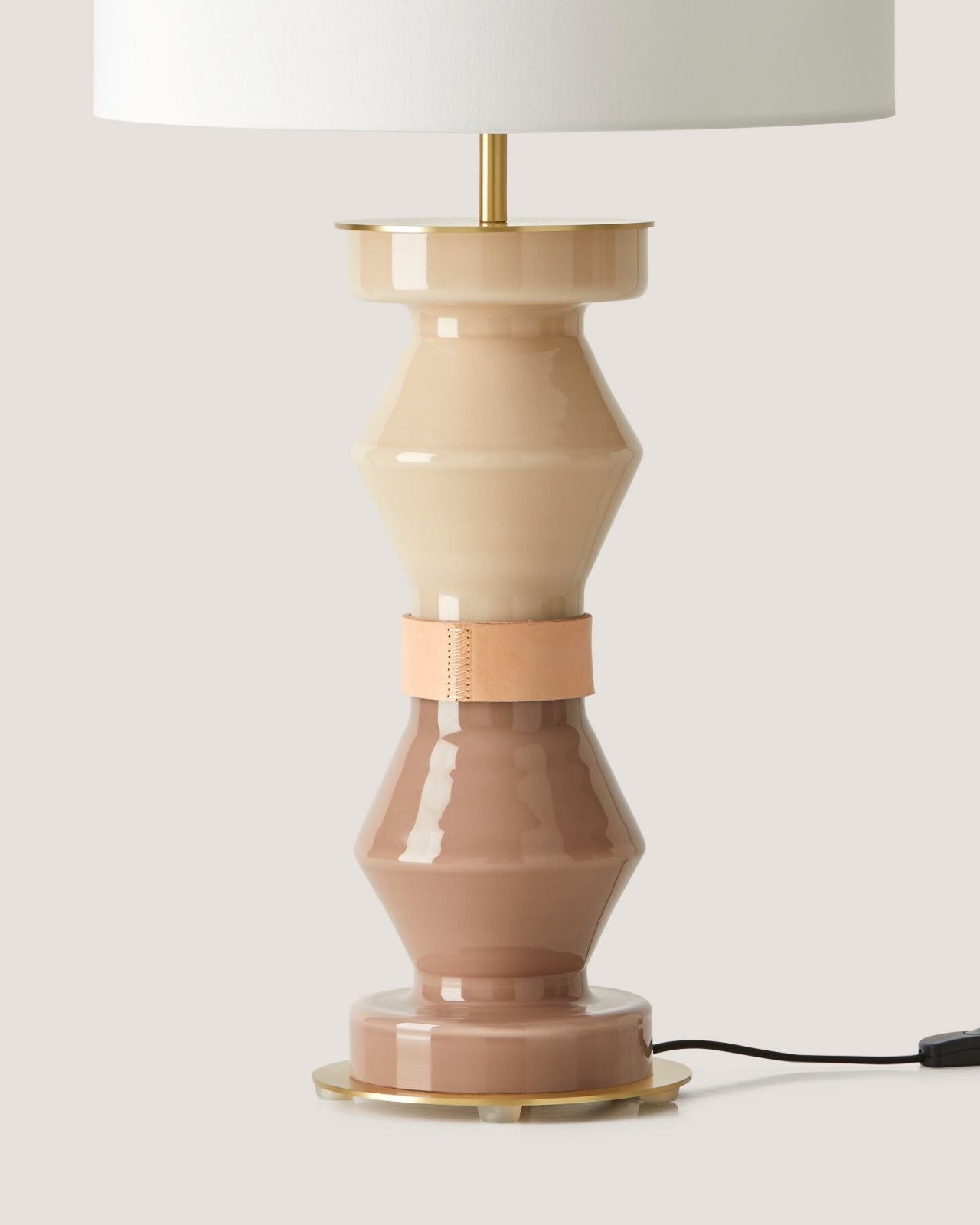 With a base composed of mixed forms visually separated by a natural leather ornamentation, this lamp is made from high-quality glass which has been lacquered painted in pleasant muted colours. This light is a creative and original object and will become the perfect protagonist in any contemporary or modern interior space. Two finishes are available, Matt Brass, Taupe and Canyon Clay or Matt Brass, Silhouette and Vintage Brown.