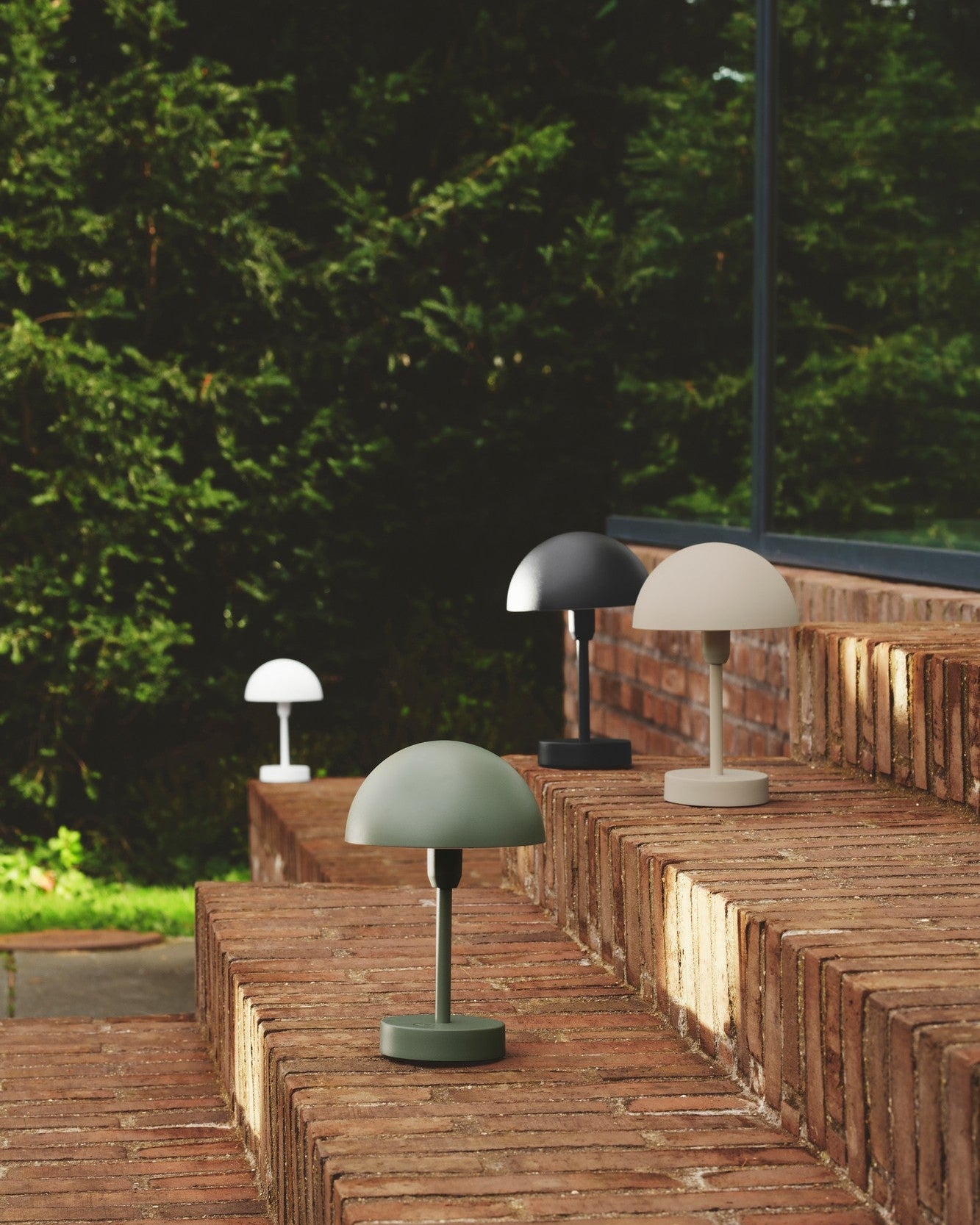Set of modern table lamps on a wooden deck with greenery in the background
