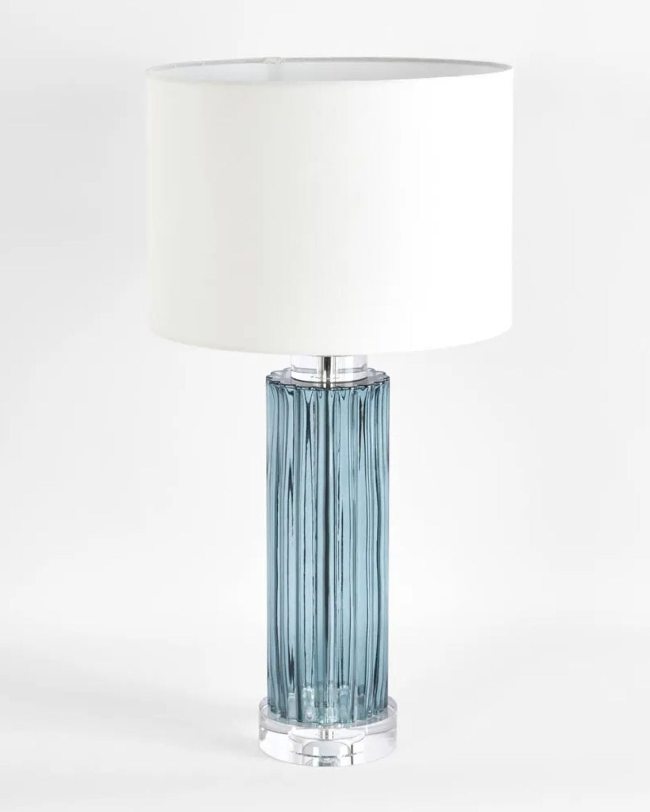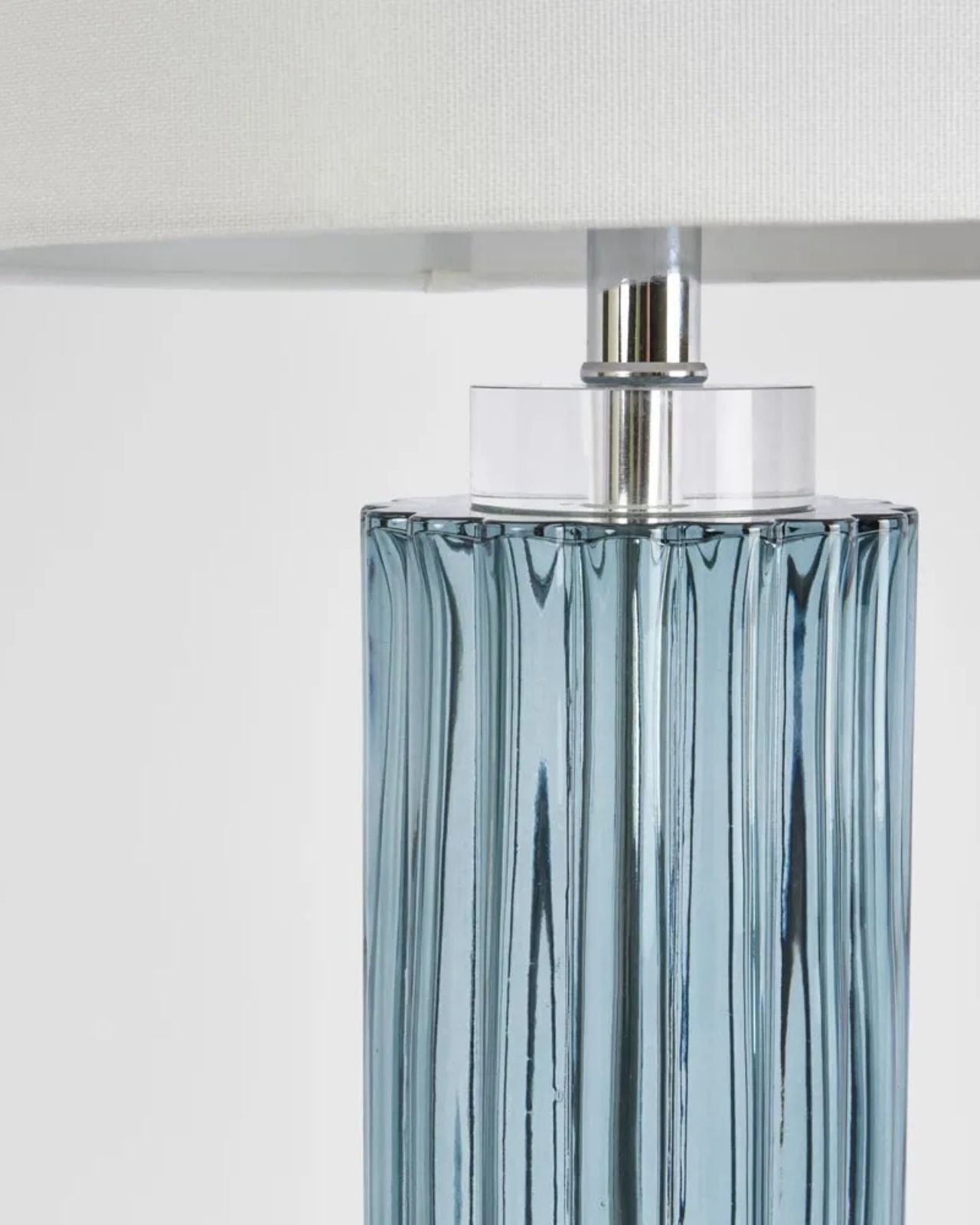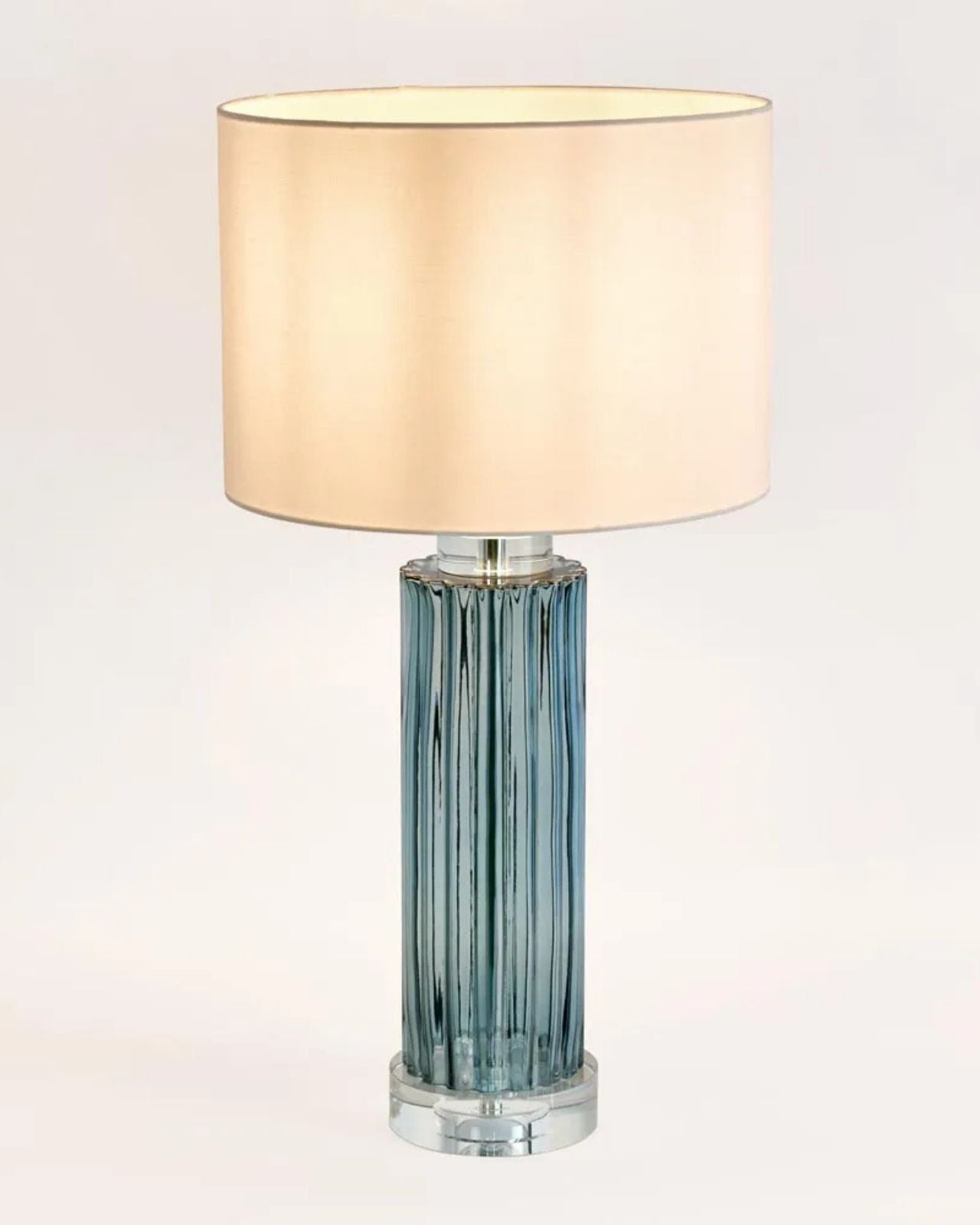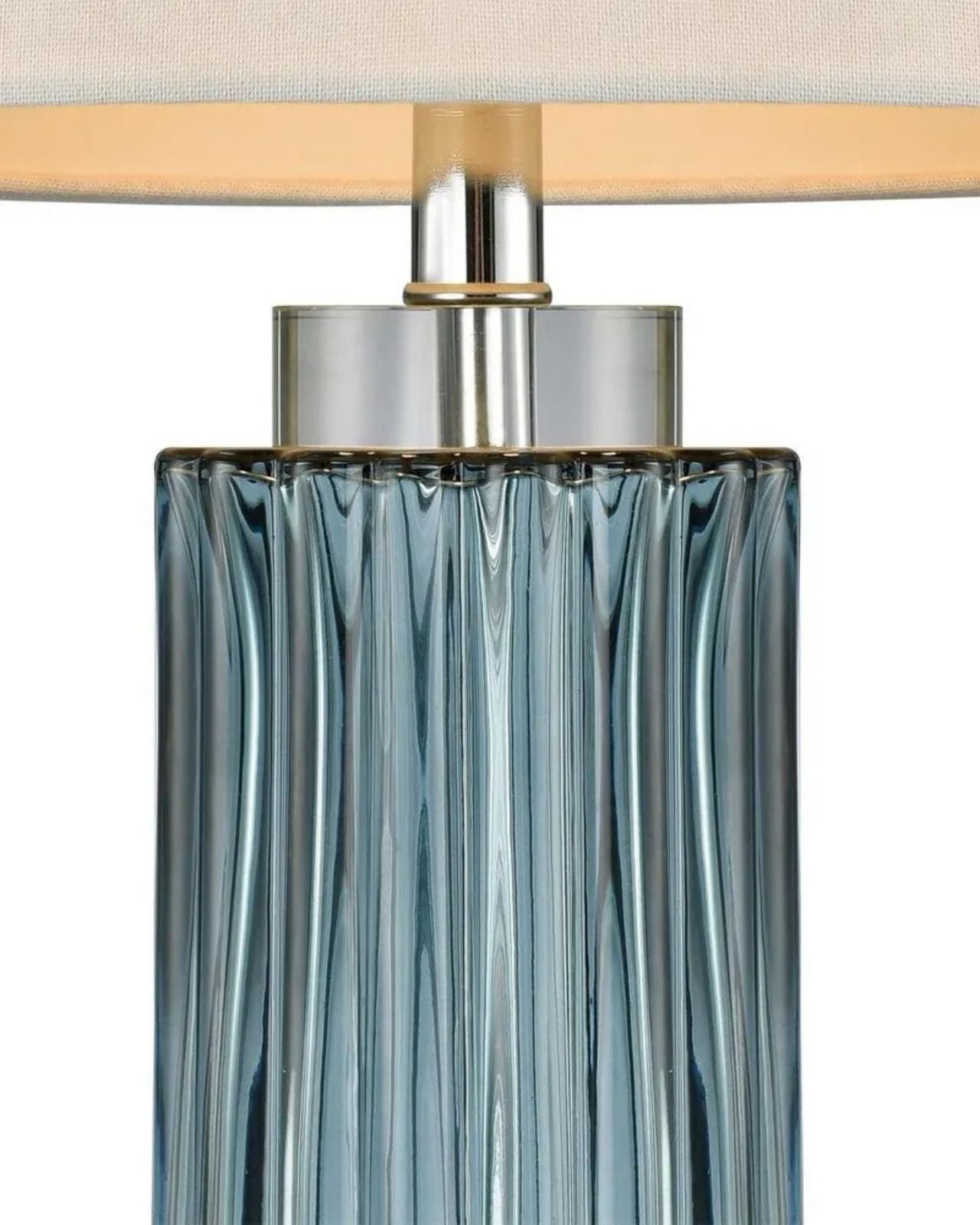 The Textured Blue Glass Table Lamp features a modern, sophisticated design with a cylindrical base made of ribbed blue glass that adds texture and a subtle pop of colour. Topping the lamp is a classic, drum-shaped lampshade in a soft, neutral cream colour, which diffuses light gently to create a warm and inviting glow. This lamp would make a stylish addition to a contemporary living room, bedroom, or office space.