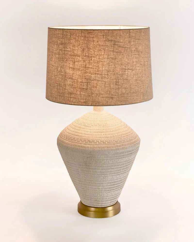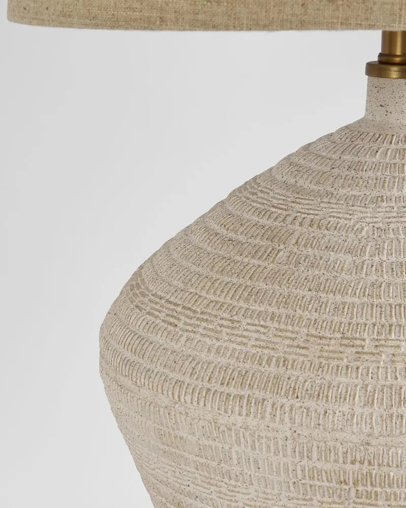 The Textured Concrete Table Lamp combines modern materiality with subtle, tactile detail. Crafted from concrete and metal, its raw, textured base creates a grounded, sculptural presence, while the crisp linen shade softens the overall look and diffuses light gently.  Its versatile design complements a variety of interiors, from minimalist and modern to transitional or loft-style spaces, providing both functional illumination and a striking decorative accent.