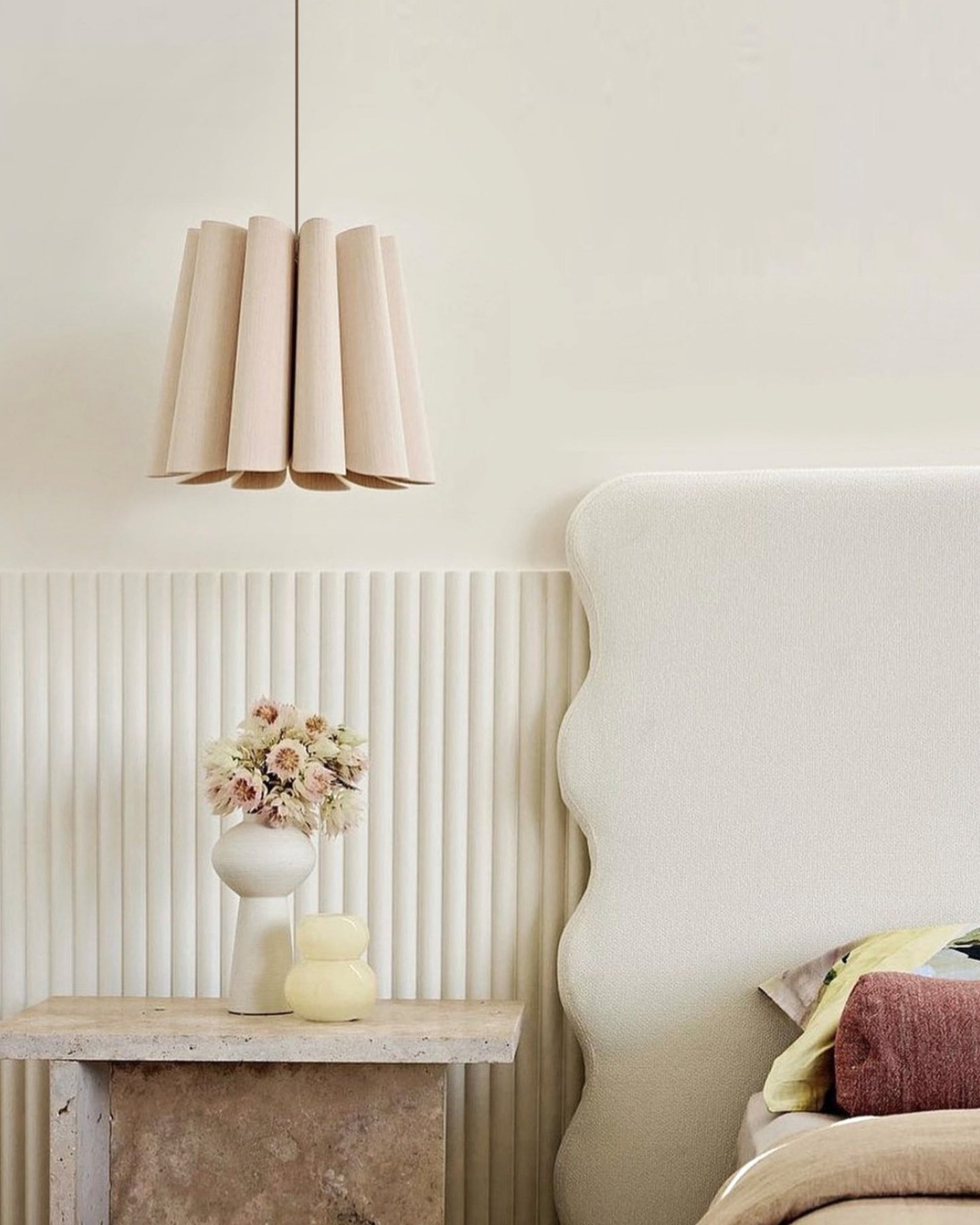 Close-up of beige pendant with a subtle pattern on a light gray background