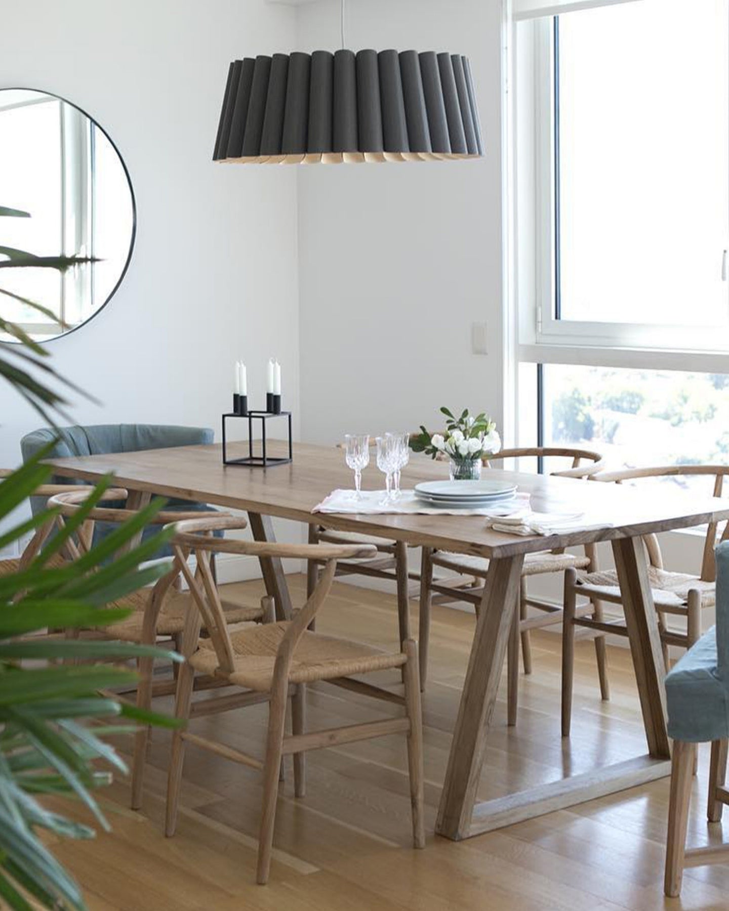 Dining room with wooden table and chairs, abstract art on the wall, featuring a wavy wooden pendant