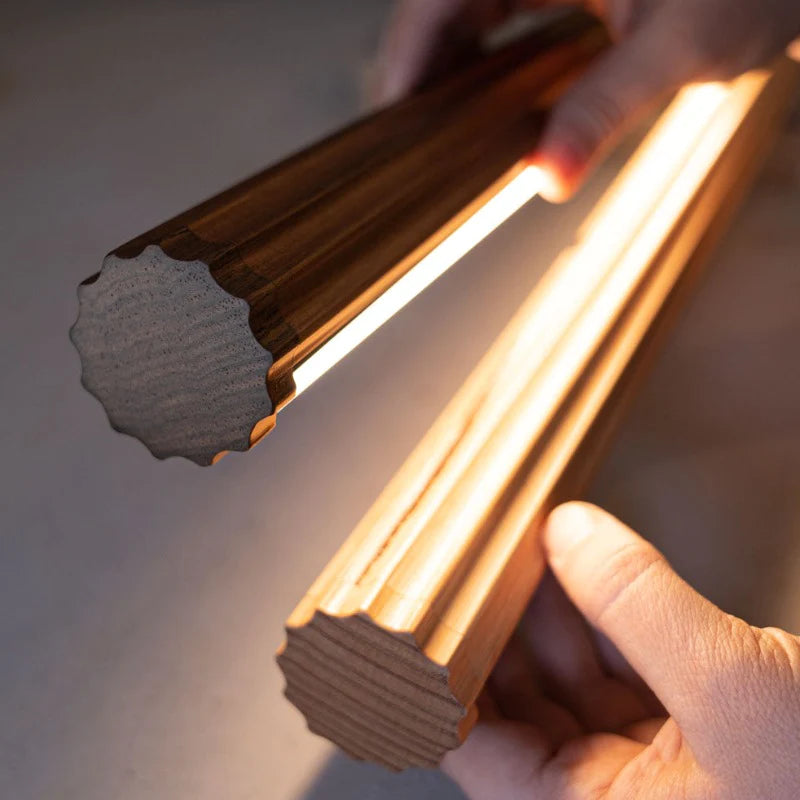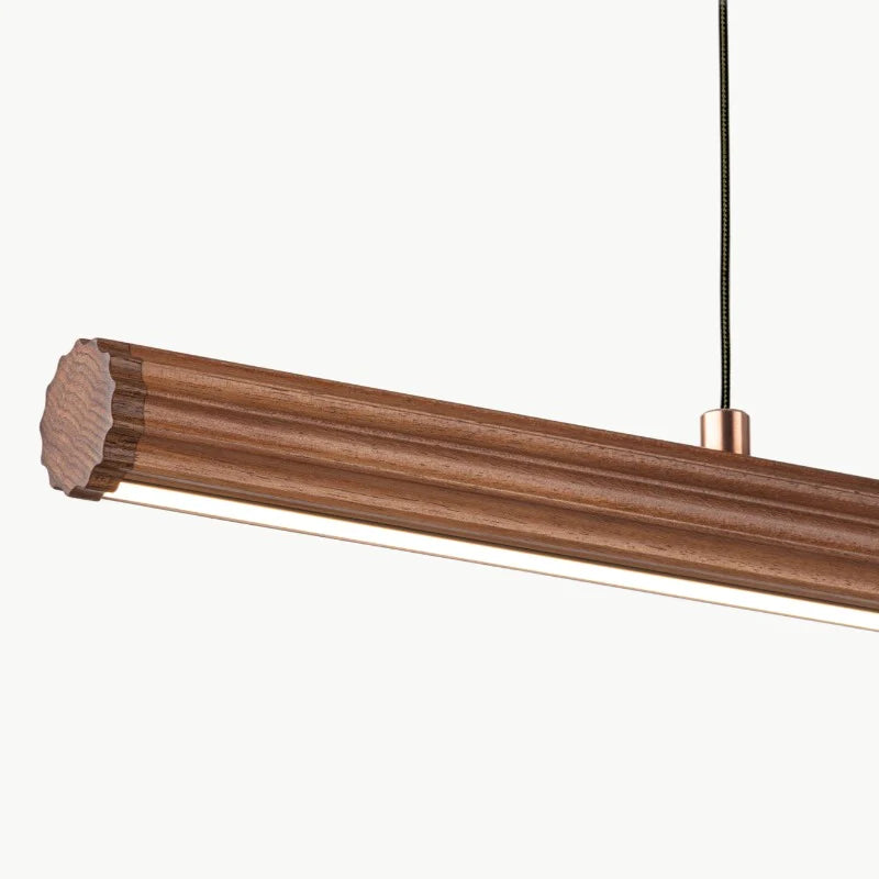 An original design by Fluxwood crafted in Currumbin Queensland- Australia. Featuring a scolloped timber body, this elegant linear pendant highlights the organic beauty of the Australian timber material used. The Australian Fluted Timber Linear uses minimal strip LED lighting, that is recessed into the pendant, making the pedant both an aesthetic and functional statement to place over a kitchen bench or dining table in an interior space.