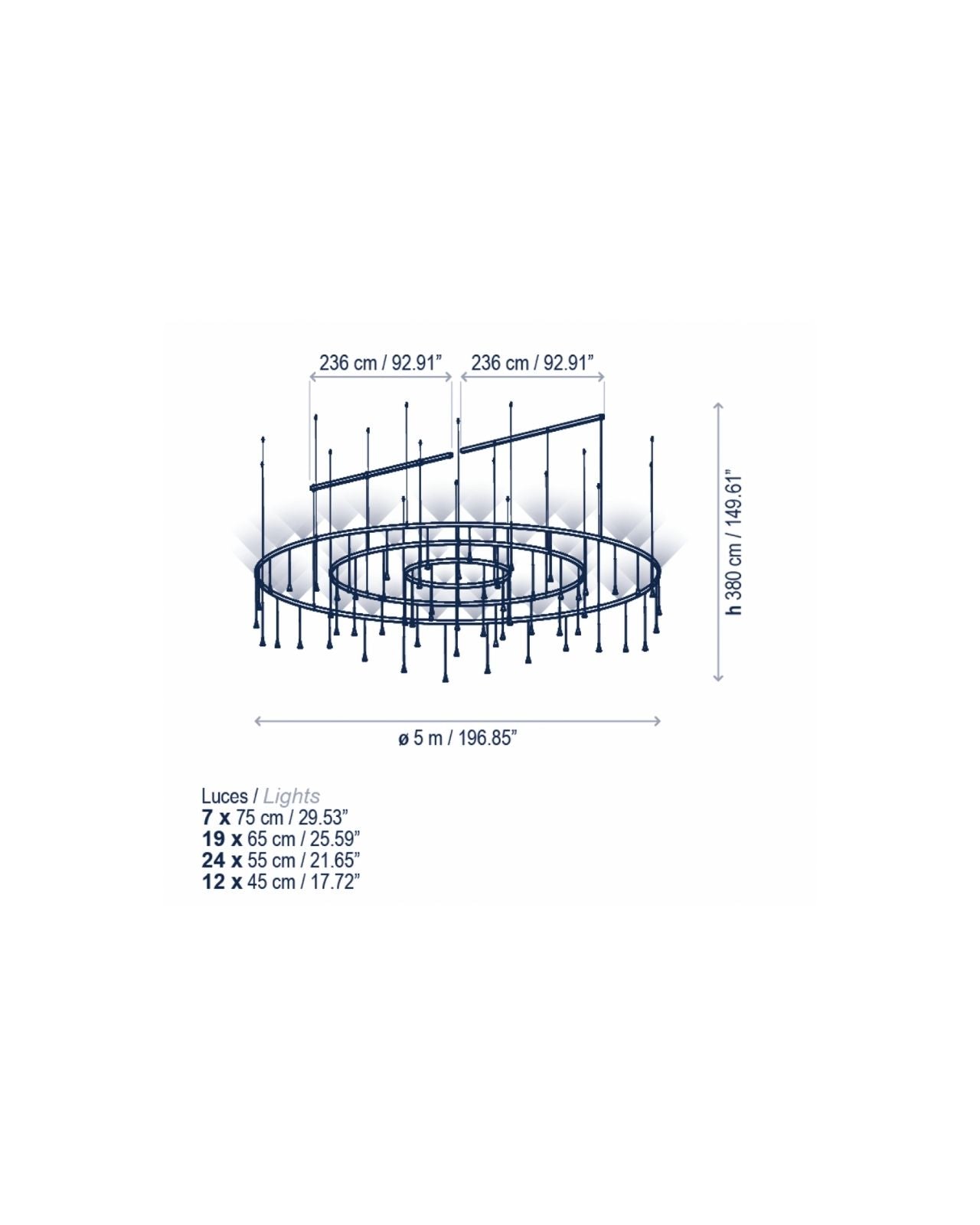 This circular drop pendant light features an elegant bell shape with LED illuminating downwards at a 30-degree angle. This light is a beautiful rendition of a cluster or void filler perfect for kitchen and dining areas, stores and venues. Available in 62 lights. This design is an extensive system of light structures designed to adapt to any type of application with a dimmable feature bringing characteristic freedom in an assortment of arrangements.