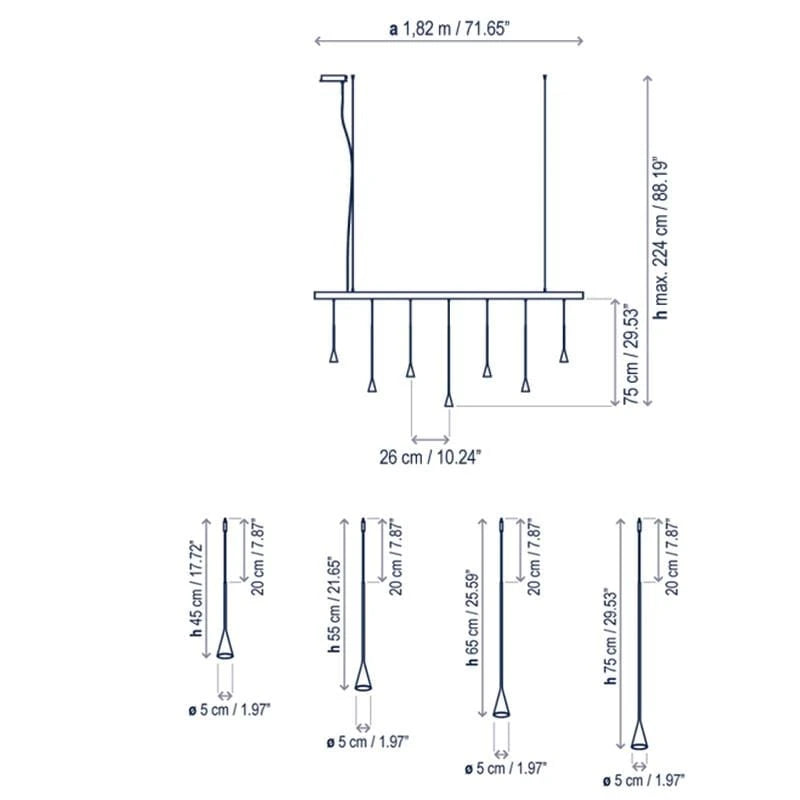 This drop-down linear pendant light features an elegant bell shape with LED illuminating downwards at a 30-degree angle. This light is a beautiful rendition of a cluster or void filler perfect for kitchen and dining areas, stores and venues. Available in four different pendant sizes and the choice of 5, 7 and 9 lights collections. This design is an extensive system of light structures designed to adapt to any type of application with a dimmable feature bringing characteristic freedom in an assortment of arrangements.