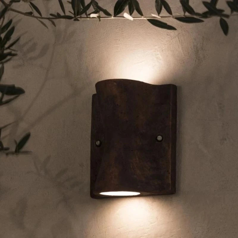 A handmade stunning contemporary outdoor wall light that exudes a warm glow onto the surrounding area both above and below. This wall light is LED ready and has a stunning corten finish that blends into both brick and paved surfaces. Made to perfection in Italy.