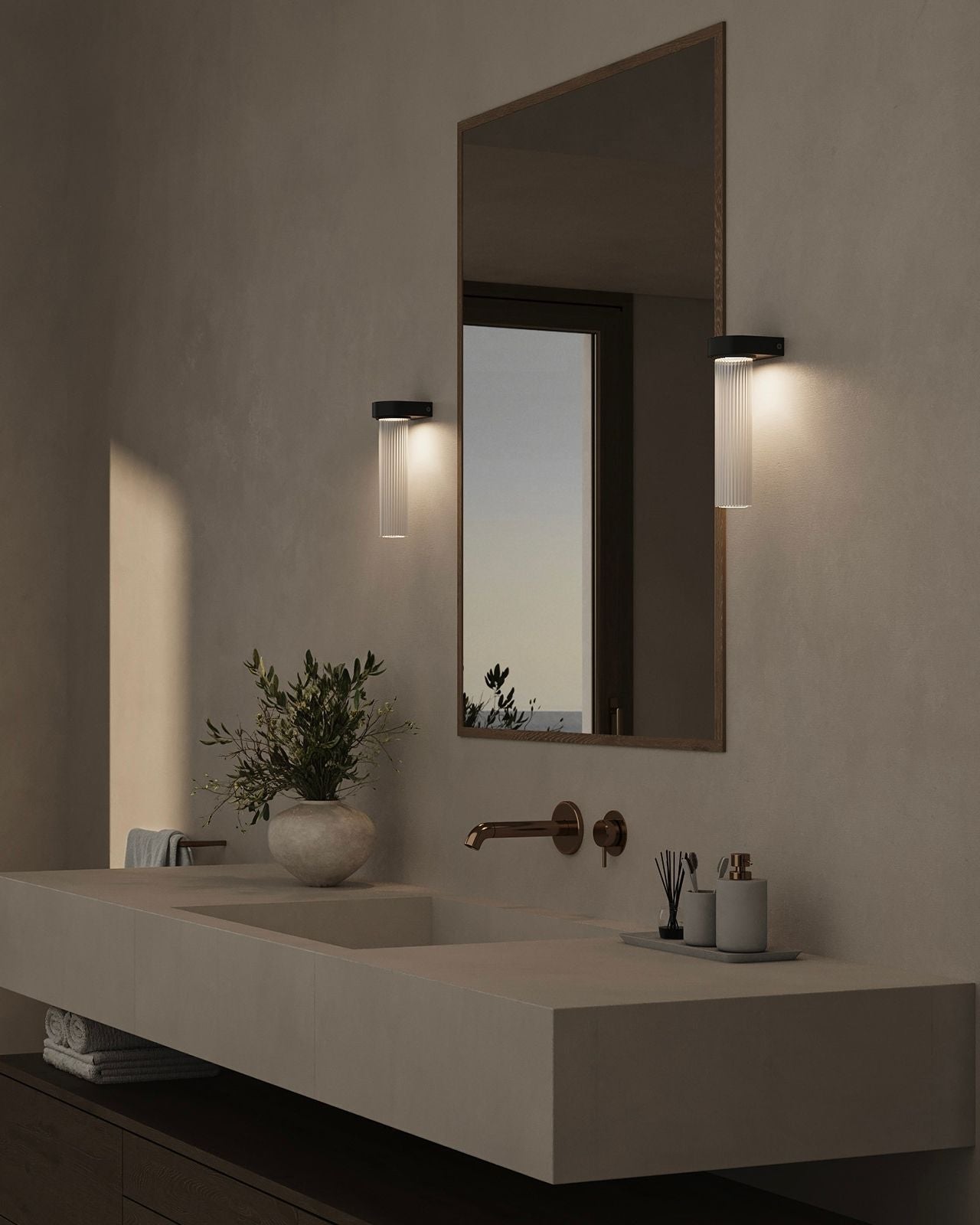 The Cylindrical Glass Wall Light presents a contemporary interpretation of classic design. A slim wall-mounted bracket, offered in Old Brass or Iron, supports a cylindrical borosilicate glass shade, available in clear, ribbed, or frosted finishes. The interplay between the structured metal form and the glass profile creates a clean, architectural aesthetic. Its balanced proportions and versatile design make it well-suited to a range of applications, from framing mirrors and illuminating hallways to enhancing bathroom interiors. With an IP44 rating, the fixture is suitable for damp environments while maintaining its refined appearance.
