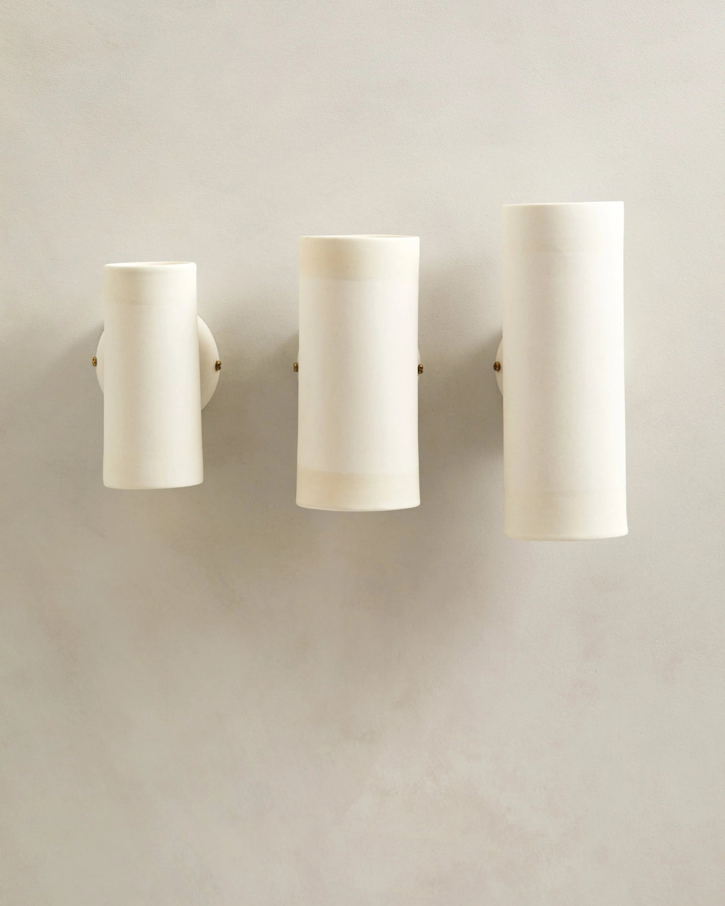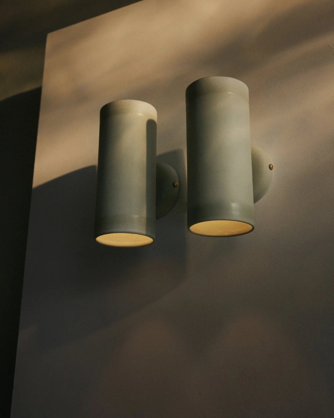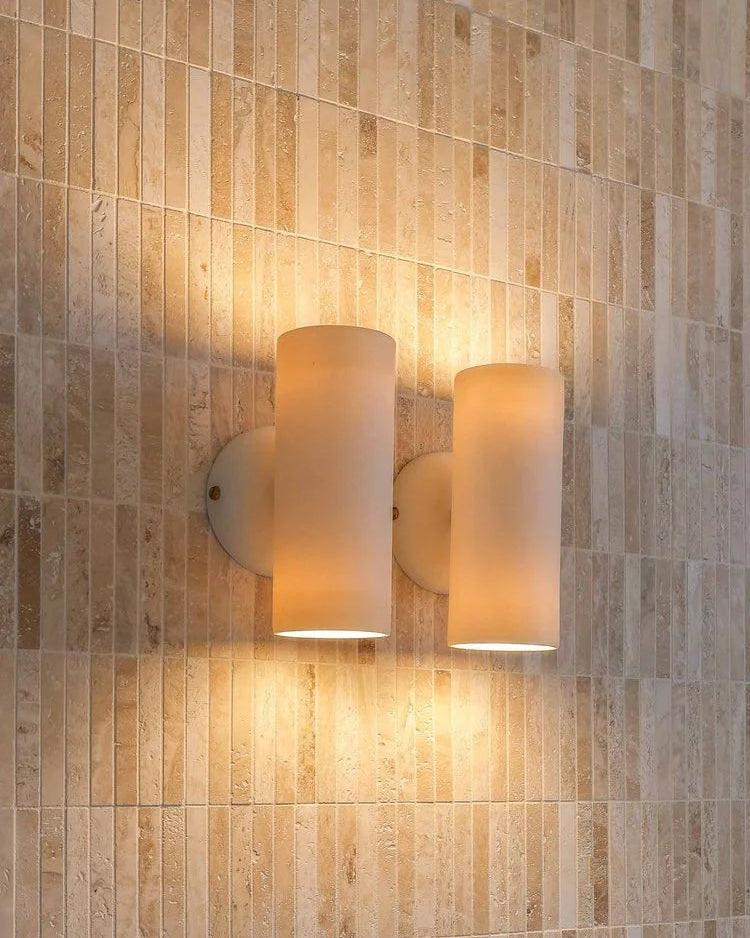Two cylindrical ceramic wall lights mounted on a textured wall.
