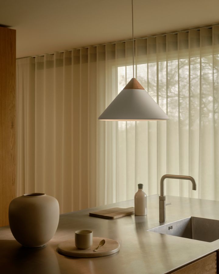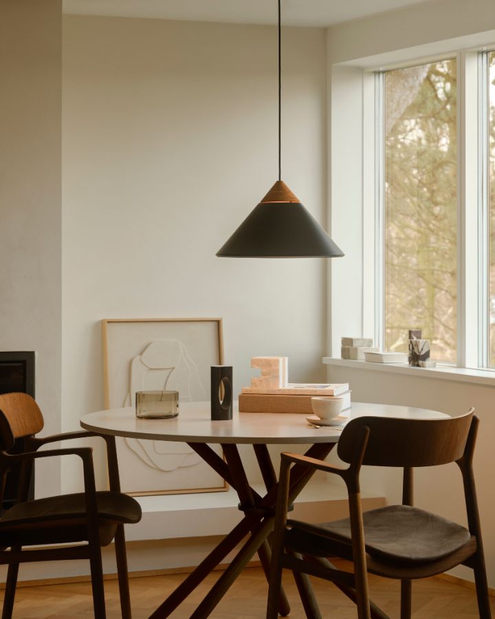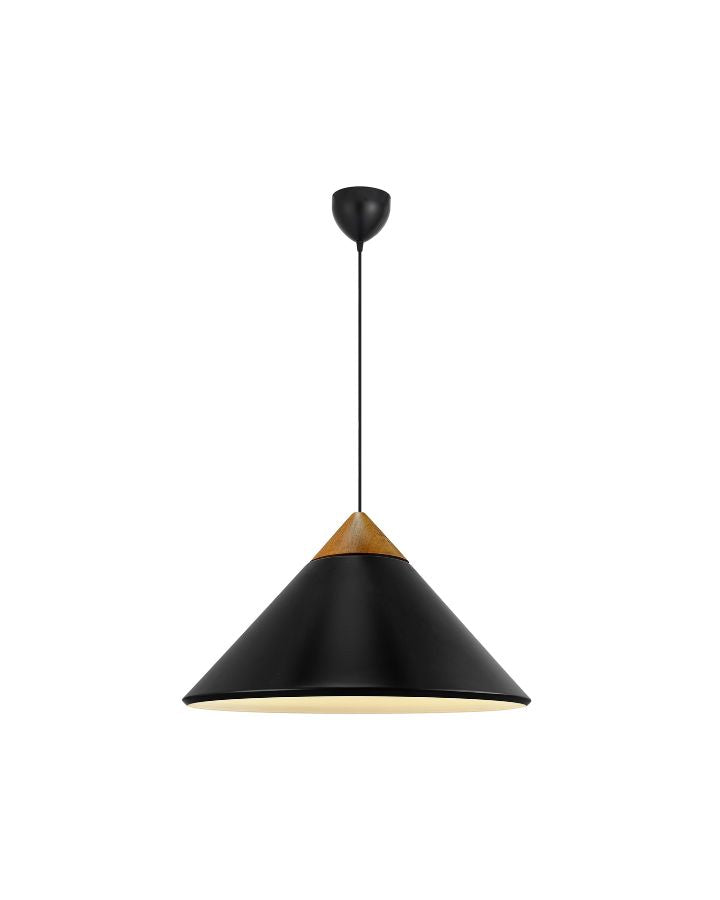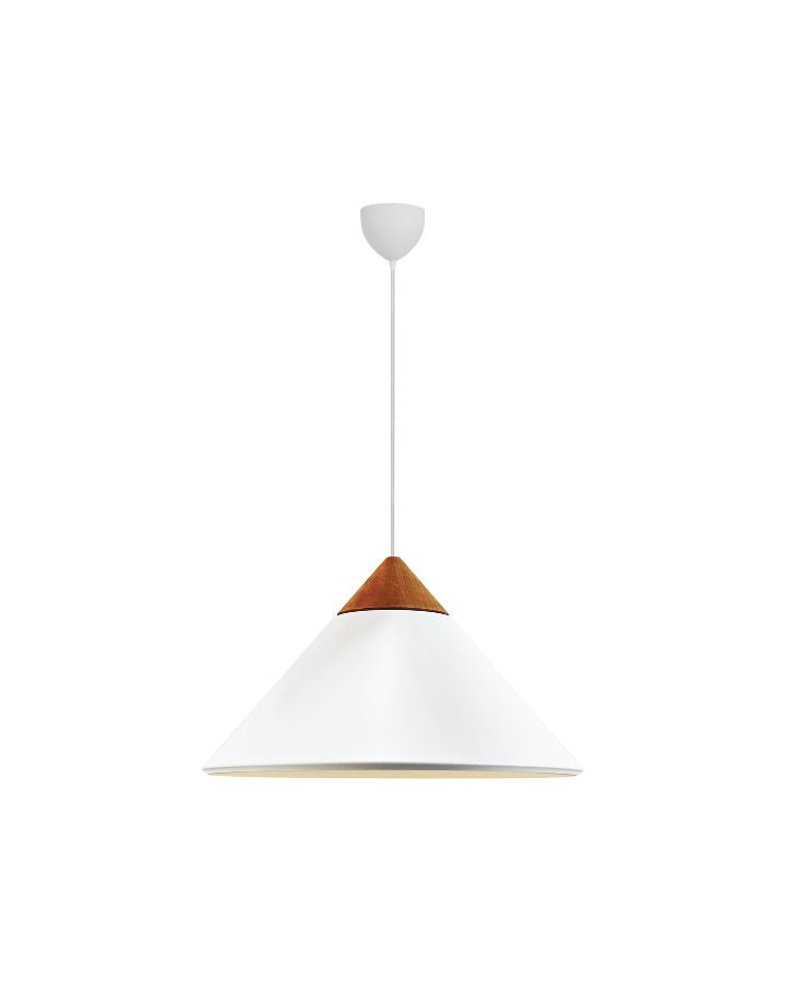 The Metal & Wood Pendant Light combines matte black or matte white metal with an ash wood top for a refined Scandinavian look. Its conical shade directs light downward while a subtle top opening adds a subtle glow, perfect over dining tables or kitchen islands.