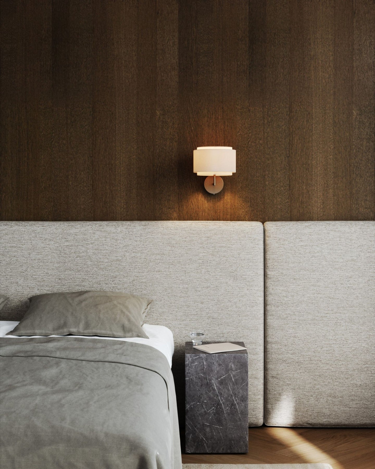 The Double Shaded Fabric Wall Sconce blends minimalist and Japandi aesthetics. Featuring an elegant double-shaded fabric shade overlapping layers of light beige linen fabric, creating a soft, diffused glow to enhance warmth in neutral spaces. The fixture is supported by a round metal base with a burnished brass finish, adding a sophisticated charm. A short metal arm extends from the base, holding the shade in place while maintaining a clean and balanced design.