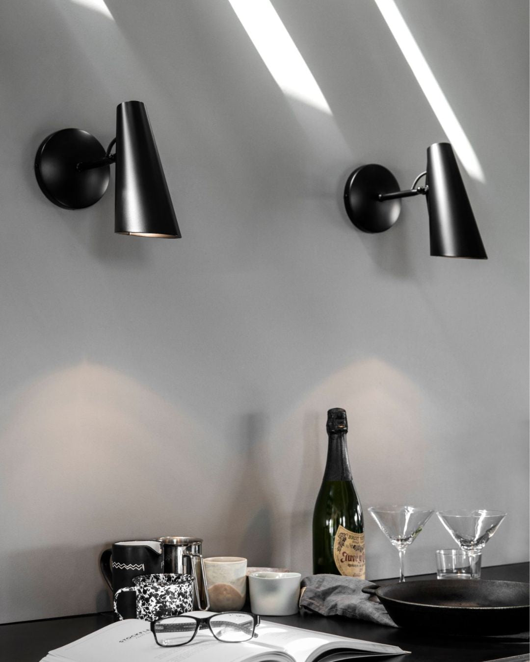 Two 1952 Scandinavian Designed Wall Lights on a white wall with a table and items below.
