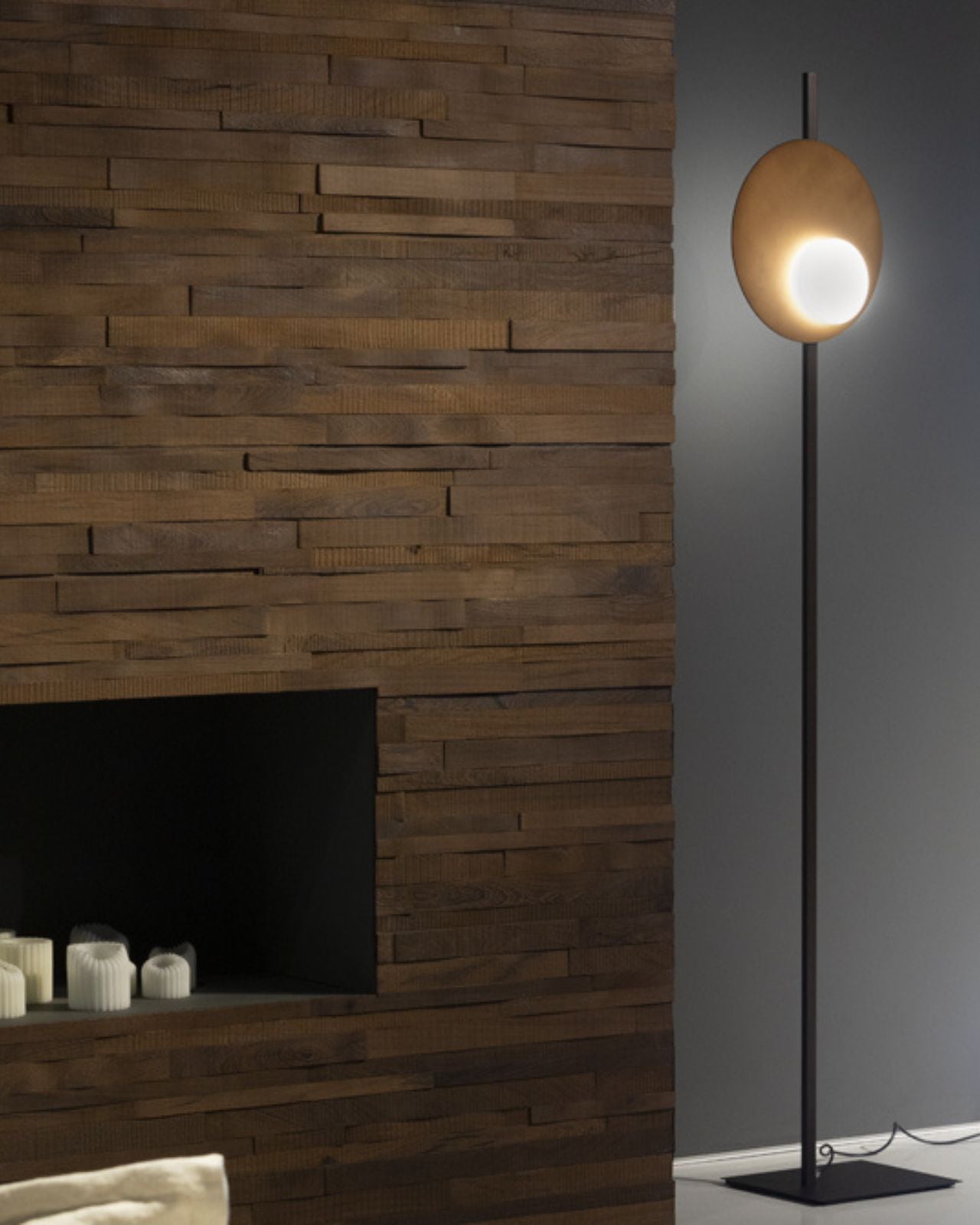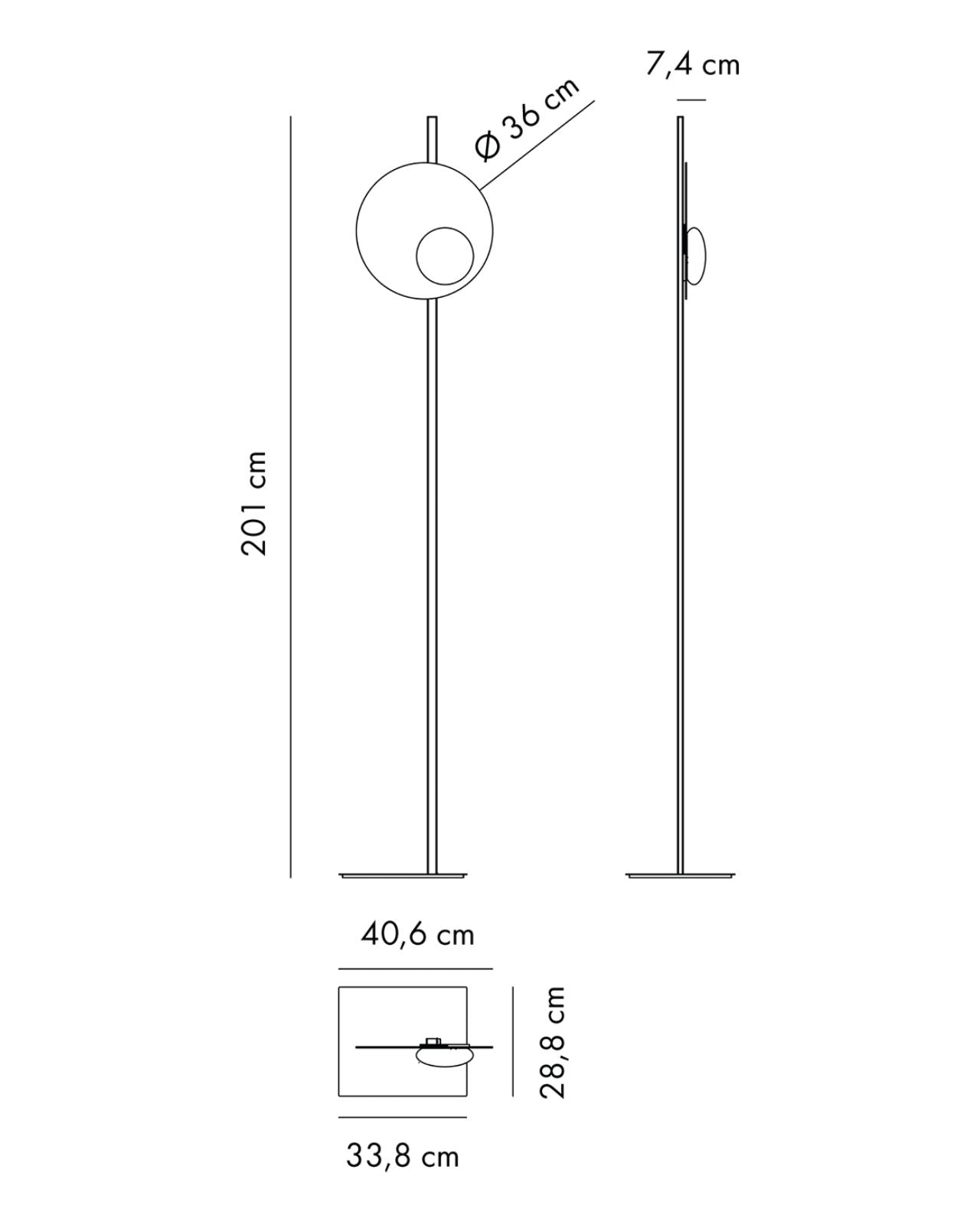 Designed in Italy with a minimalist profile this contemporary floor lamp is composed of a painted aluminium disc in either Bronze or Black and blown glass diffuser. An integrated dimmable LED light source is housed within its decentralised diffuser allowing for ample illumination. Suitable for a multitude of spaces such as living areas, offices or commercial interiores. Parctirualy suited for modern or contemporary styled interiors this floor lamp can be a quiet addition to a room or used as a focal point.