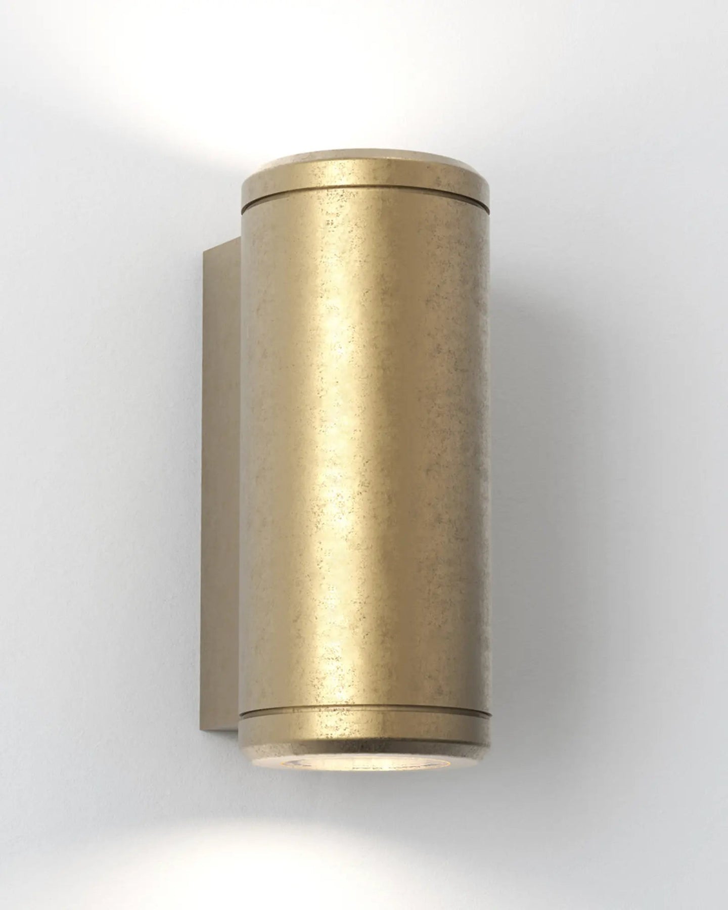 A refined, cylindrical outdoor wall-mounted light, designed for vertical installation. It draws on a minimal, contemporary aesthetic yet offers a warm character thanks to its brass finish and subtle detailing.