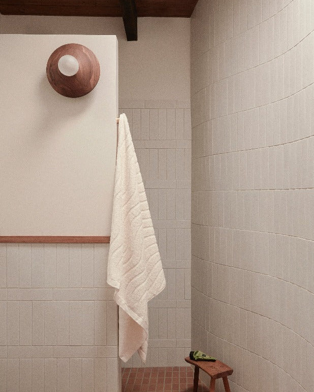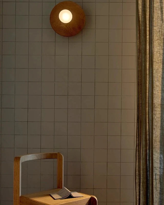 Wall-mounted timber light fixture on a tiled wall with a curtain partially drawn.