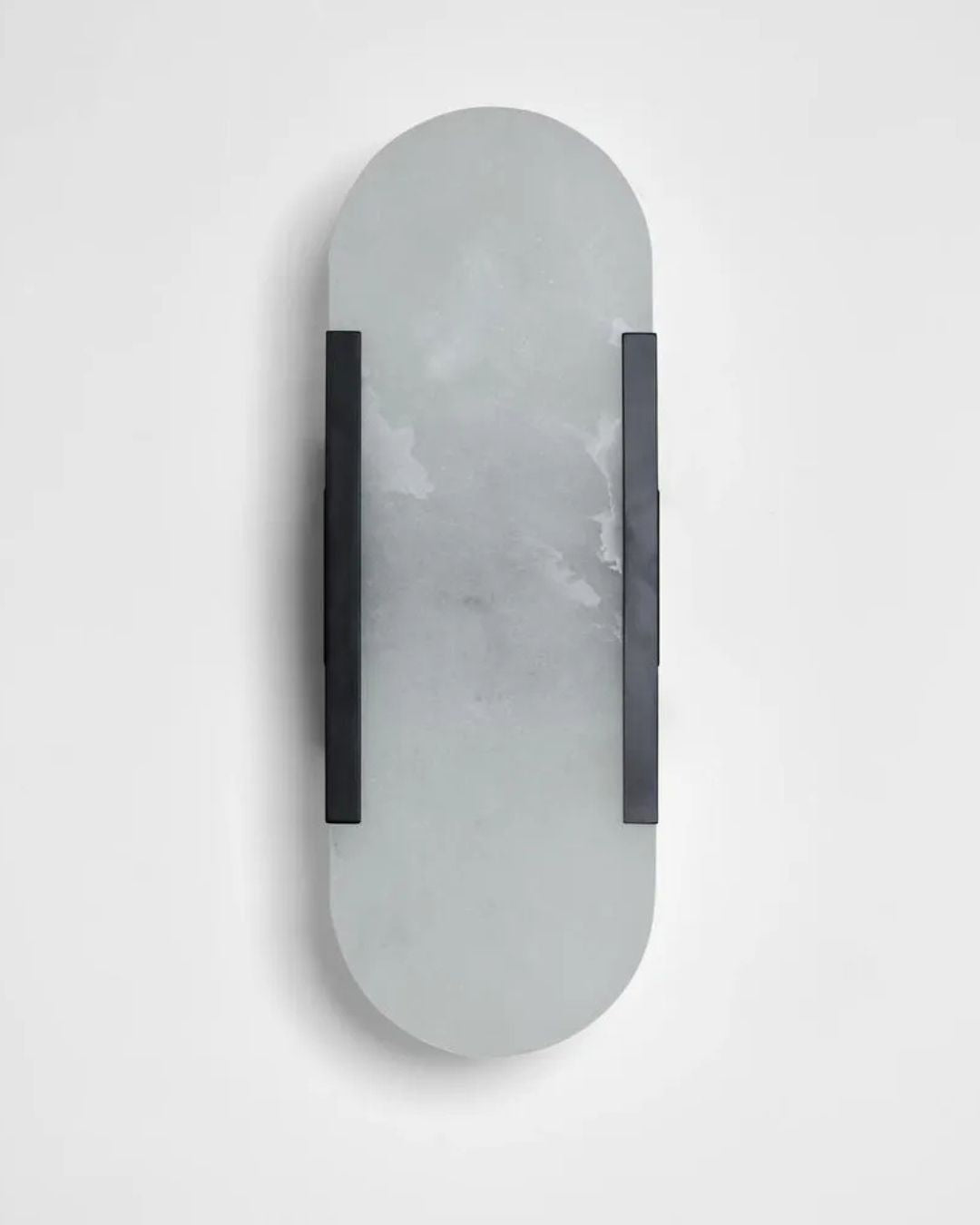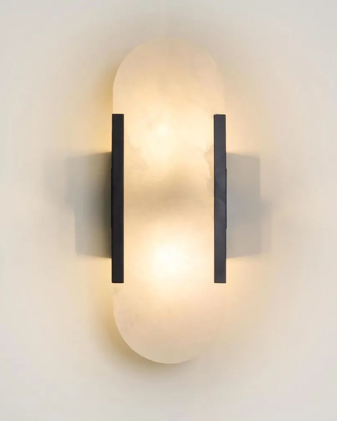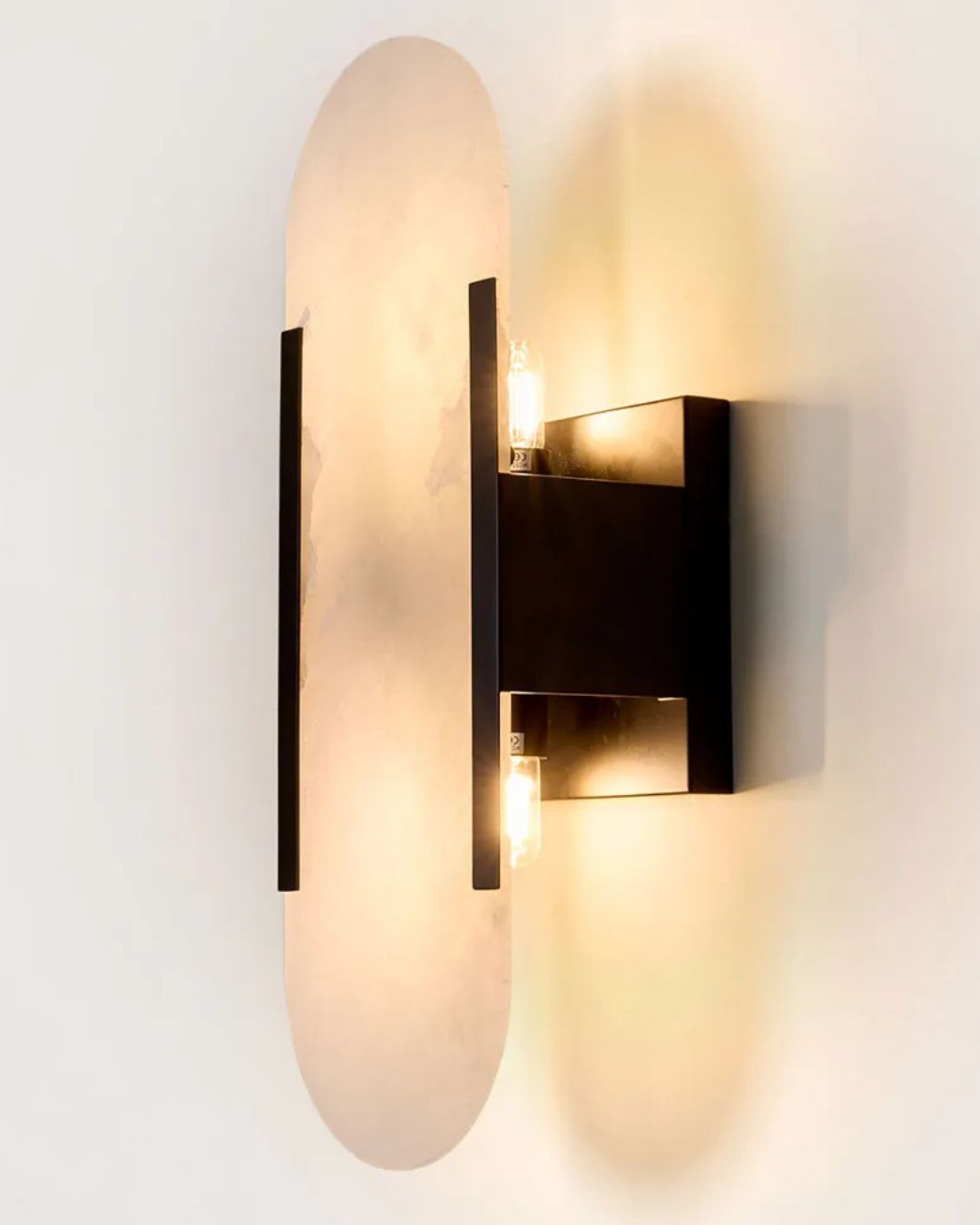 This oblong wall light features a unique design, crafted with a blend of alabaster and iron and completed with a polished gold or black finish. With warm and inviting illumination, it adds a touch of intrigue, making it an excellent addition to any room.