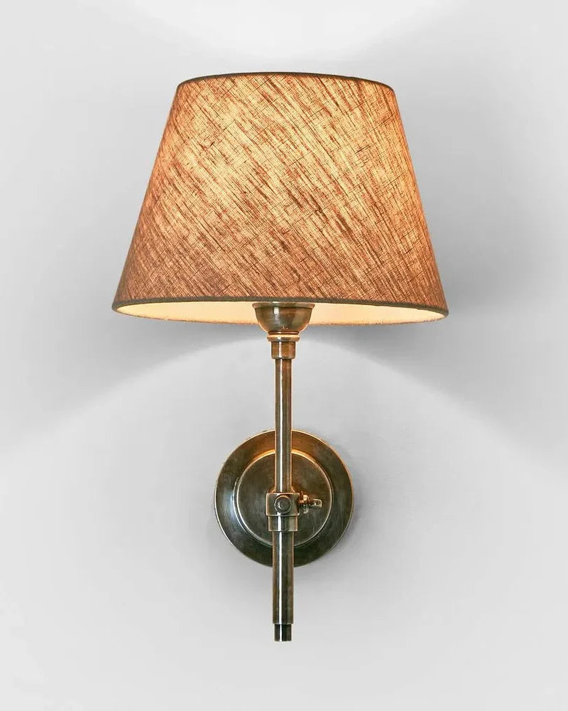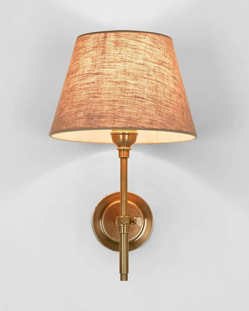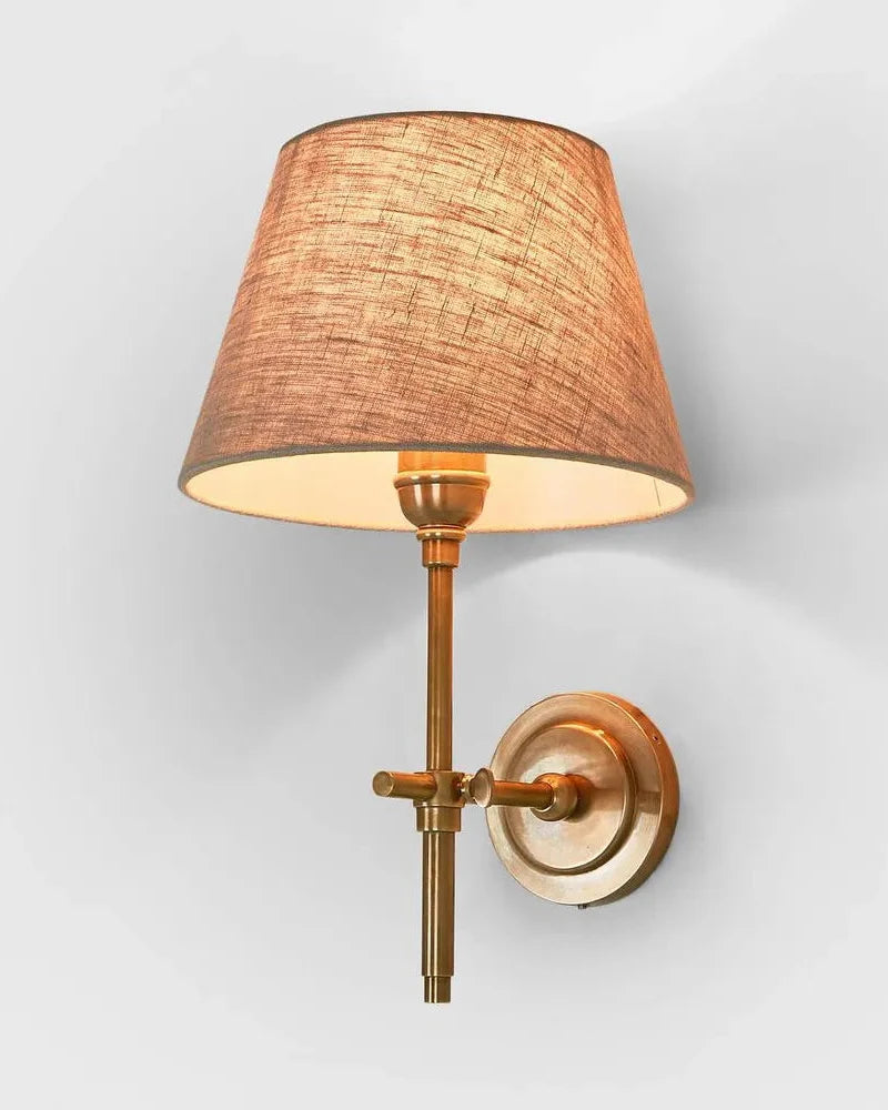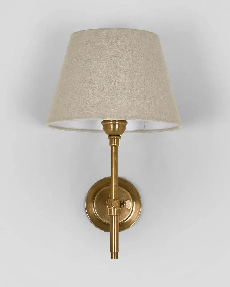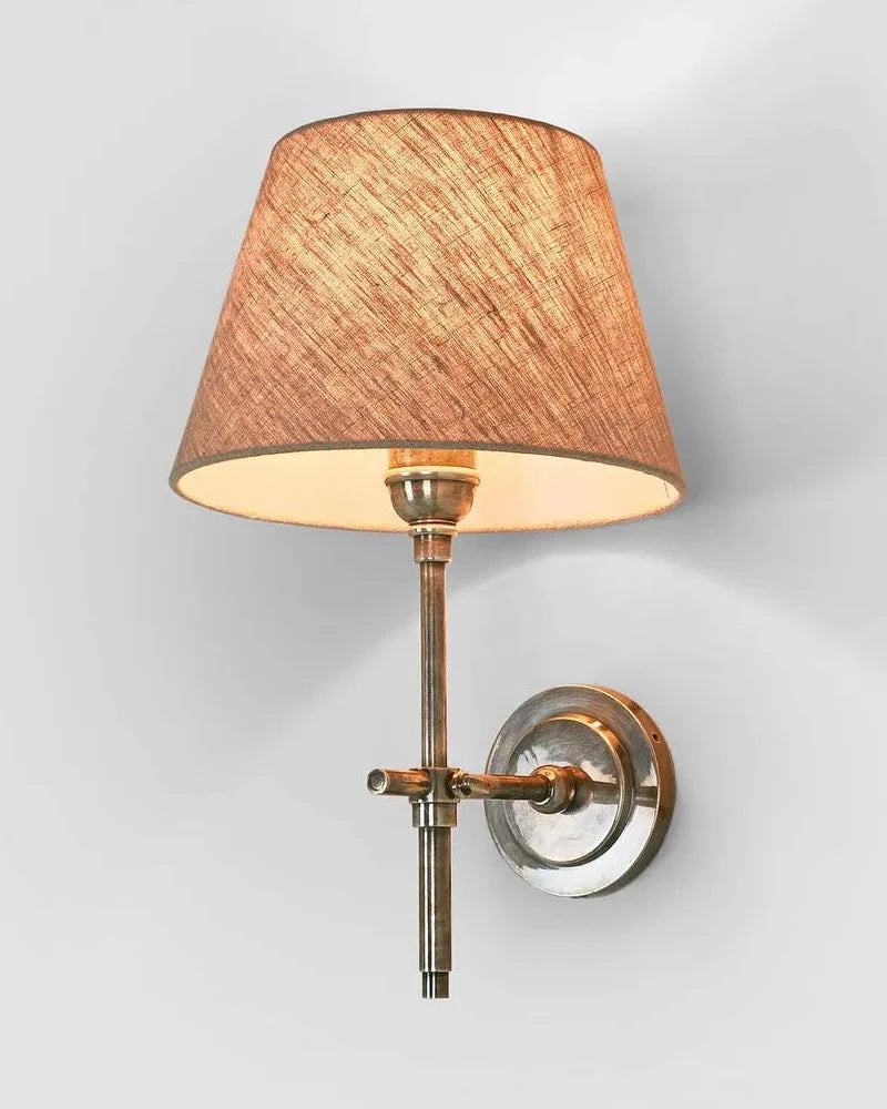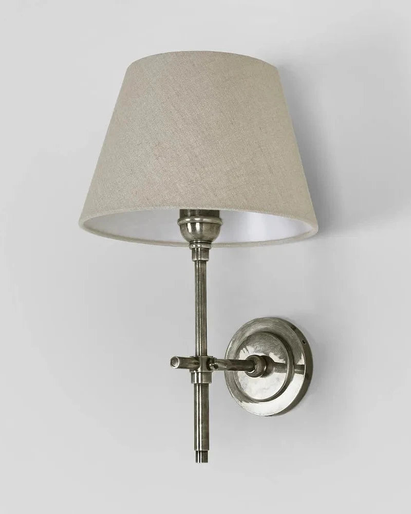 Crafted from brass in antique brass or silver finish, this chic wall light exudes timeless elegance. Featuring a classic straight-line sleek arm extending from the base and supporting a shade made from tapered linen if you choose the option, this fixture will diffuse a soft light for a warm and inviting ambience. Compatible with E14 bulbs and dimmer switches, it offers versatility to customise brightness according to your preference.