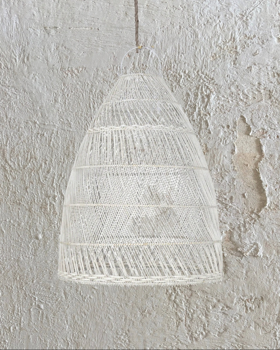 Cone Rattan Pendant Light White with a rustic background