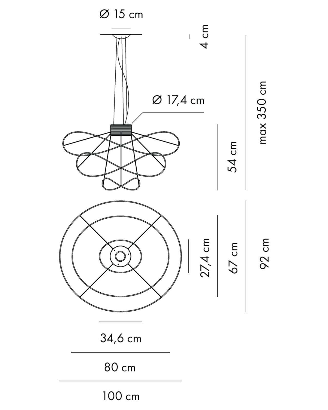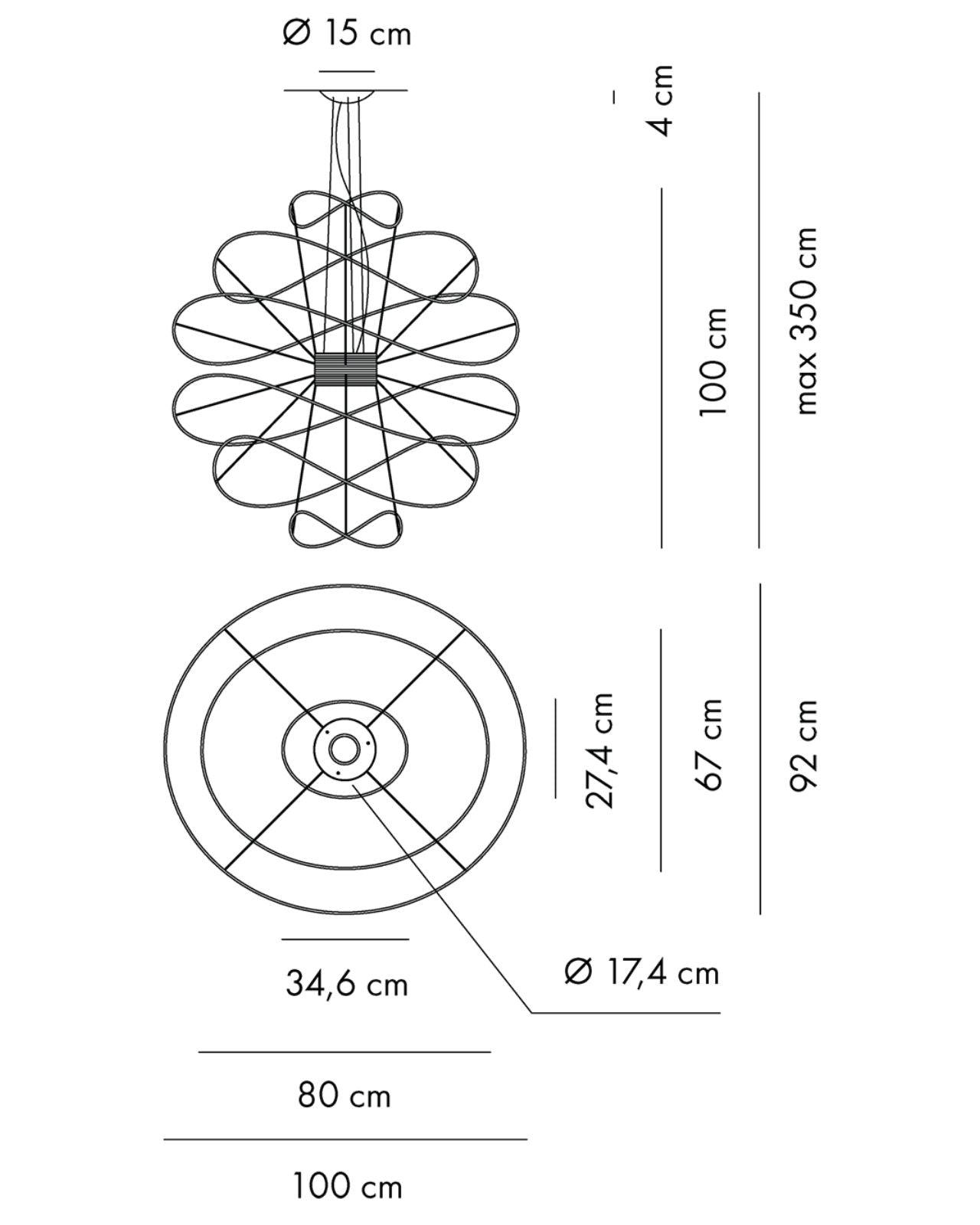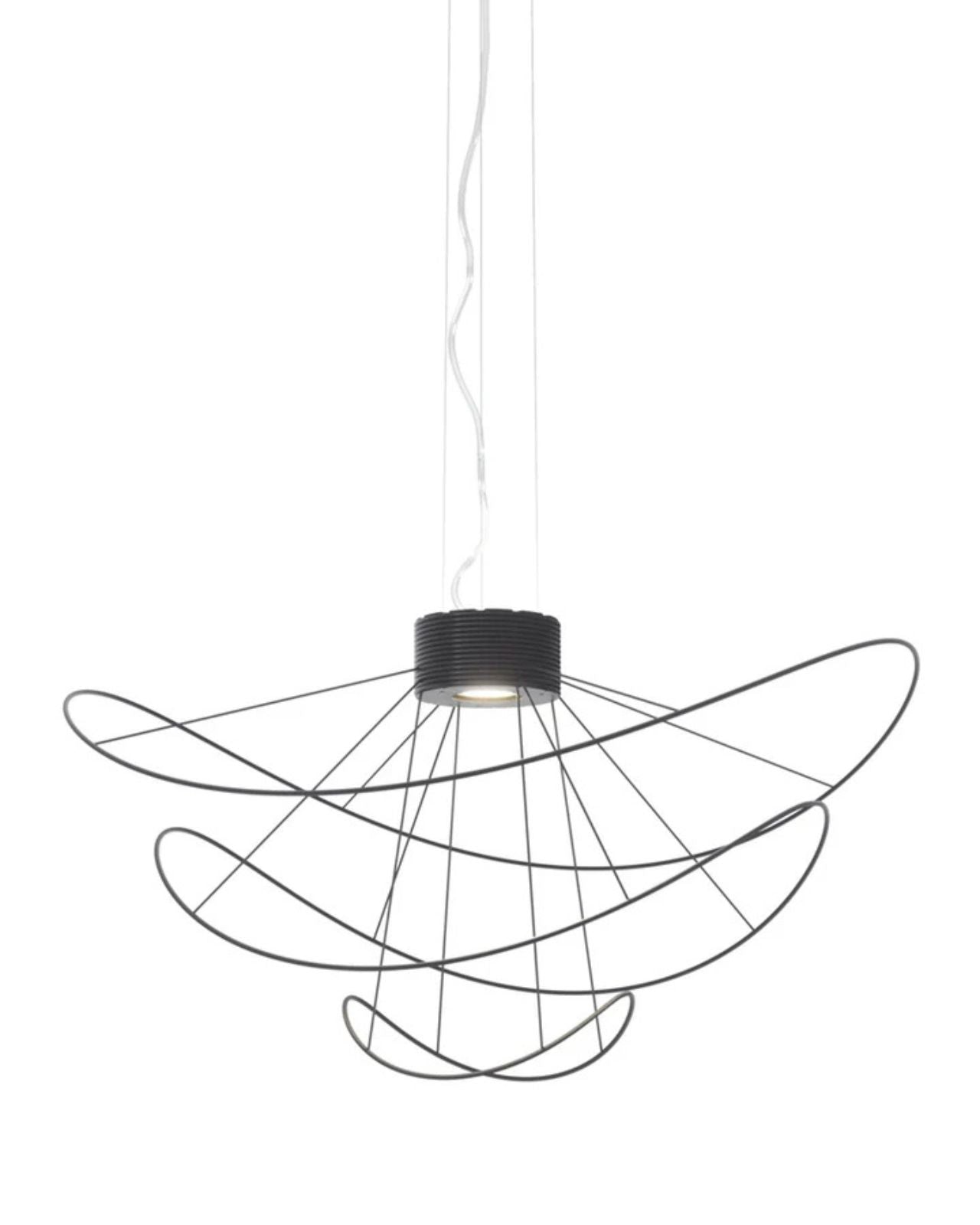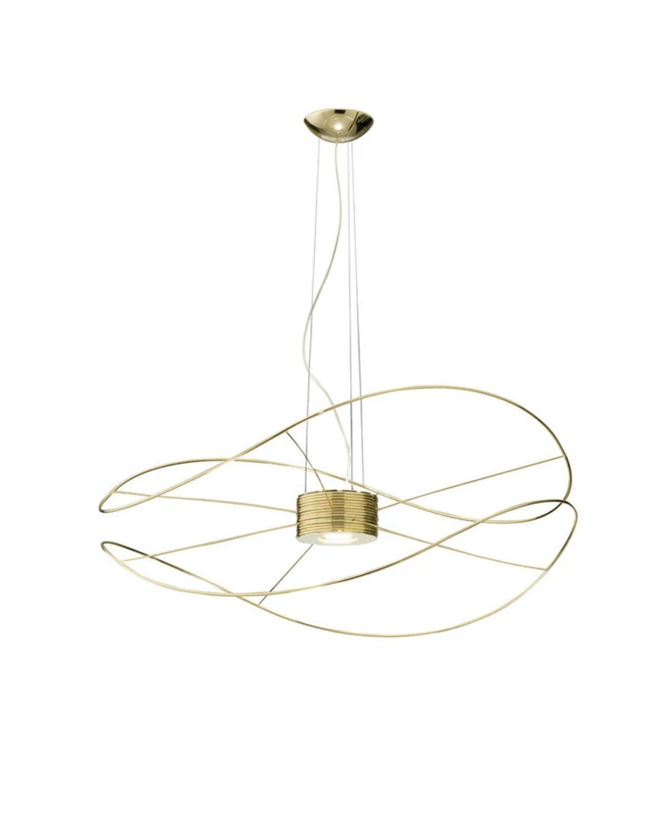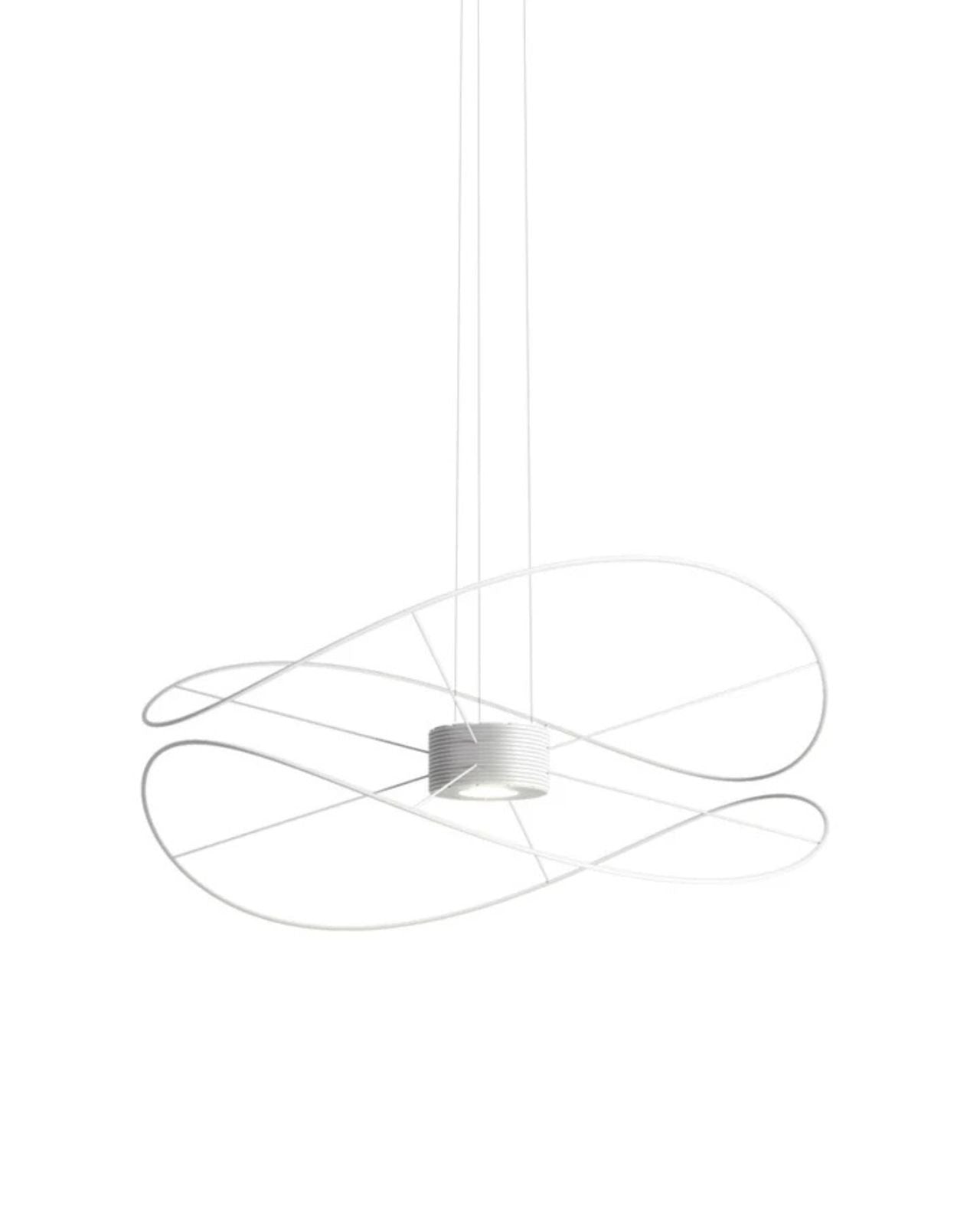The Contemporary Hoops Pendant Lights are a collection of ceiling lamps and suspended lights with interchangeable elements in different shapes and sizes. Winding metal hoops hang below a central base creating a decorative fitting for feature lighting applications. The Hoops pendant produces light upward and downward from the central integrated LEDs with diffused beam. Dimmable. Available in gold, black or white finish in a range of sizes.