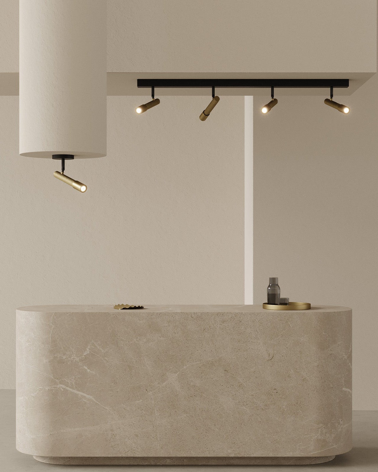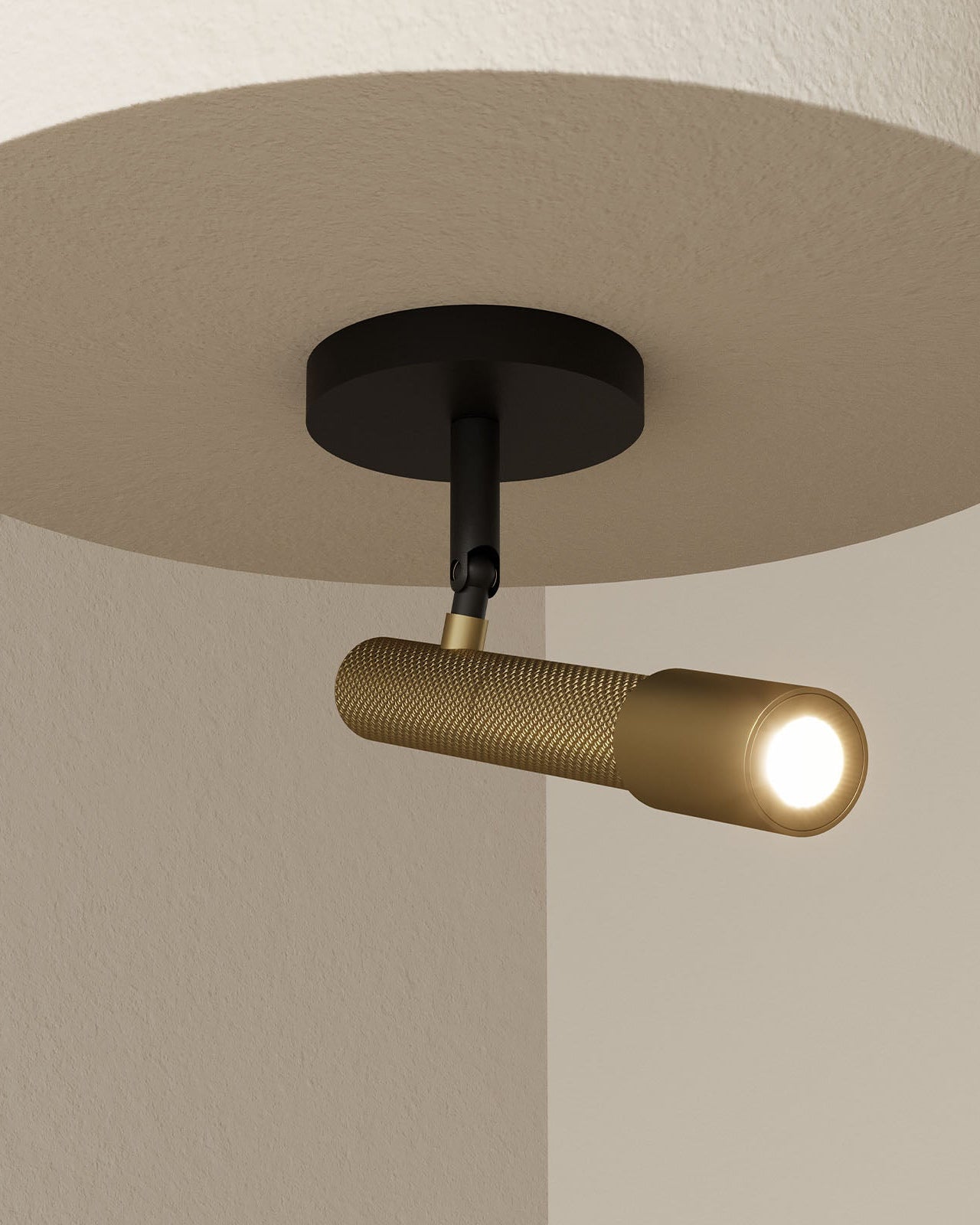 Modern ceiling light fixture with a gold cylindrical shade on a neutral background