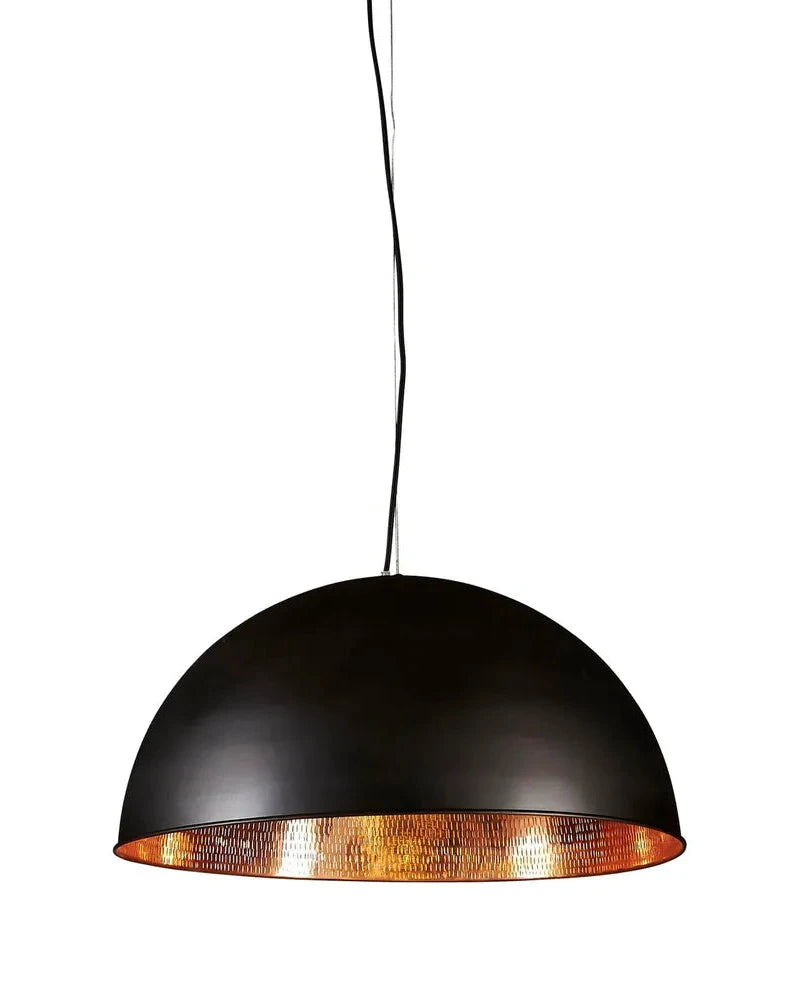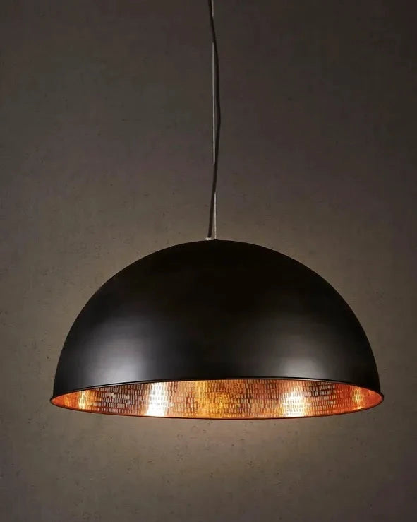 This pendant lamp features a striking dome-shaped design with a sophisticated black and copper finish. The inner dome is lined with hand-beaten metal, creating a distinctive texture that comes to life when illuminated. The warm glow accentuates the copper tones, casting a captivating play of light and shadow. Perfect for living rooms, offices, or bedrooms, this pendant adds depth and contemporary character to any interior.