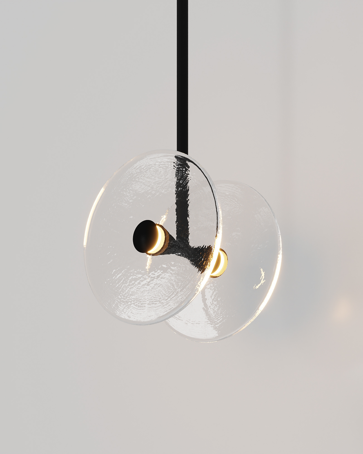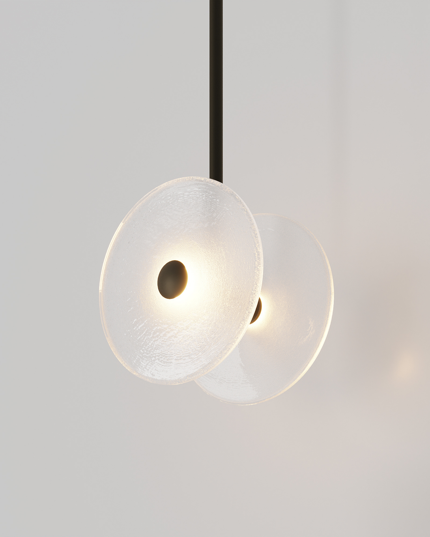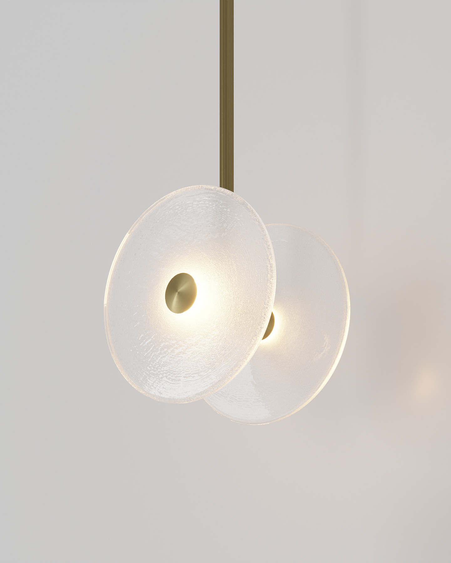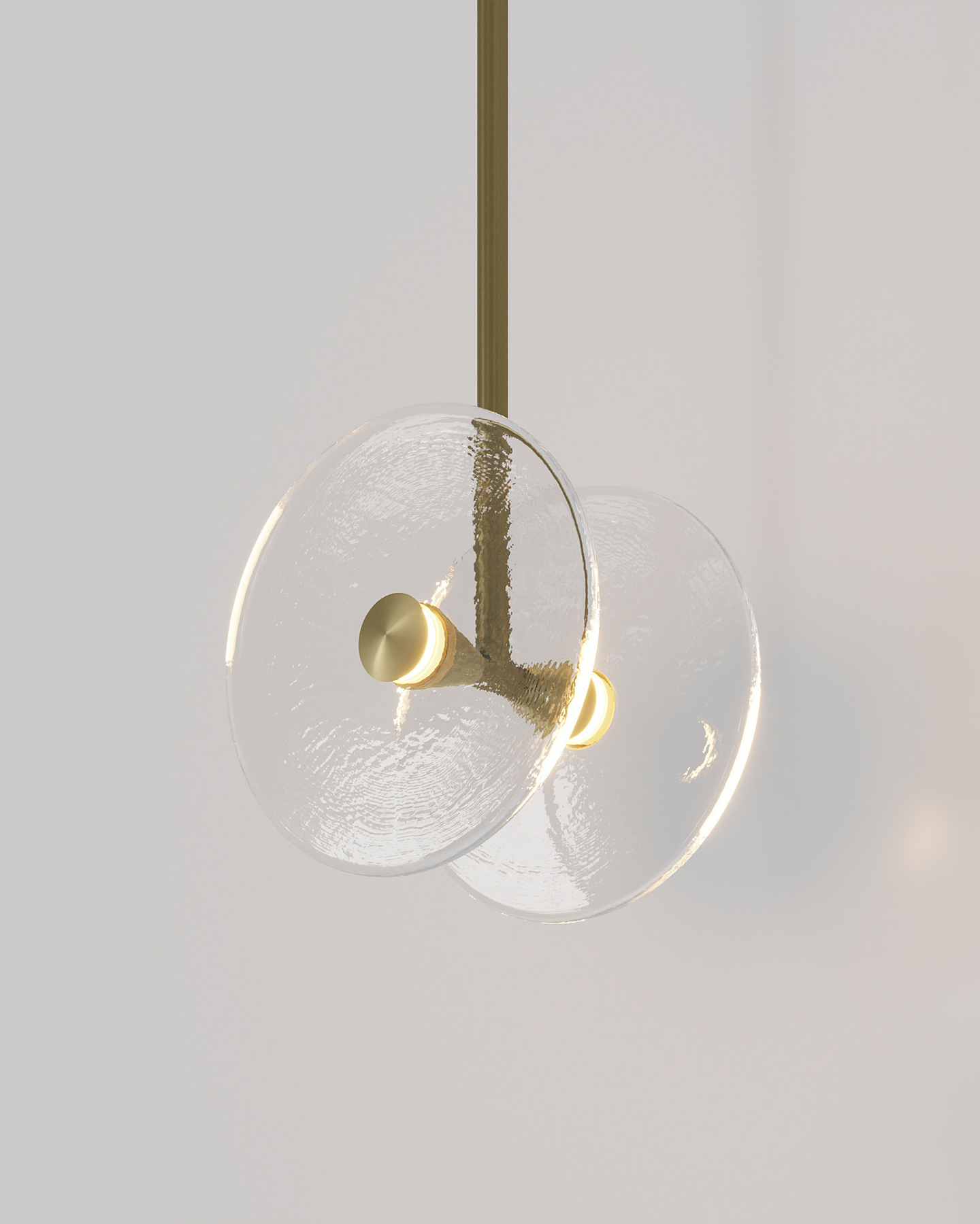 The Coral Duo Suspended Pendant includes two hand-blown glass discs suspended by a rod available in Brass, White, Bronze, Steel and Black. Designed and handmade in Currumbin Australia, by Oliver Höglund and Ryan Roberts. Ideal for illuminating powder rooms and bathrooms. The handmade process of this fitting results in subtle differences, making each pendant aesthetically unique. Install singularly or as a collection for a statement look.