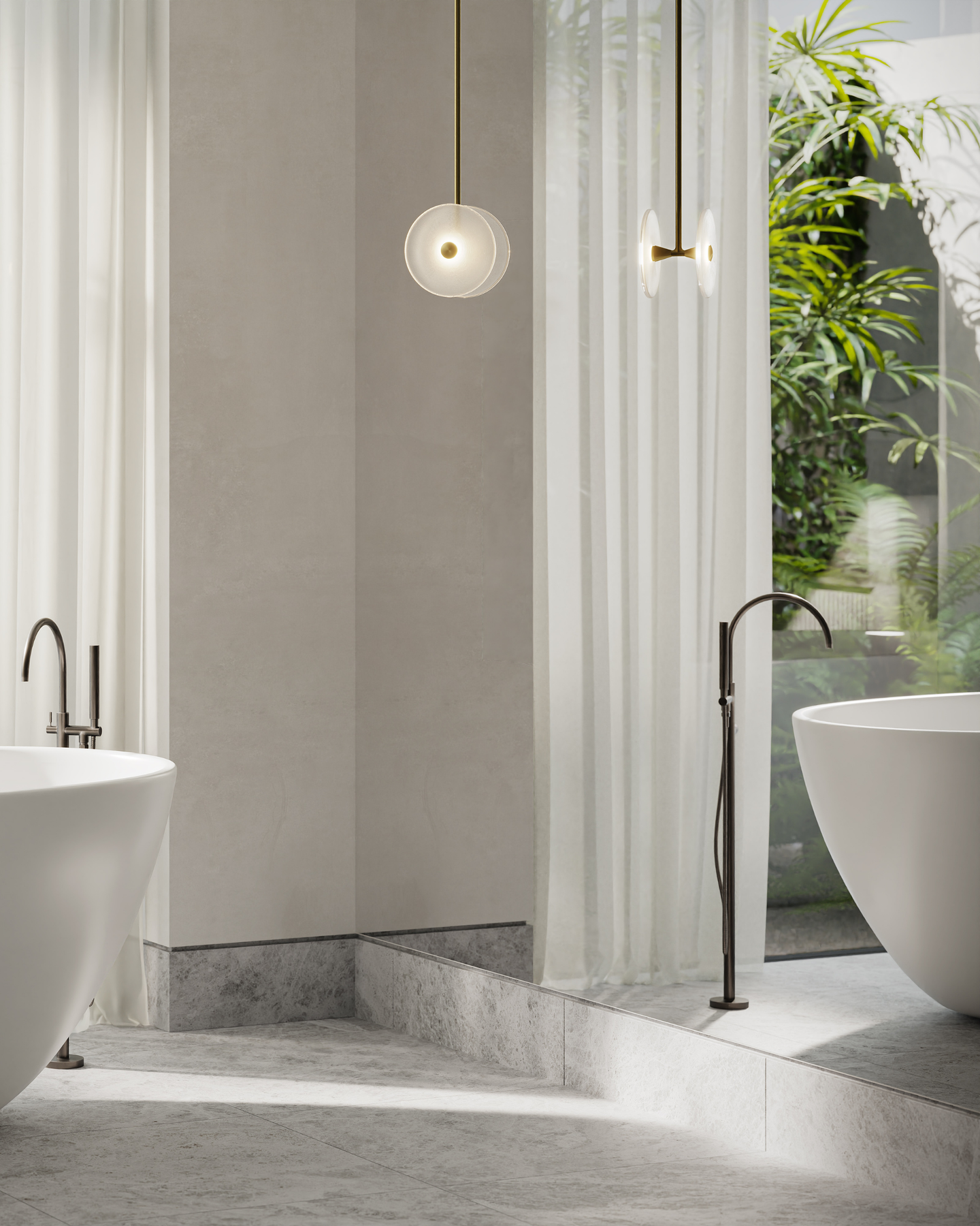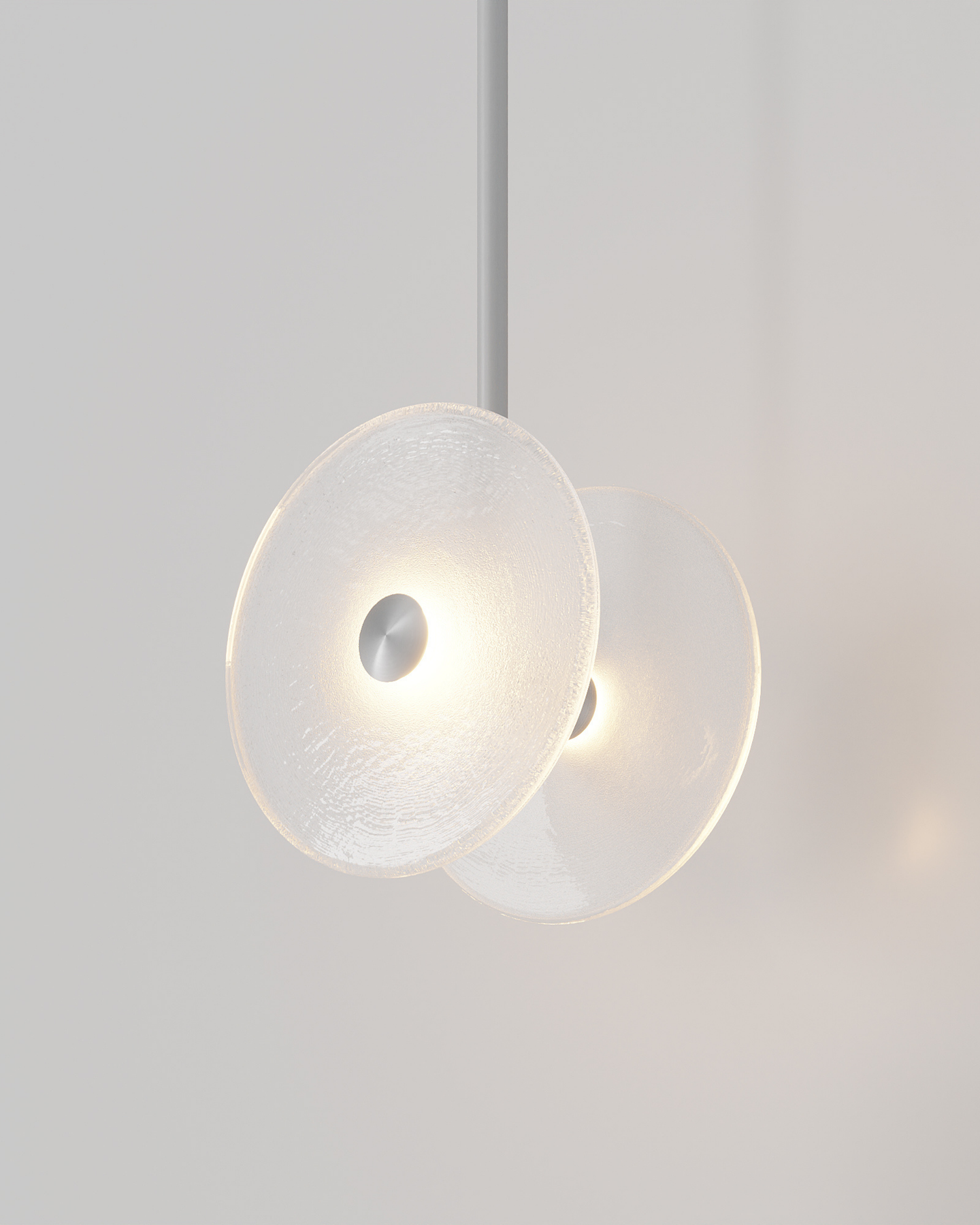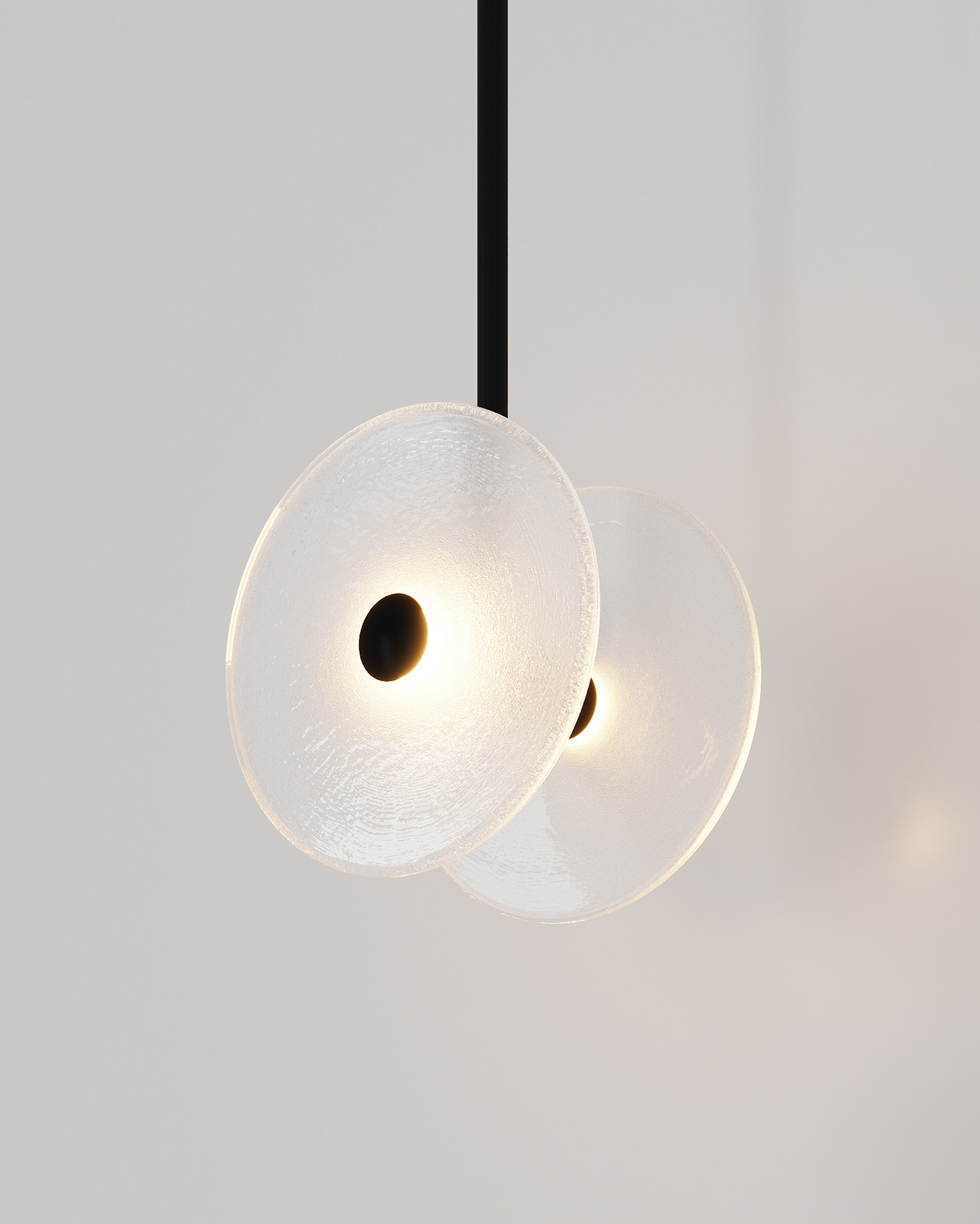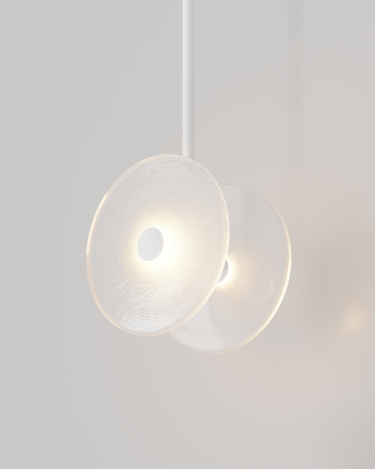 The Coral Duo Suspended Pendant includes two hand-blown glass discs suspended by a rod available in Brass, White, Bronze, Steel and Black. Designed and handmade in Currumbin Australia, by Oliver Höglund and Ryan Roberts. Ideal for illuminating powder rooms and bathrooms. The handmade process of this fitting results in subtle differences, making each pendant aesthetically unique. Install singularly or as a collection for a statement look.