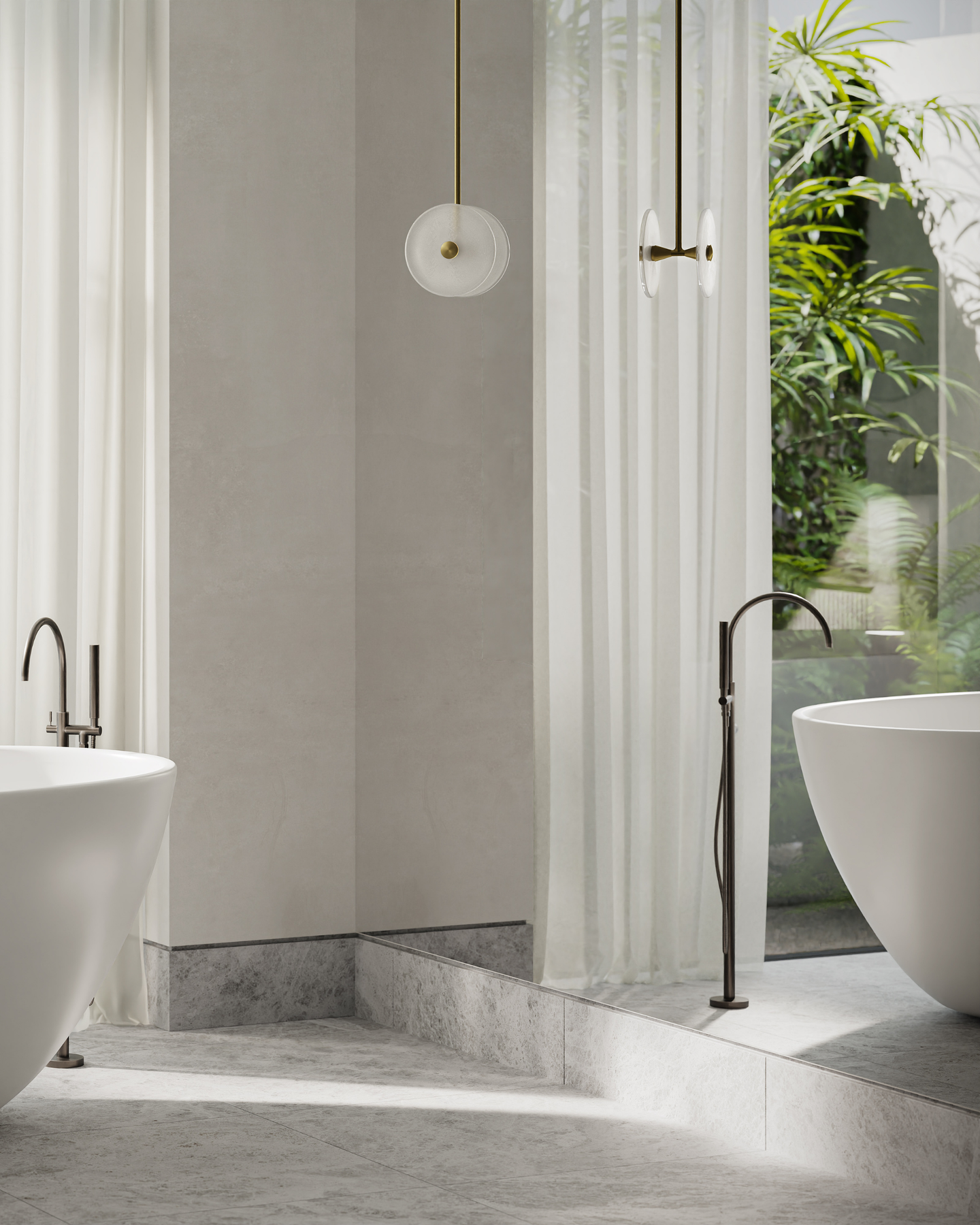 Modern bathroom with freestanding bathtub, shower area, and decorative elements.