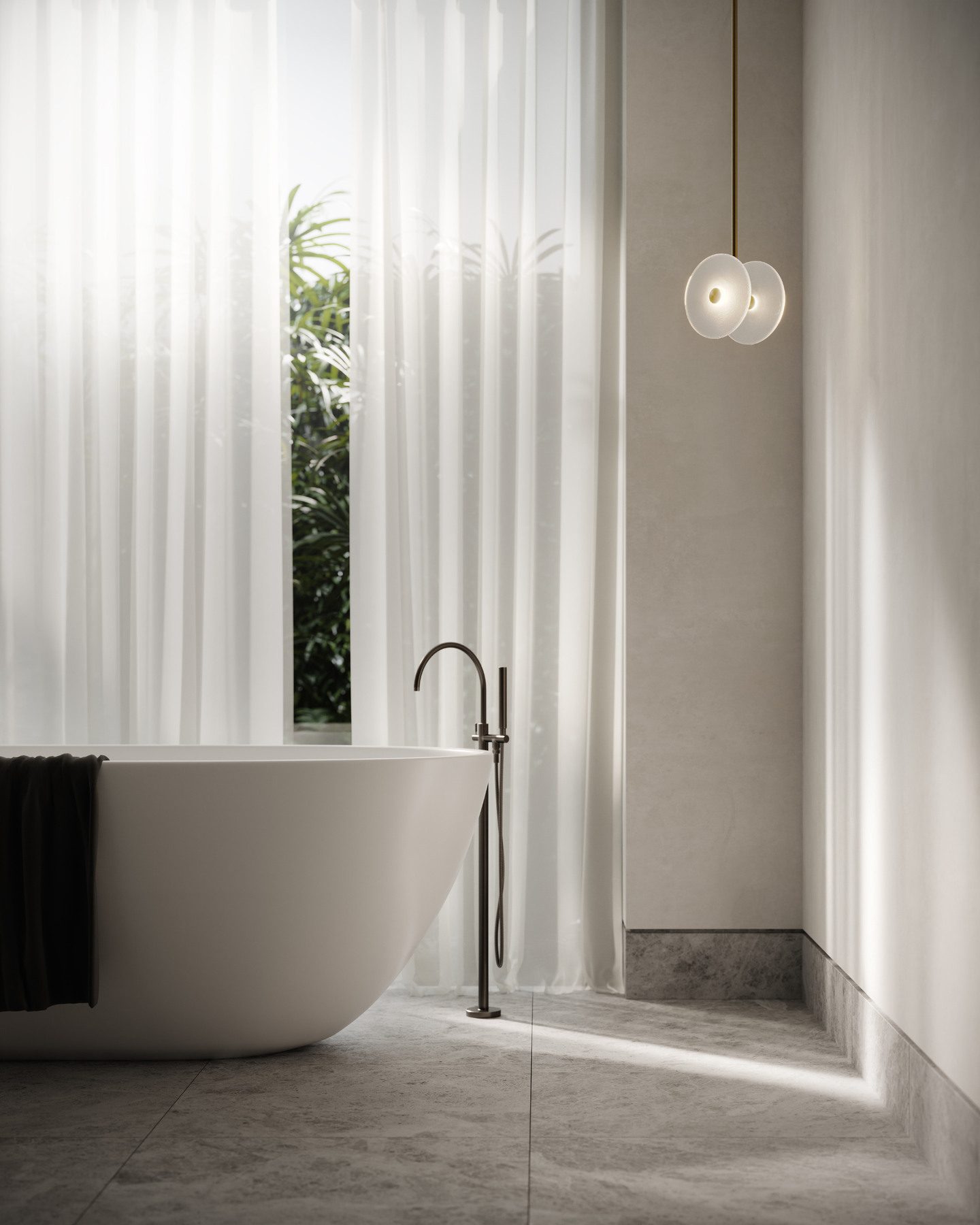 Modern bathroom with a freestanding bathtub, sleek faucet, glass pendant, and large window with white curtains.
