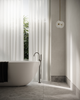 Modern bathroom with a freestanding bathtub, black faucet, and white curtains, with pendant glass.