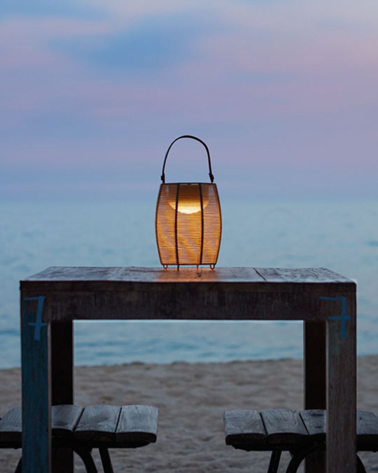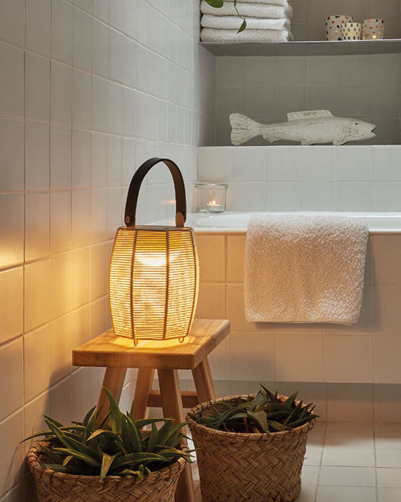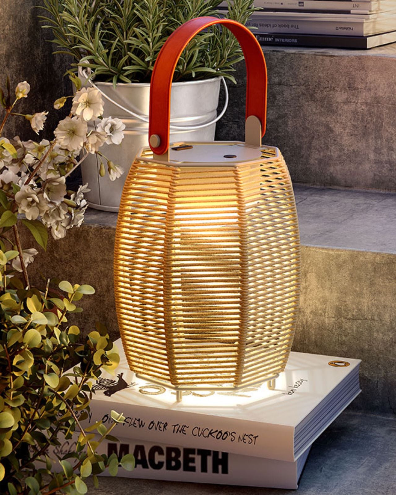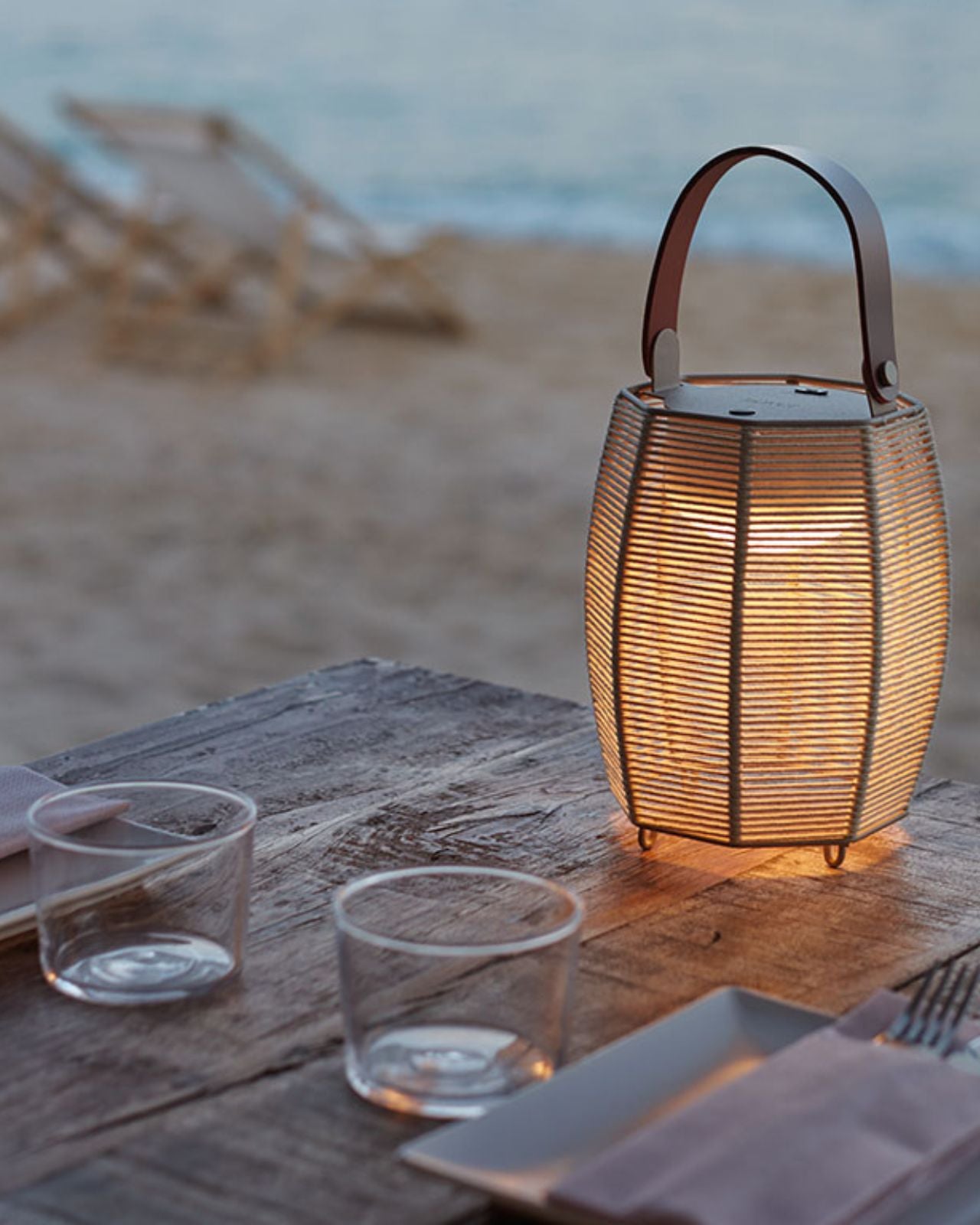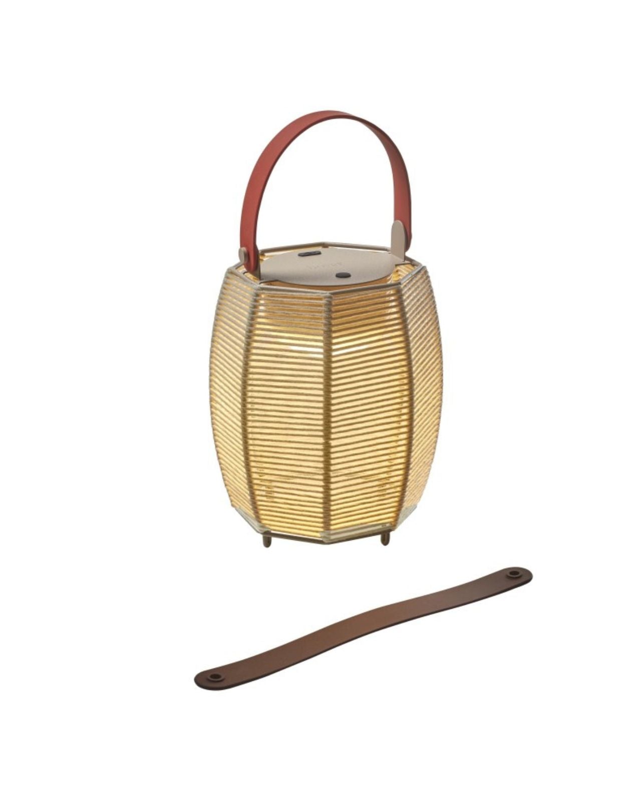 Crafted and designed in Barcelona, the Cotton Shade Portable Lamp is a lightweight fitting, ideal for areas that don't have any hardwired lighting. Featuring an integrated LED that shines through the hand-woven shade made from cotton thread. Suitable for dry outdoor gatherings, restaurant tables, and stairways. Comes with both a terracotta and brown handle for convenient portability.