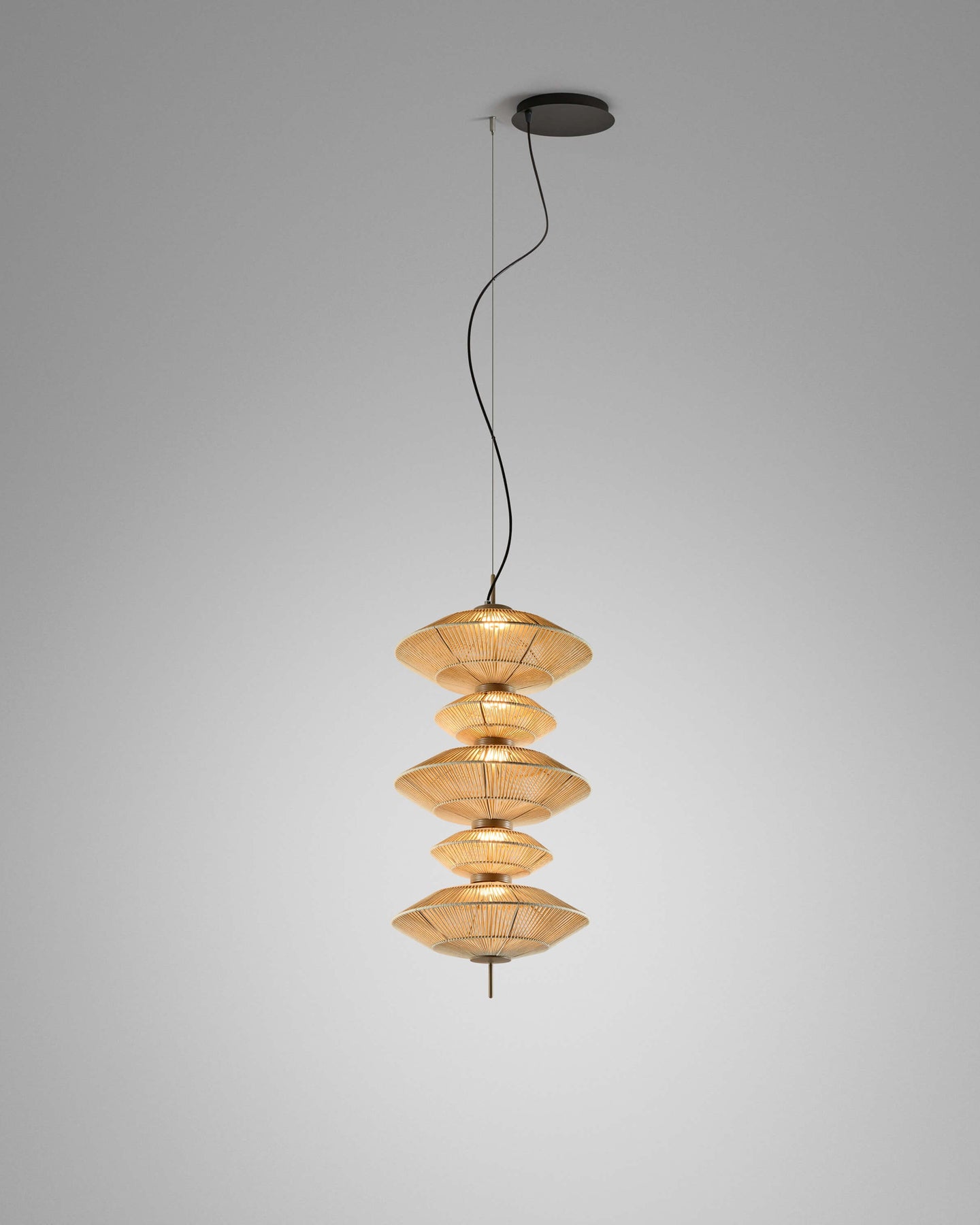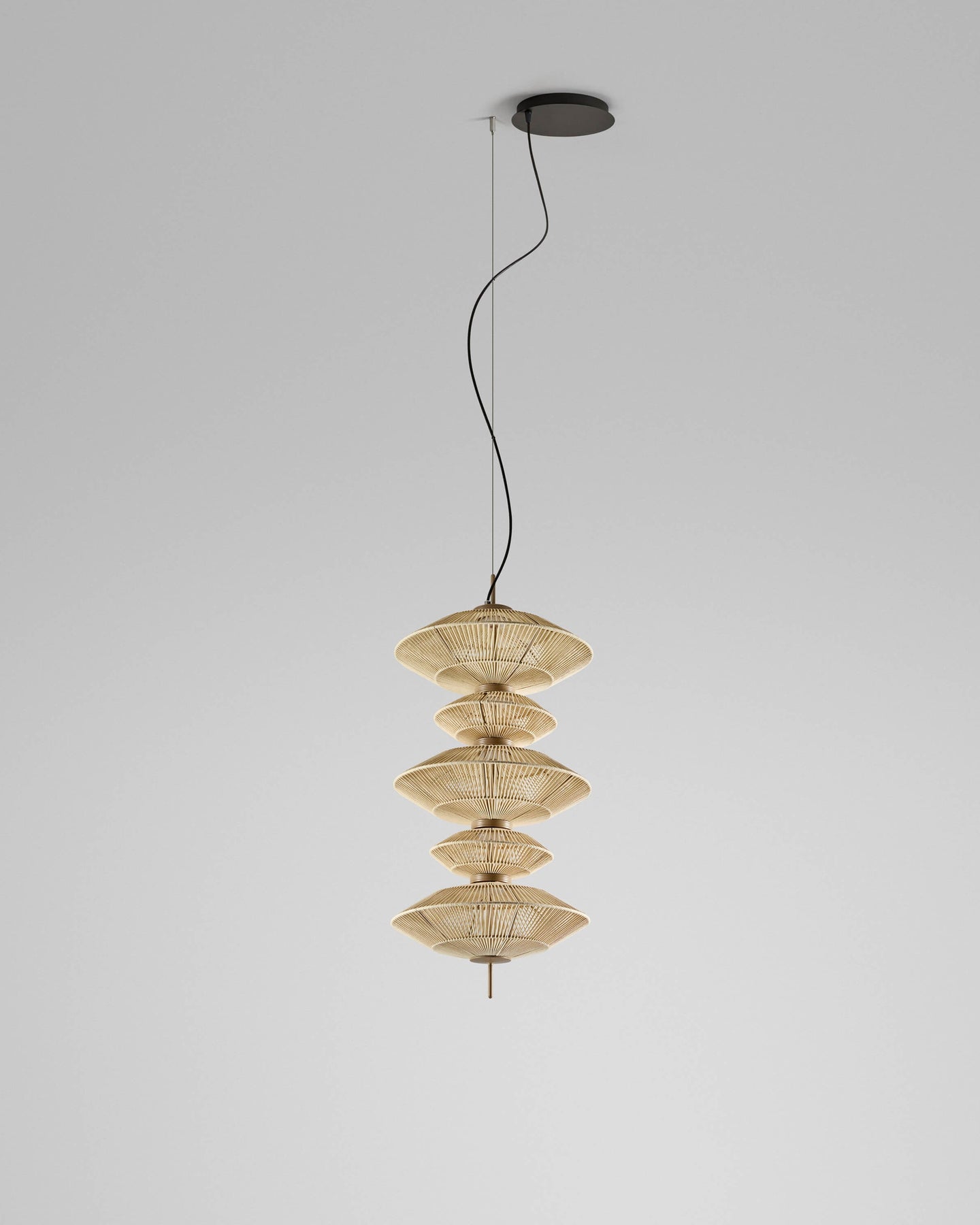 This specific listing features a dynamic composition of five handwoven shades—a curated mix of three large and two small elements—fixed within a single structured drop. Each shade is meticulously crafted by hand-weaving continuous cotton thread into a soft beige finish, offering a warm, organic texture. Designed by Joana Bover and made in Barcelona, this fixture brings an artisanal, multi-tiered character to sophisticated interior voids.