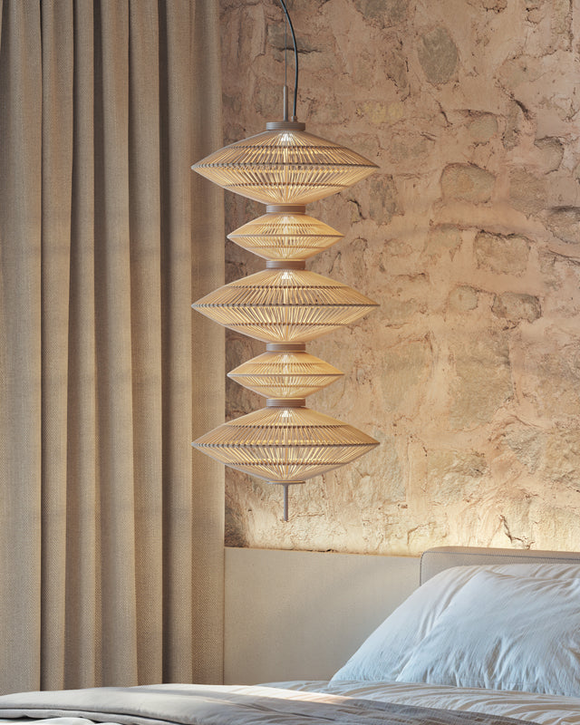 The Cotton Vertical Pendant Light was designed from the need to create striking vertical lighting elements that illuminate spaces with a strong aesthetic impact. Designed specifically to highlight double-height areas, stairwells, or architectural corners, this fixture serves as a sculptural focal point.