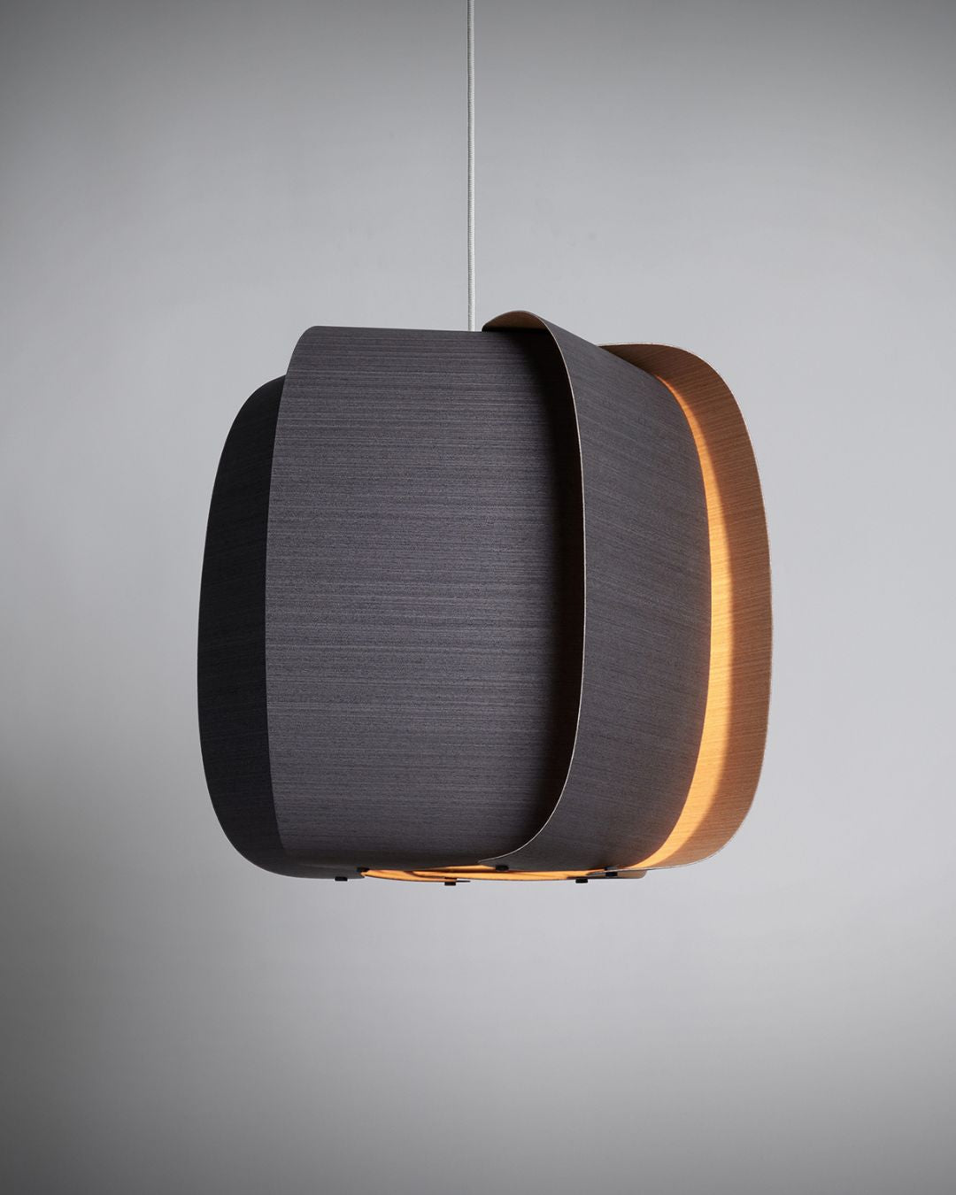Curved Japandi Wood Pendant in large size and ebony finish on grey background