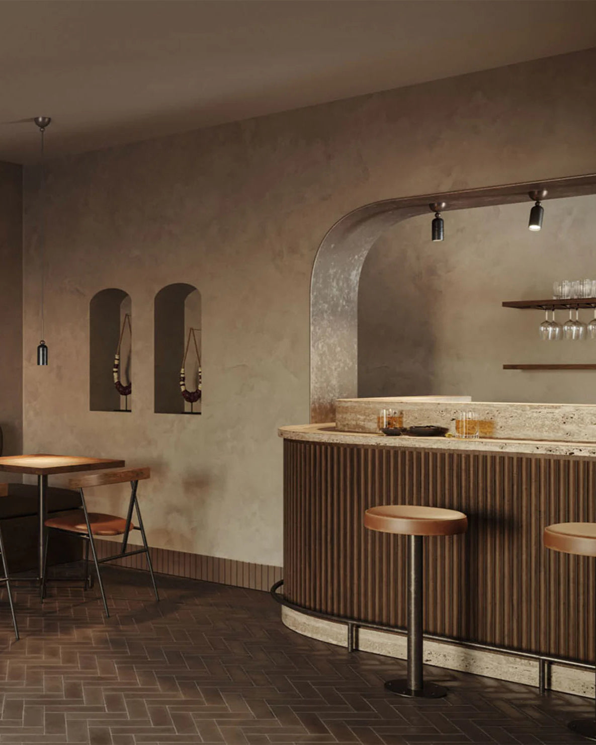Dainty Brass Italian Ceiling Lights illuminating a bar in a beige and brown interior space